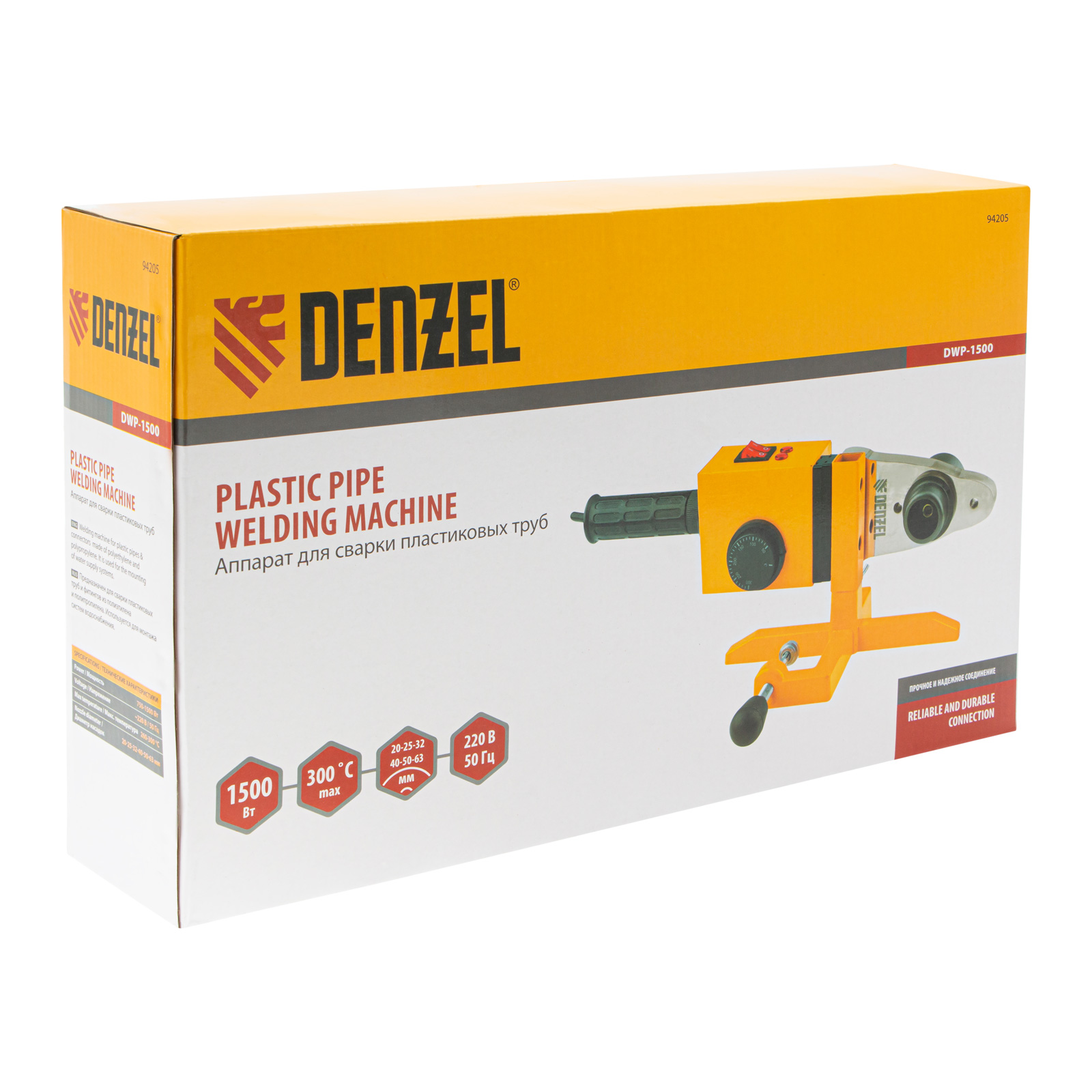 Аппарат для сварки пластиковых труб Denzel DWP-1500 94205 мощностью 1500 Вт предназначен для соединения полипропиленовых и полиэтиленовых труб диаметром 20, 25, 32, 40, 50 и 63 мм при нагреве до 260-300 °C. Незаменим во время ремонта и прокладки систем горячего и холодного водоснабжения, отопления, при проведении сантехнических работ с канализационными трубами и т.д. Питается от однофазной бытовой сети 220 В и имеет простой принцип работы, поэтому оптимален для использования в квартире и частном доме.