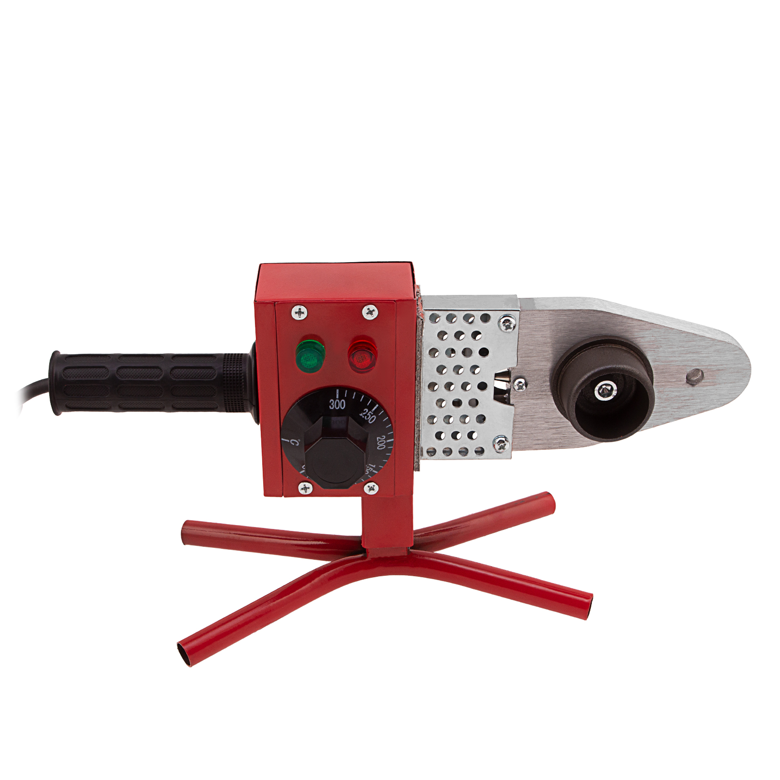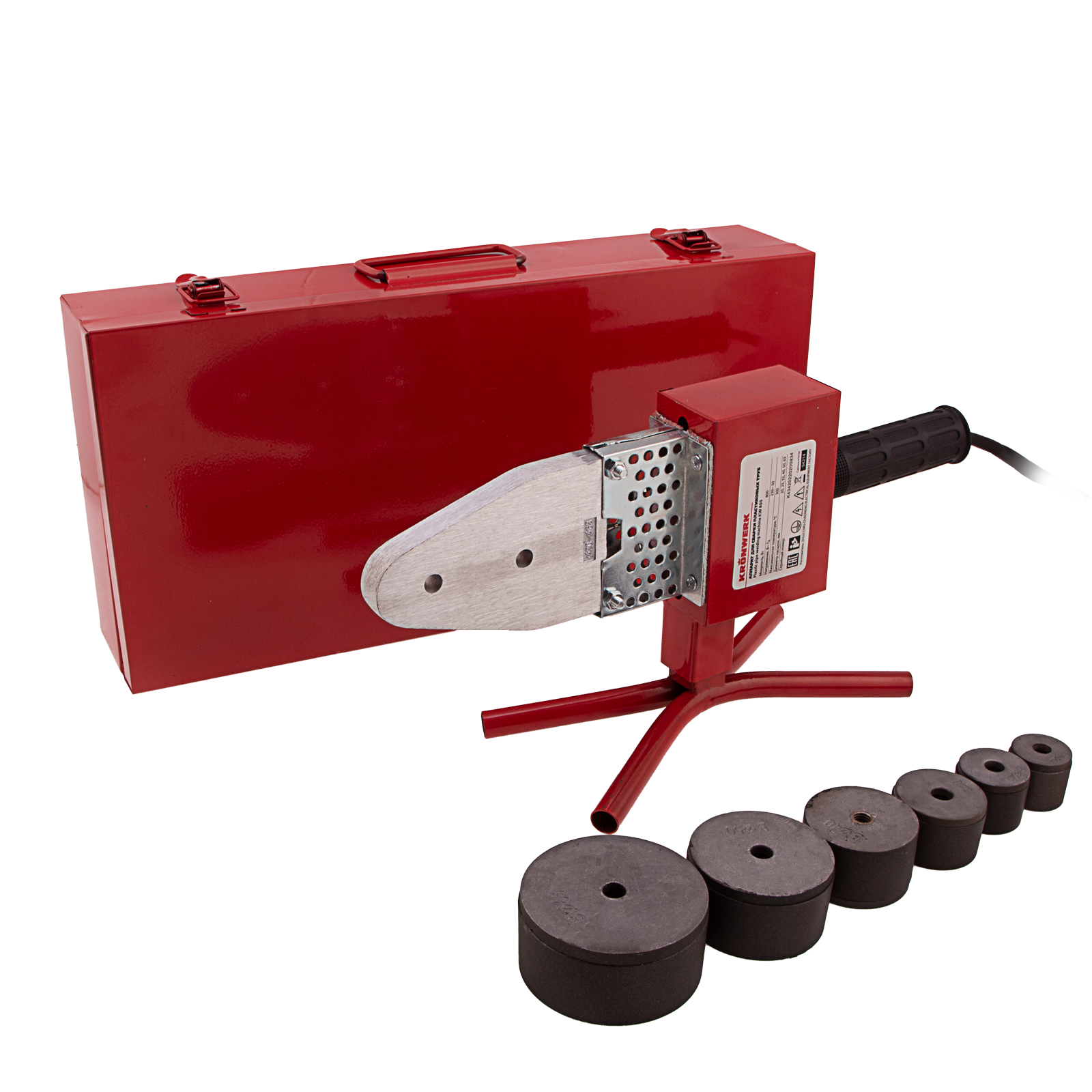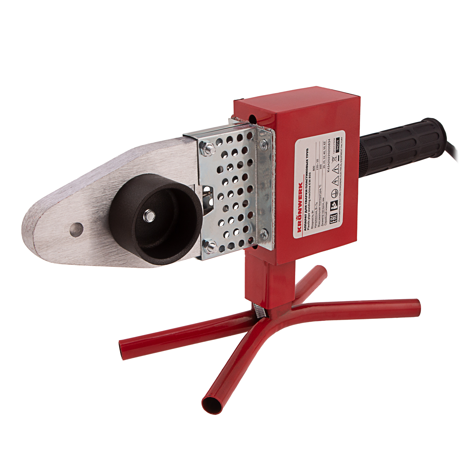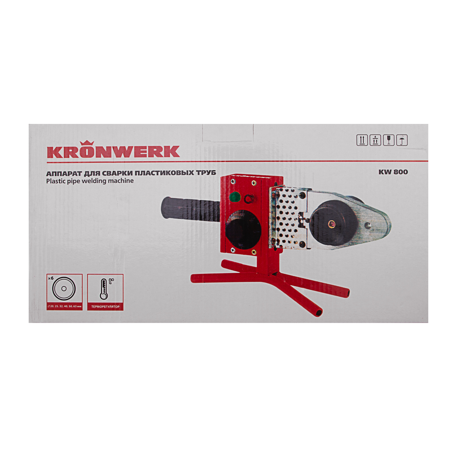 Аппарат для сварки пластиковых труб Kronwerk KW 800 94214 мощностью 800 Вт обеспечивает нагрев до температуры 300 °C и предназначен для работы с полипропиленовыми и полиэтиленовыми трубами диаметром 20, 25, 32, 40, 50 и 63 мм. Питается от однофазной бытовой сети 220 В, удобен для использования в частном доме и квартире. В комплект поставки входит 6 сменных насадок, что позволяет приступить к работе сразу после приобретения аппарата. Он будет полезен как для проведения профилактического ремонта, так и для монтажа систем водопровода, канализации и отопления.