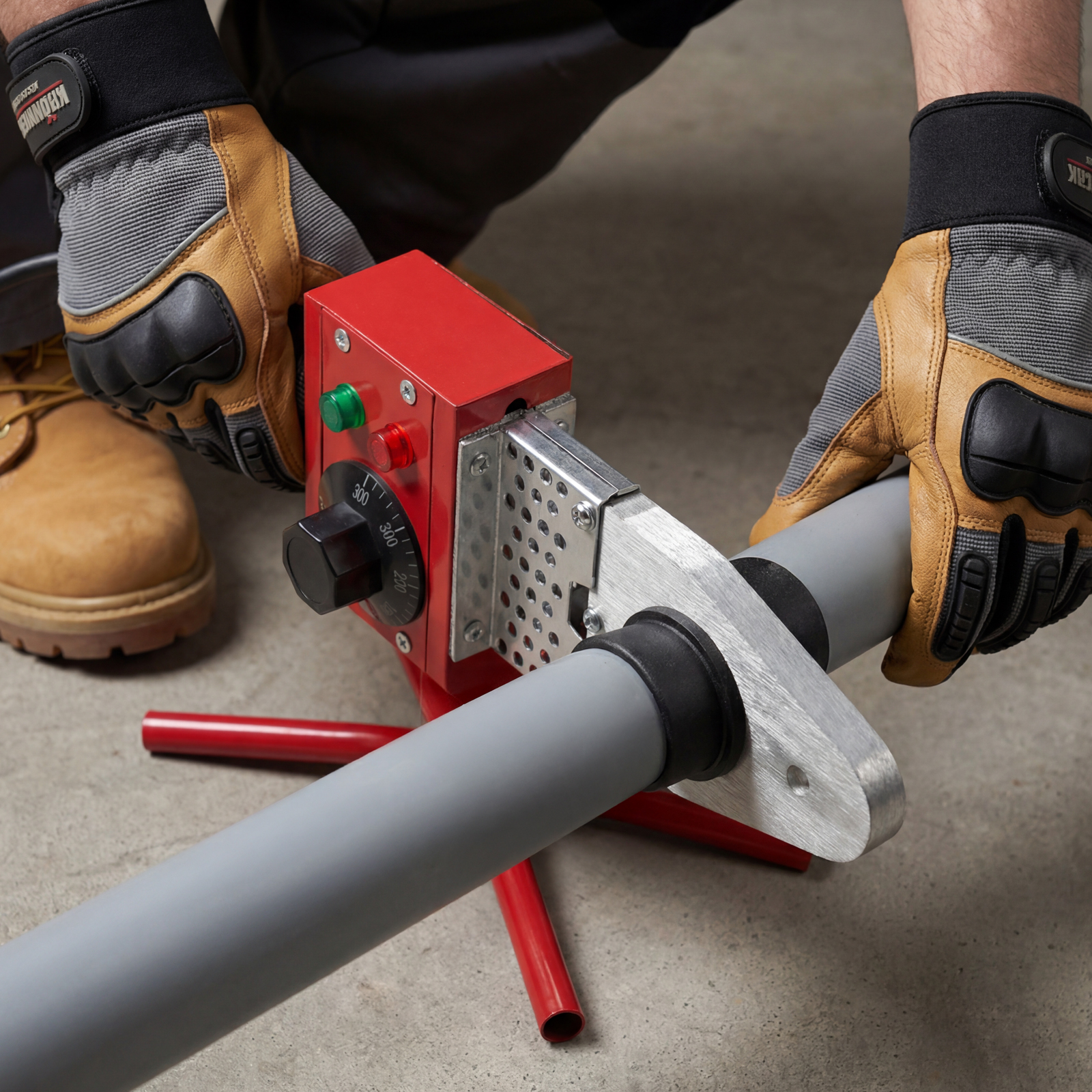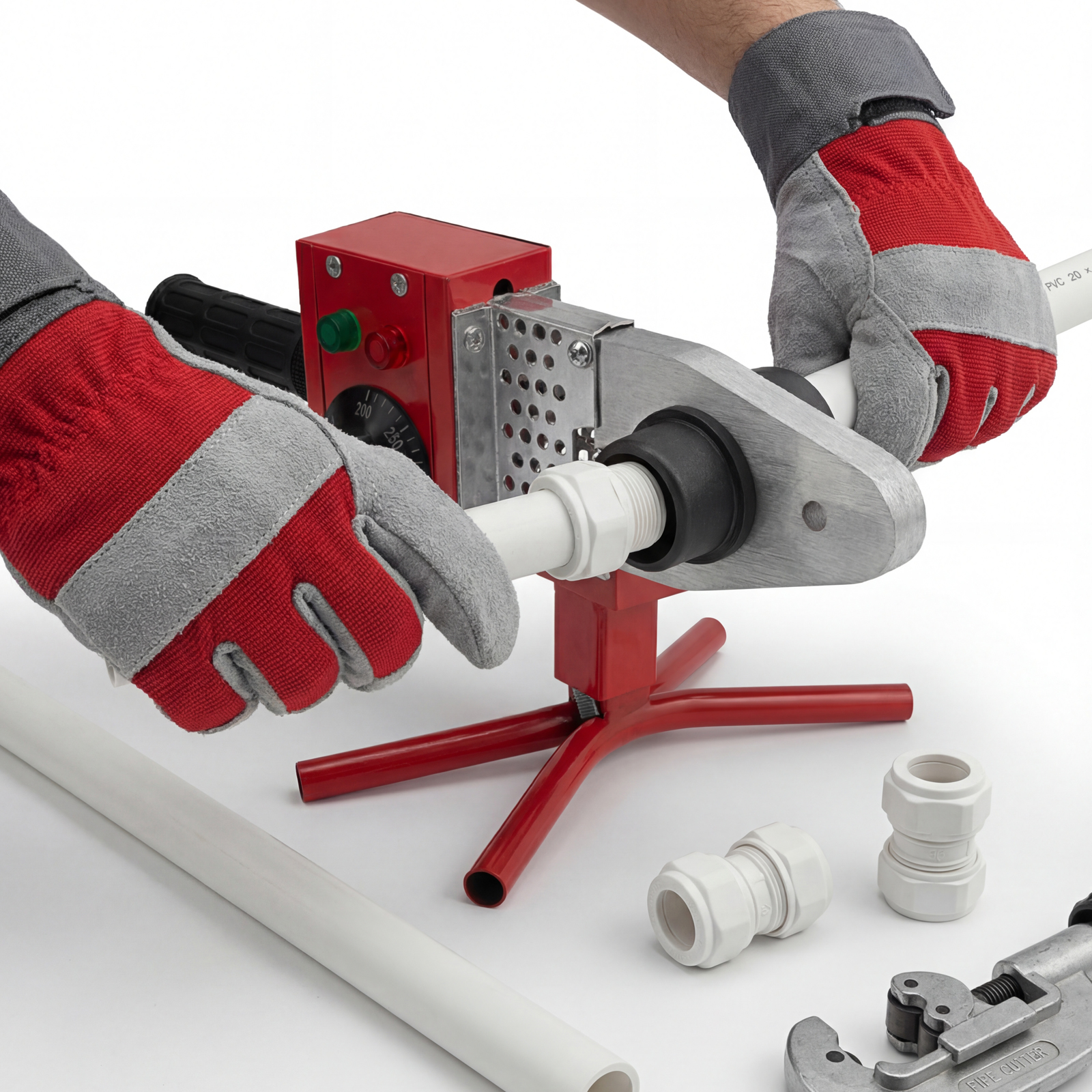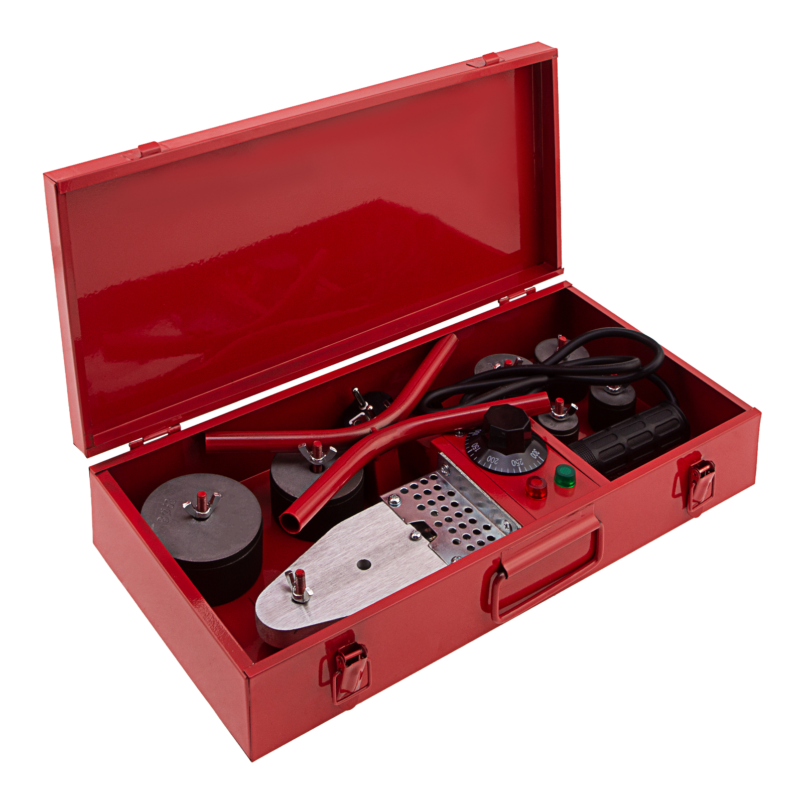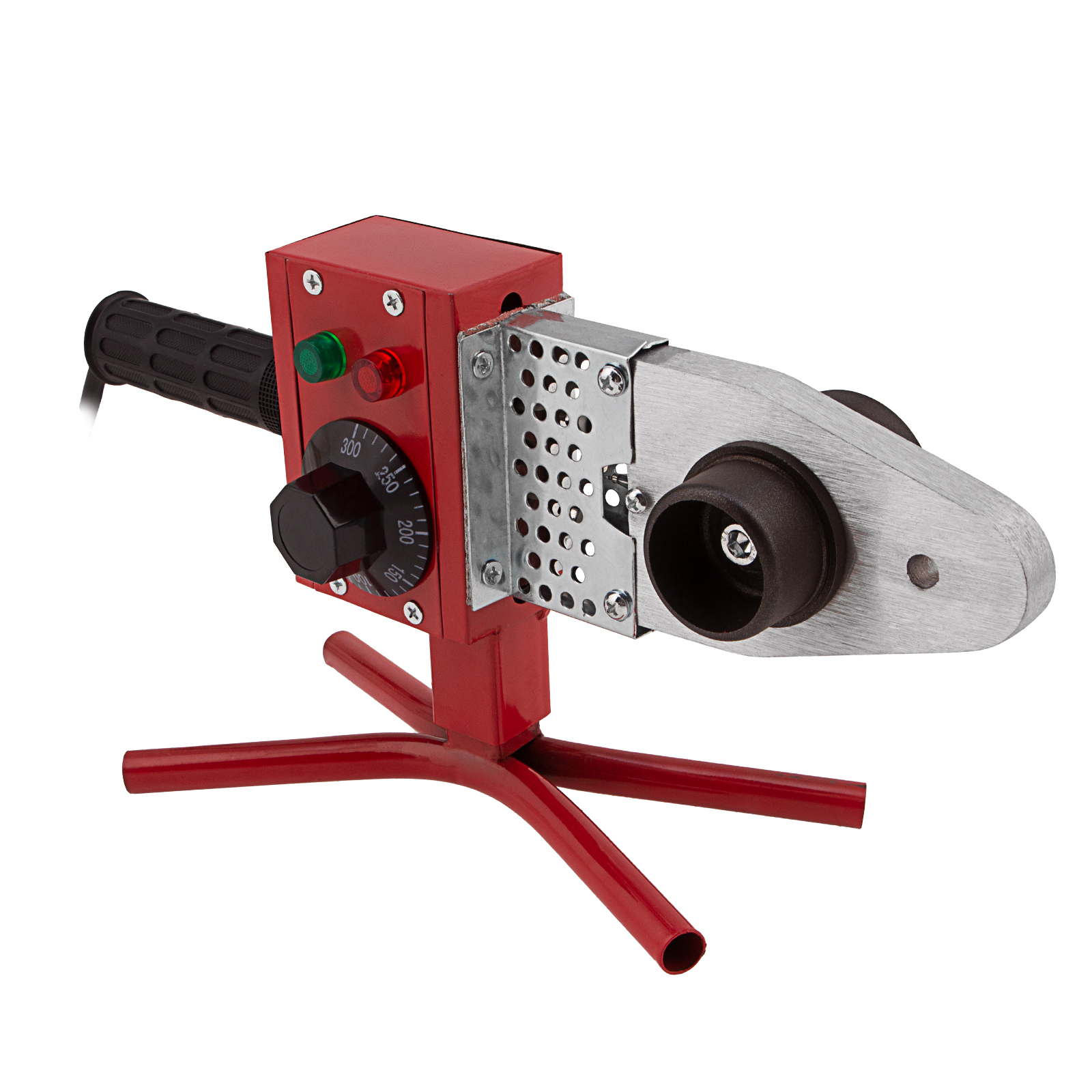 Аппарат для сварки пластиковых труб Kronwerk KW 800 94214 мощностью 800 Вт обеспечивает нагрев до температуры 300 °C и предназначен для работы с полипропиленовыми и полиэтиленовыми трубами диаметром 20, 25, 32, 40, 50 и 63 мм. Питается от однофазной бытовой сети 220 В, удобен для использования в частном доме и квартире. В комплект поставки входит 6 сменных насадок, что позволяет приступить к работе сразу после приобретения аппарата. Он будет полезен как для проведения профилактического ремонта, так и для монтажа систем водопровода, канализации и отопления.