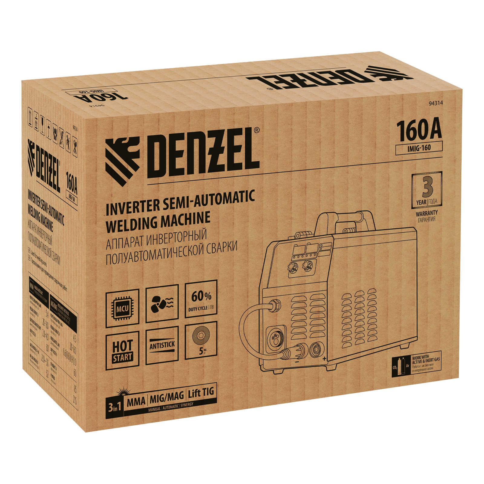 Инверторный аппарат полуавтоматической сварки Denzel IMIG-160 94314 работает со сварочным током до 160 А, характеризуется продолжительностью включения 60% и совместим с катушками до 5 кг. Используется для сварки углеродистых и нержавеющих сталей с использованием постоянного тока. Эффективен для работы с тонкостенными заготовками.,Сварочный аппарат произведен по технологии IGBT, что обеспечивает стабильную и эффективную работу на протяжении длительного времени. Синергетическое управление упрощает работу и позволяет получить сварной шов неизменно высокого качества. Аппарат автоматически подбирает оптимальные значения напряжения, скорости подачи проволоки и другие параметры.