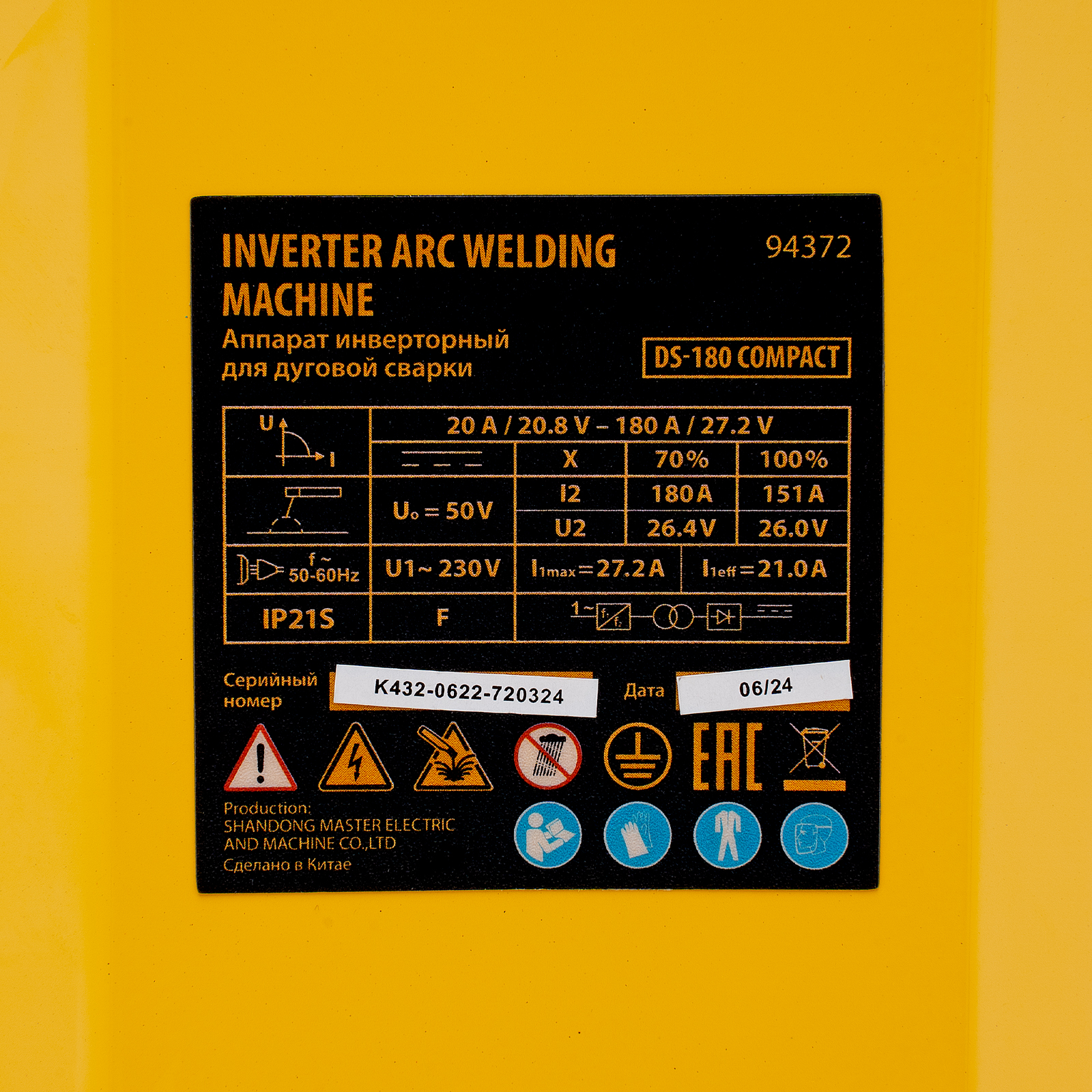 Аппарат инверторный дуговой сварки DS-180 Compact, 180 А, ПВ 70%, диаметр электрода 1.6-4 мм Denzel в Воронеже