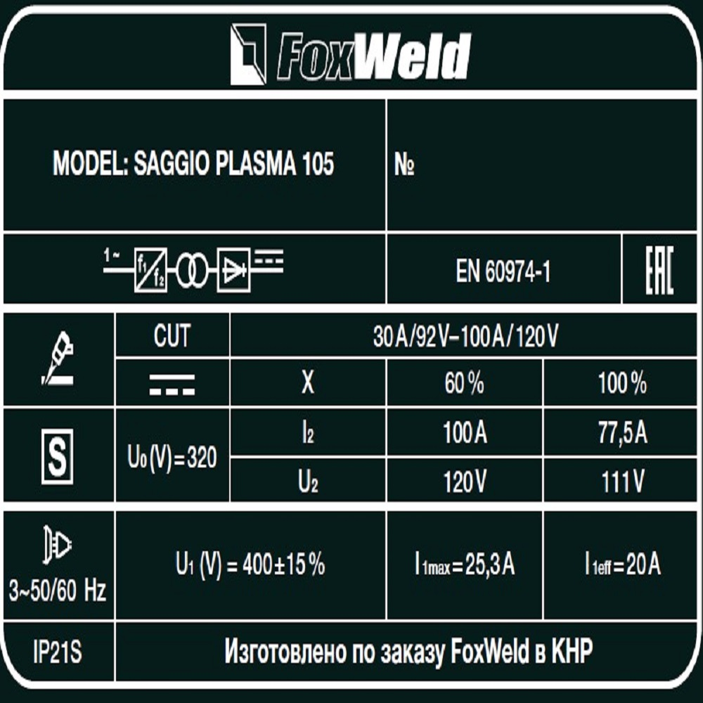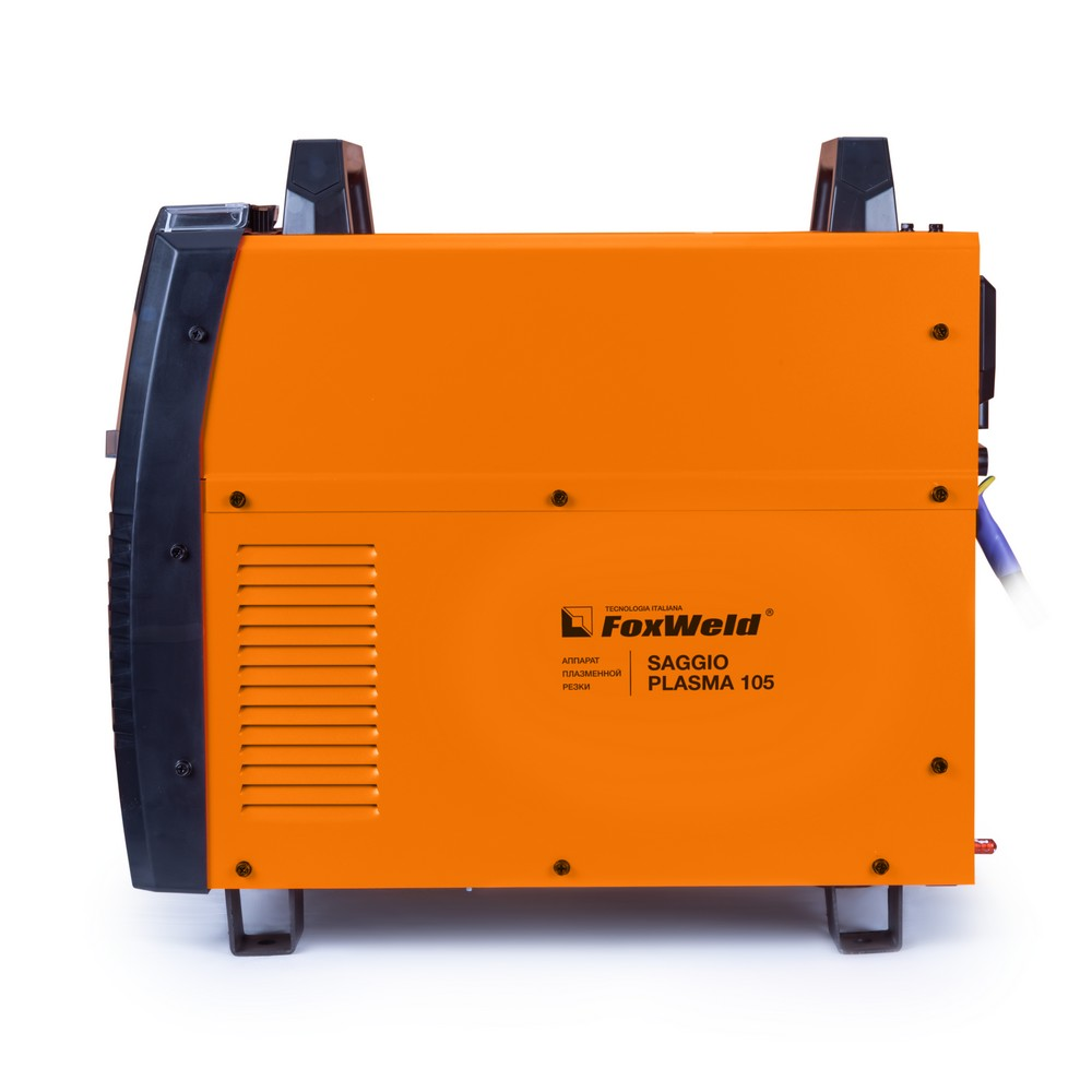 Аппарат плазменной резки FOXWELD SAGGIO PLASMA 105 позволяет разрезать сталь толщиной до 35 мм. SAGGIO PLASMA 105 подходит для резки алюминиевых сплавов, меди, цветных металлов, нержавеющей и углеродистой стали. Дежурная дуга плазмотрона обеспечивает стабильность и удобство, особенно при резке загрязнённых и окрашенных поверхностей. Цифровой дисплей на панели управления отображает установленные значения тока резки. Режимы работы плазмотрона 2Т / 4Т подходят для короткого и длинного реза. Продувка сжатым воздухом после окончания работ с помощью ручки-регулятора увеличивает срок службы комплектующих частей плазмотрона.ДЕЖУРНАЯ ДУГА: Дежурная дуга плазмотрона (PILOT ARC) – это первичная дуга между электродом и соплом, которая направляется за счёт сжатого воздуха к поверхности. В момент контакта с разрезаемым материалом дежурная дуга гаснет и загорается режущая дуга, что обеспечивает «доступ» режущей дуги к основному материалу. Благодаря этому плазменная струя не гаснет даже на металлической сетке. Аппарат с дежурной дугой отлично подойдёт для резки сеток, загрязнённых, окрашенных и перфорированных поверхностей.ТОЛЩИНА РЕЗА ДО 35 ММ: Благодаря высоким динамическим характеристикам дуги, стабильному току резки и наличию дежурной дуги аппарат способен разрезать металл толщиной до 35 мм.РЕЖИМ 2Т / 4Т: Двухтактный режим подходит для короткого реза: при удерживании кнопки на плазмотроне начинается процесс резки, при отпускании – заканчивается. Четырёхтактный режим предназначен для длинного реза: при кратковременном нажатии и отпускании кнопки начинается процесс резки, при повторном кратковременном нажатии и отпускании – заканчивается.ЦИФРОВОЙ ДИСПЛЕЙ: Цифровой дисплей на панели управления отображает установленные значения тока резки.ЗАЩИТА ПЕРЕДНЕЙ ПАНЕЛИ: Прозрачная пластиковая крышка защищает панель управления аппарата от искр, шлака и других воздействий рабочего процесса.ПРЕИМУЩЕСТВА:Цифровой дисплейДежурная дуга плазмотронаРежим работы плазмотрона 2Т / 4ТПостпродувка плазмотронаЗащитная крышка панели управленияФУНКЦИОНАЛЬНЫЕ ОСОБЕННОСТИ:ТАБЛИЦА ПОДБОРА КОМПРЕССОРОВ: В таблице ниже - рекомендации по подбору нужного компрессора.КОМПЛЕКТАЦИЯ: Аппарат плазменной резки SAGGIO PLASMA 105 – 1 шт.; Плазмотрон A-101, 5 м – 1 шт.; Кабель заземления с зажимом, 3 м – 1 шт.; Узел подготовки воздуха со скобой для крепления – 1 шт.; Штуцер для подсоединения узла подготовки воздуха – 2 шт.; Газовый шланг, 2,4 м – 1 шт.; Насадка пружинная – 1 шт.; Катод – 2 шт.; Сопло 1,4 – 2 шт.; Изолятор – 1 шт.; Хомут – 4 шт.; ФУМ-лента – 1 шт.; Инструкция + гарантийный талон – 1 компл.
