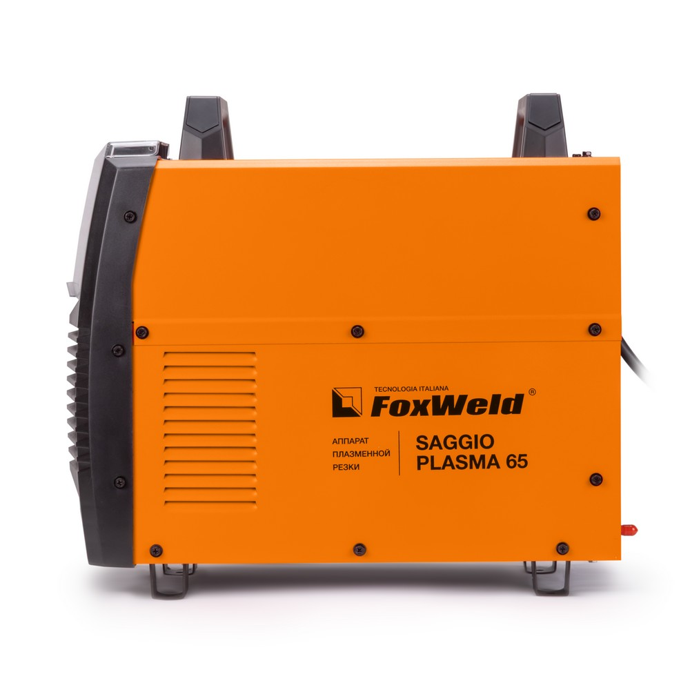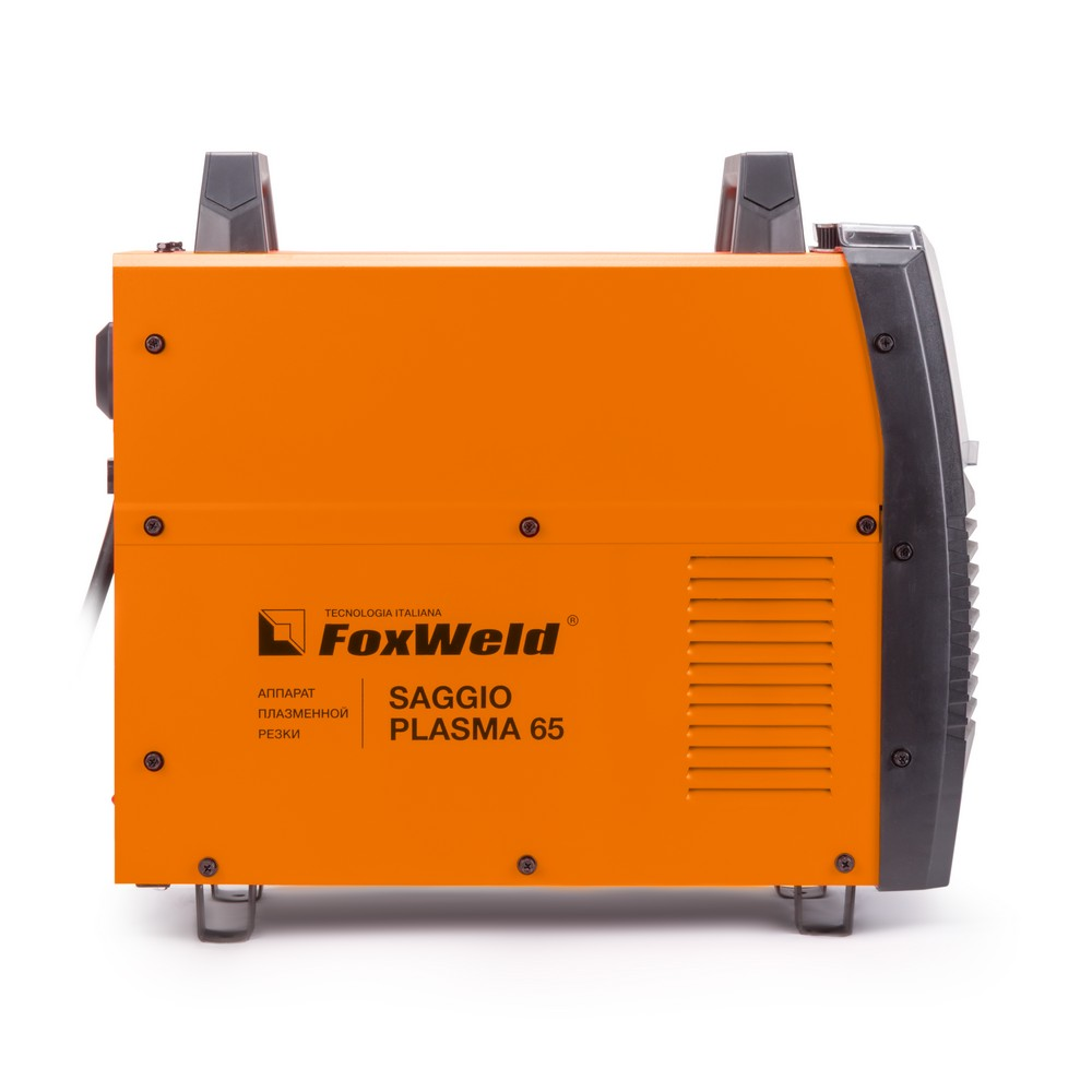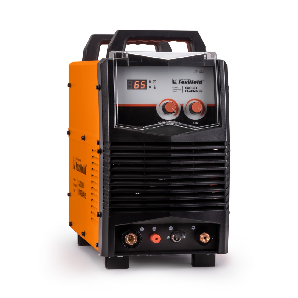 Аппарат плазменной резки FOXWELD SAGGIO PLASMA 65 позволяет разрезать сталь толщиной до 25 мм. SAGGIO PLASMA 65 подходит для резки алюминиевых сплавов, меди, цветных металлов, нержавеющей и углеродистой стали. Дежурная дуга плазмотрона обеспечивает стабильность и удобство, особенно при резке загрязнённых и окрашенных поверхностей. Цифровой дисплей на панели управления отображает установленные значения тока резки. Продувка сжатым воздухом после окончания работ с помощью ручки-регулятора увеличивает срок службы комплектующих частей плазмотрона. Аппарат может работать от сети 230 и 400 В. Такая универсальность увеличивает эффективность (ток реза, расход электроэнергии).ДЕЖУРНАЯ ДУГА: Дежурная дуга плазмотрона (PILOT ARC) – это первичная дуга между электродом и соплом, которая направляется за счёт сжатого воздуха к поверхности. В момент контакта с разрезаемым материалом дежурная дуга гаснет и загорается режущая дуга, что обеспечивает «доступ» режущей дуги к основному материалу. Благодаря этому плазменная струя не гаснет даже на металлической сетке. Аппарат с дежурной дугой отлично подойдёт для резки сеток, загрязнённых, окрашенных и перфорированных поверхностей.ТОЛЩИНА РЕЗА ДО 25 ММ: Благодаря высоким динамическим характеристикам дуги, стабильному току резки и наличию дежурной дуги аппарат способен разрезать металл толщиной до 25 мм.ПОДКЛЮЧЕНИЕ 230 / 400 В: Данный аппарат может работать при напряжении 230 и 400 вольт. Подключение к сети питания 400 вольт увеличивает эффективность аппарата плазменной резки (ток реза, расход электроэнергии).ЦИФРОВОЙ ДИСПЛЕЙ: Цифровой дисплей на панели управления отображает установленные значения тока резки.ЗАЩИТА ПЕРЕДНЕЙ ПАНЕЛИ: Прозрачная пластиковая крышка защищает панель управления аппарата от искр, шлака и других воздействий рабочего процесса.ПРЕИМУЩЕСТВА:Цифровой дисплейДежурная дуга плазмотронаЗащита от перегреваПостпродувка плазмотронаЗащитная крышка панели управленияФУНКЦИОНАЛЬНЫЕ ОСОБЕННОСТИ:ТАБЛИЦА ПОДБОРА КОМПРЕССОРОВ: В таблице ниже - рекомендации по подбору нужного компрессора.КОМПЛЕКТАЦИЯ: Аппарат плазменной резки SAGGIO PLASMA 65 –  1 шт.; Плазмотрон P-80, 4 м –  1 шт.; Кабель заземления с зажимом, 3 м –  1 шт.; Узел подготовки воздуха со скобой для крепления –  1 шт.; Штуцер для подсоединения узла подготовки воздуха –  2 шт.; Газовый шланг, 2,4 м – 1 шт.; Насадка пружинная – 1 шт.; Катод –  2 шт.; Сопло – 2 шт.; Роликовая насадка –  1шт.; Хомут – 4 шт.; Инструкция – 1 шт.; Гарантийный талон – 1 шт.