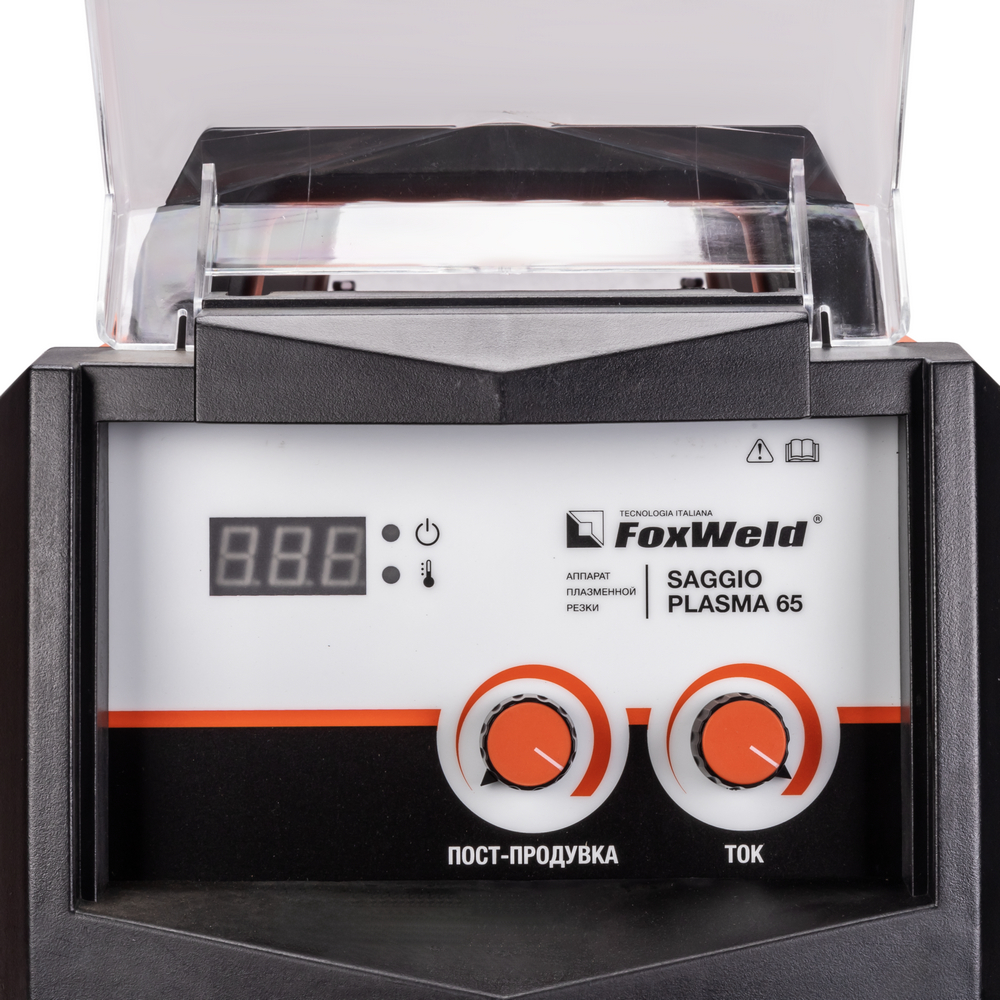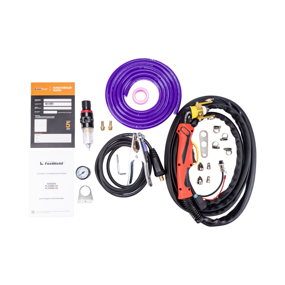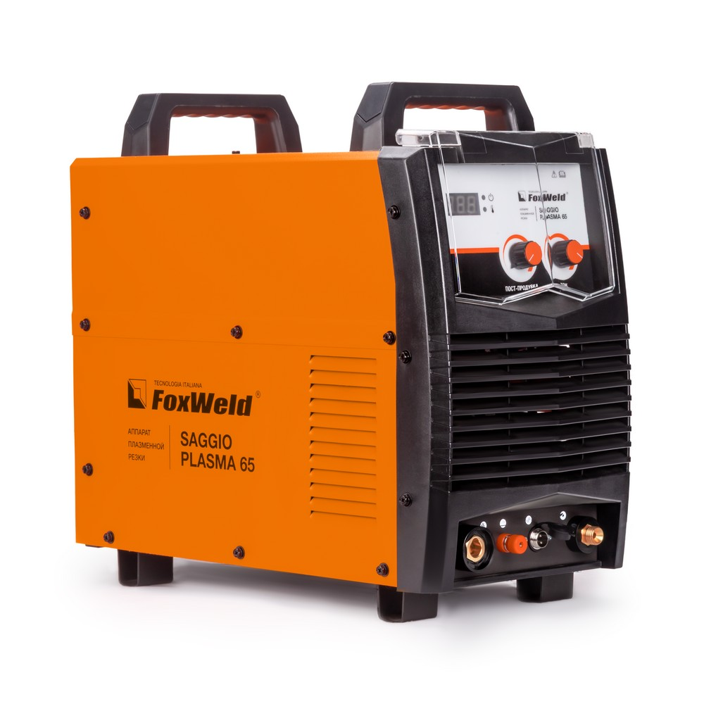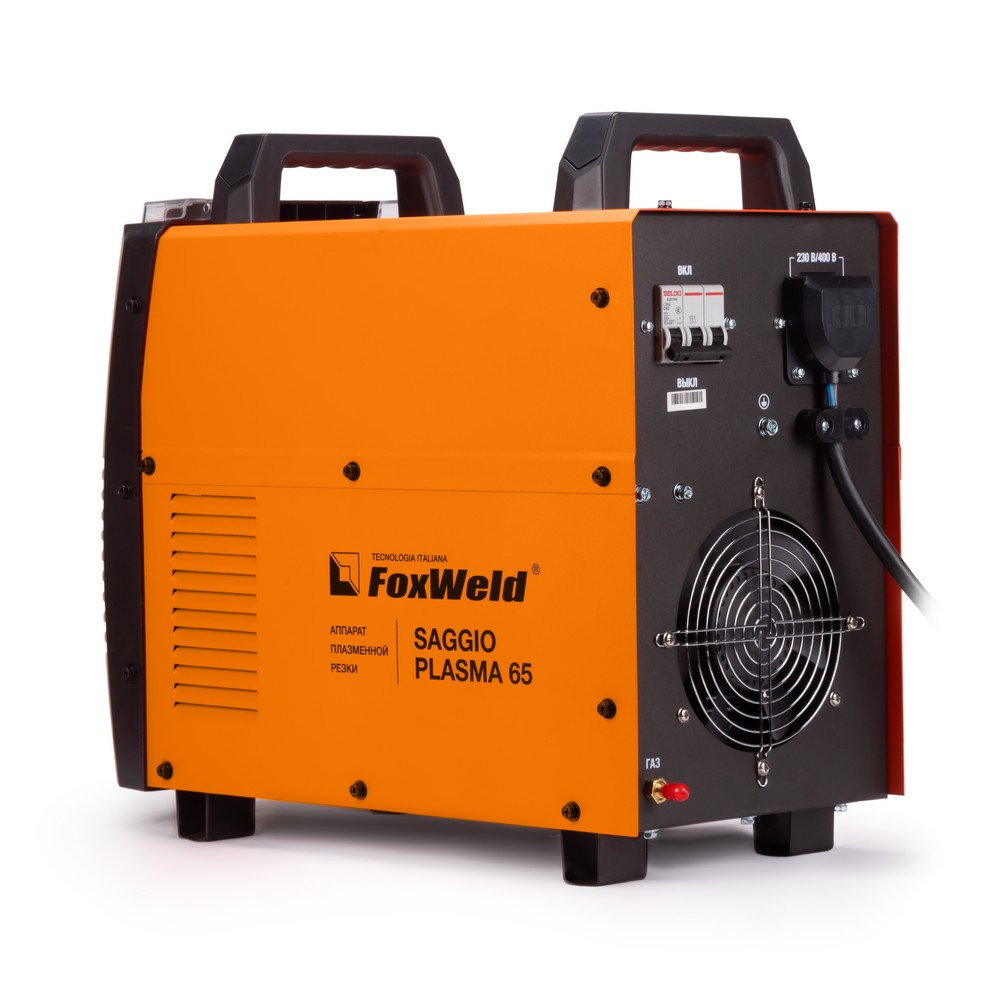 Аппарат плазменной резки FOXWELD SAGGIO PLASMA 65 позволяет разрезать сталь толщиной до 25 мм. SAGGIO PLASMA 65 подходит для резки алюминиевых сплавов, меди, цветных металлов, нержавеющей и углеродистой стали. Дежурная дуга плазмотрона обеспечивает стабильность и удобство, особенно при резке загрязнённых и окрашенных поверхностей. Цифровой дисплей на панели управления отображает установленные значения тока резки. Продувка сжатым воздухом после окончания работ с помощью ручки-регулятора увеличивает срок службы комплектующих частей плазмотрона. Аппарат может работать от сети 230 и 400 В. Такая универсальность увеличивает эффективность (ток реза, расход электроэнергии).ДЕЖУРНАЯ ДУГА: Дежурная дуга плазмотрона (PILOT ARC) – это первичная дуга между электродом и соплом, которая направляется за счёт сжатого воздуха к поверхности. В момент контакта с разрезаемым материалом дежурная дуга гаснет и загорается режущая дуга, что обеспечивает «доступ» режущей дуги к основному материалу. Благодаря этому плазменная струя не гаснет даже на металлической сетке. Аппарат с дежурной дугой отлично подойдёт для резки сеток, загрязнённых, окрашенных и перфорированных поверхностей.ТОЛЩИНА РЕЗА ДО 25 ММ: Благодаря высоким динамическим характеристикам дуги, стабильному току резки и наличию дежурной дуги аппарат способен разрезать металл толщиной до 25 мм.ПОДКЛЮЧЕНИЕ 230 / 400 В: Данный аппарат может работать при напряжении 230 и 400 вольт. Подключение к сети питания 400 вольт увеличивает эффективность аппарата плазменной резки (ток реза, расход электроэнергии).ЦИФРОВОЙ ДИСПЛЕЙ: Цифровой дисплей на панели управления отображает установленные значения тока резки.ЗАЩИТА ПЕРЕДНЕЙ ПАНЕЛИ: Прозрачная пластиковая крышка защищает панель управления аппарата от искр, шлака и других воздействий рабочего процесса.ПРЕИМУЩЕСТВА:Цифровой дисплейДежурная дуга плазмотронаЗащита от перегреваПостпродувка плазмотронаЗащитная крышка панели управленияФУНКЦИОНАЛЬНЫЕ ОСОБЕННОСТИ:ТАБЛИЦА ПОДБОРА КОМПРЕССОРОВ: В таблице ниже - рекомендации по подбору нужного компрессора.КОМПЛЕКТАЦИЯ: Аппарат плазменной резки SAGGIO PLASMA 65 –  1 шт.; Плазмотрон P-80, 4 м –  1 шт.; Кабель заземления с зажимом, 3 м –  1 шт.; Узел подготовки воздуха со скобой для крепления –  1 шт.; Штуцер для подсоединения узла подготовки воздуха –  2 шт.; Газовый шланг, 2,4 м – 1 шт.; Насадка пружинная – 1 шт.; Катод –  2 шт.; Сопло – 2 шт.; Роликовая насадка –  1шт.; Хомут – 4 шт.; Инструкция – 1 шт.; Гарантийный талон – 1 шт.