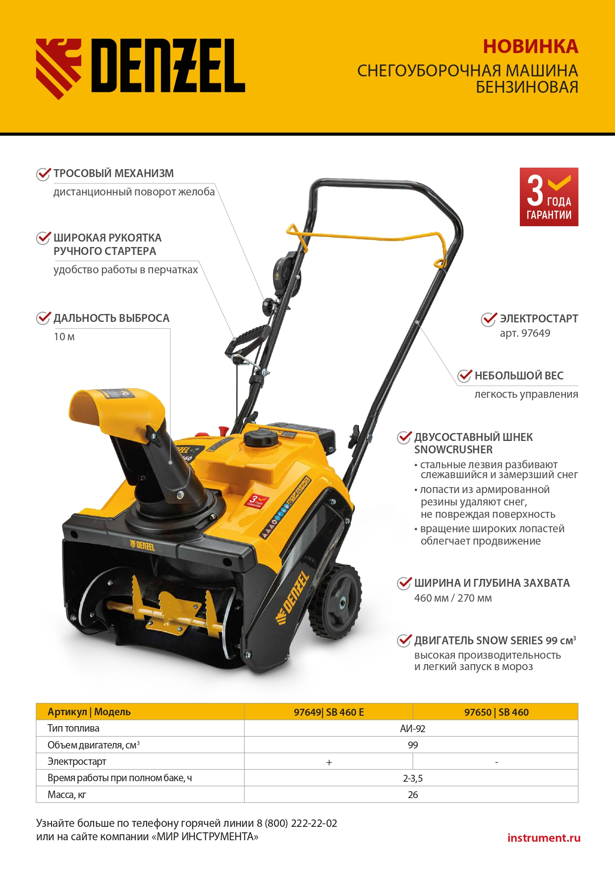 Бензиновая снегоуборочная машина SB 460, 99cc, ручной старт Denzel в Воронеже