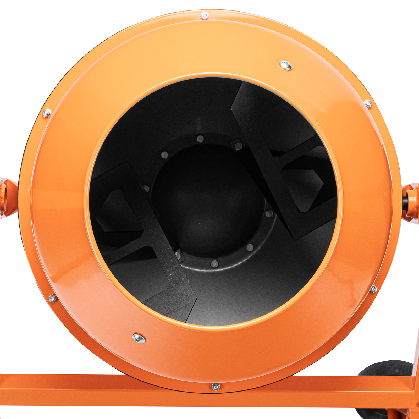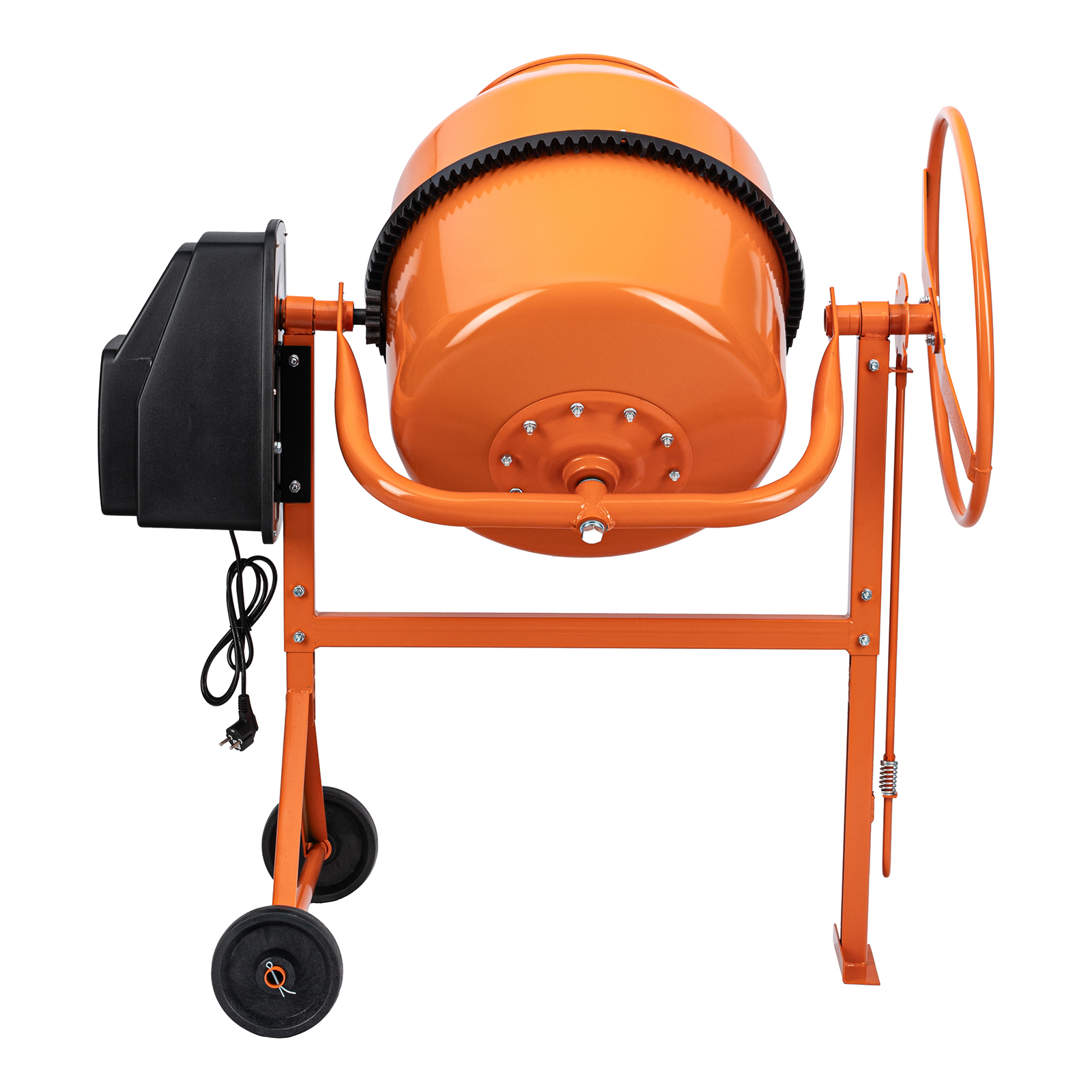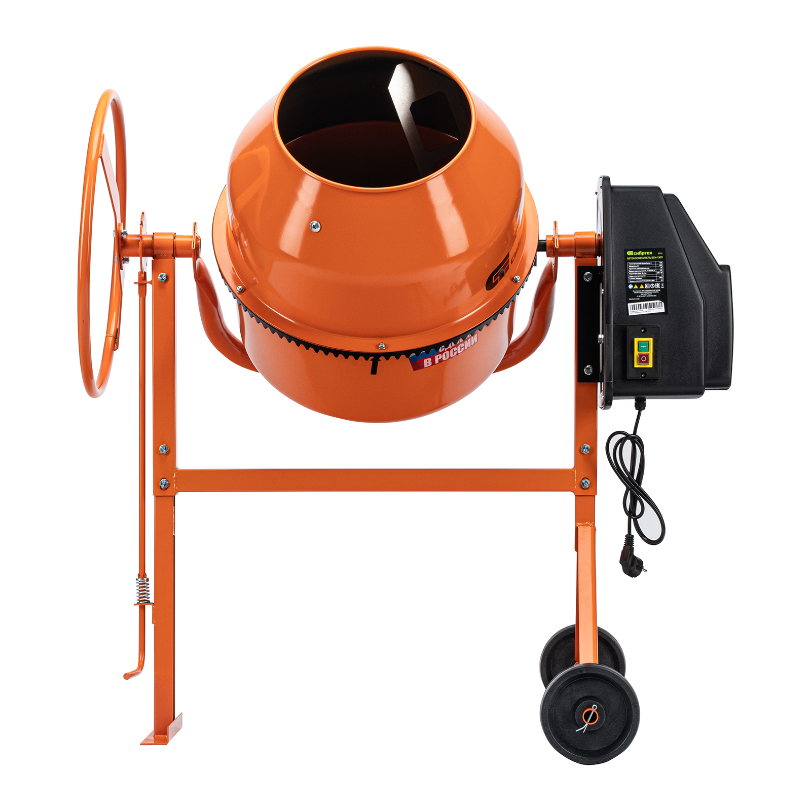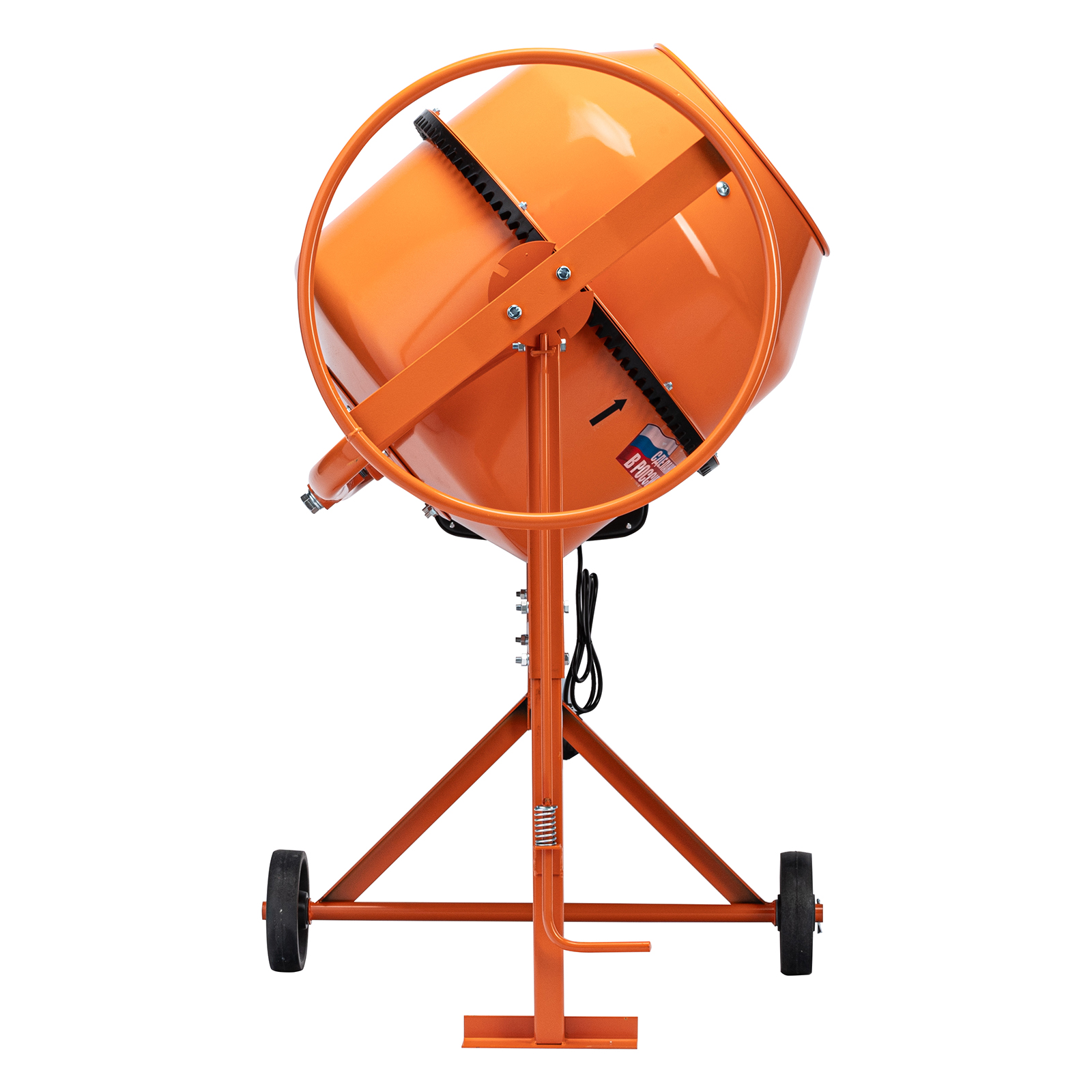 - Удобная загрузка и выгрузка смеси — барабан наклоняется при помощи маховика и легко фиксируется в нужном положении.