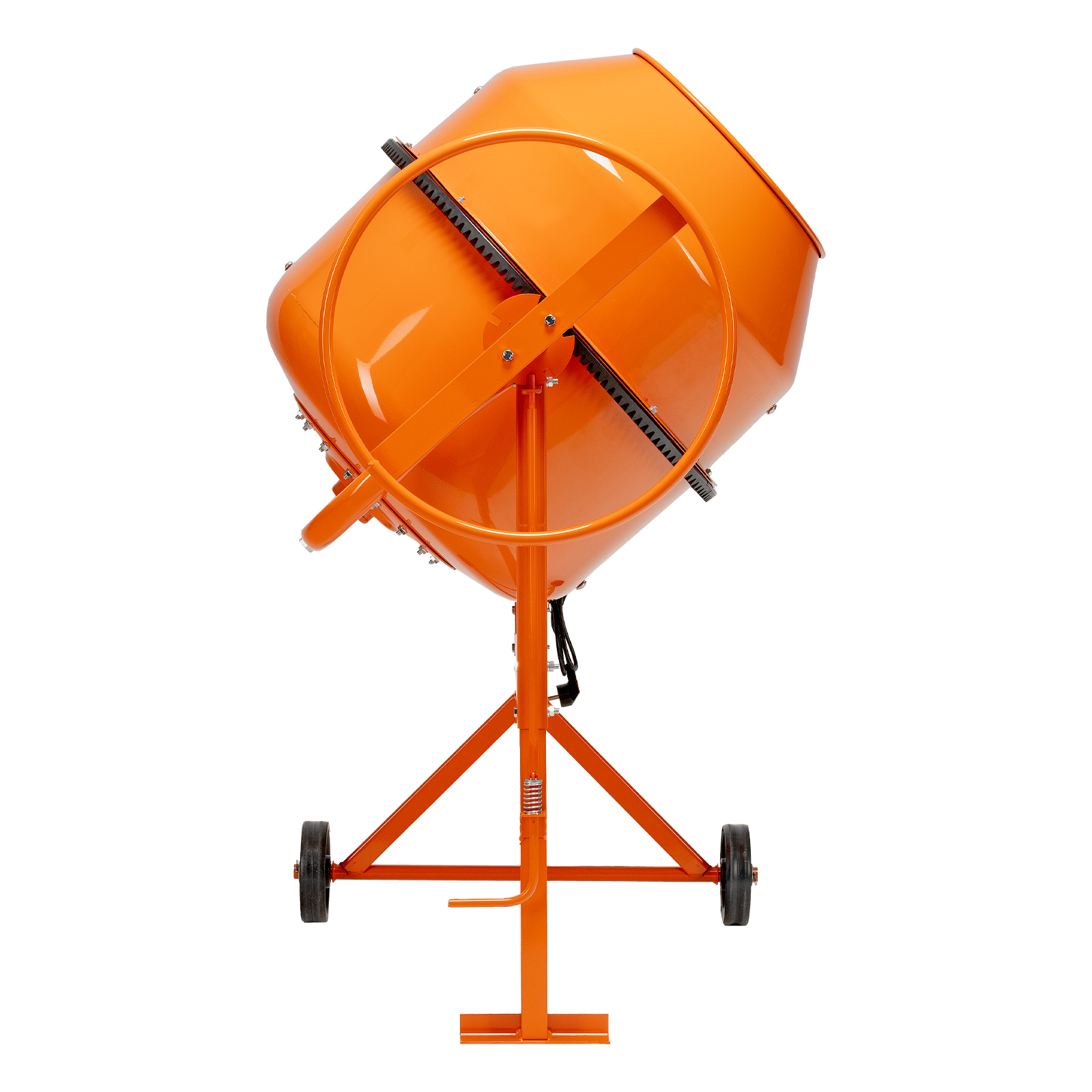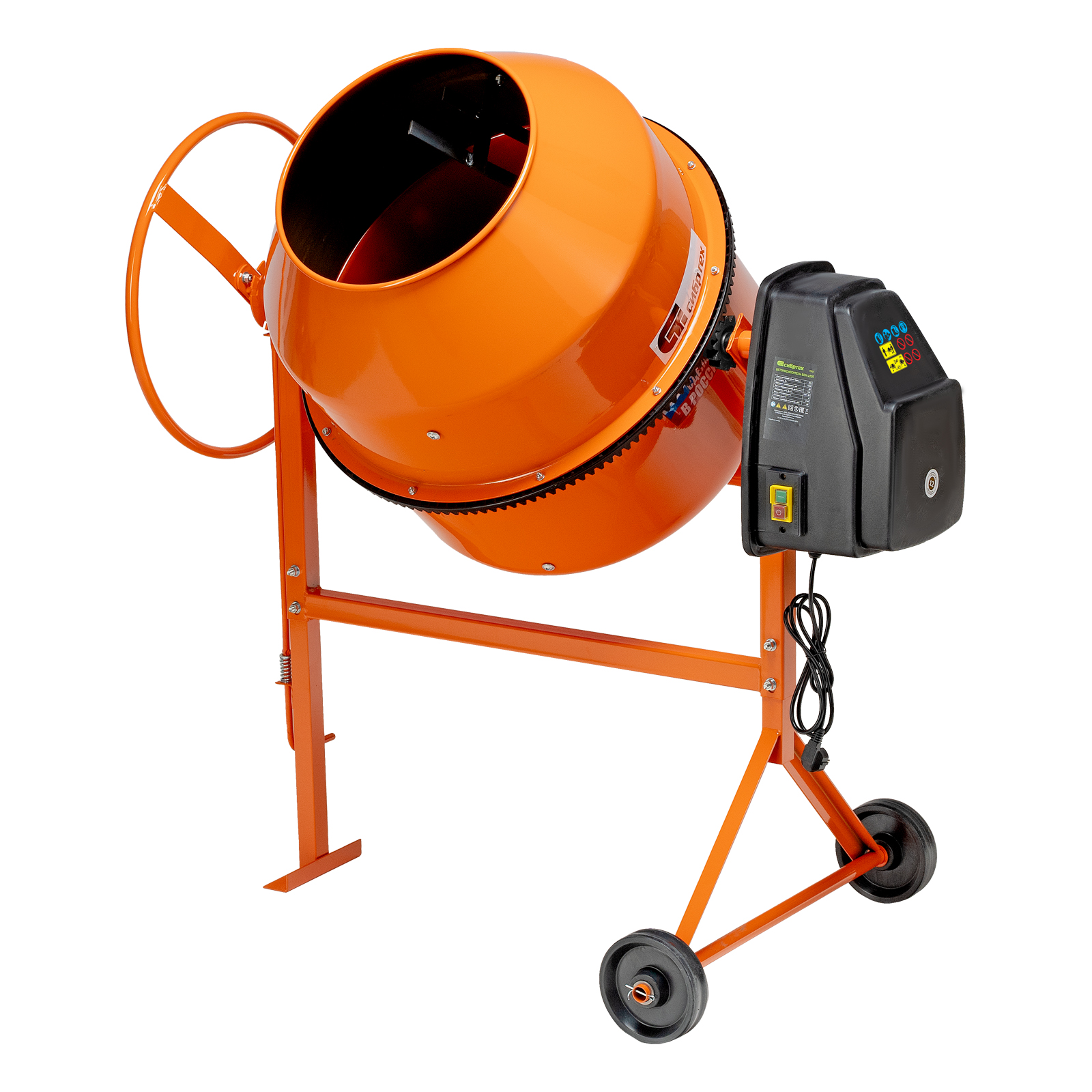 - Мобильность — прочные колеса облегчают перемещение бетоносмесителя по рабочей площадке.