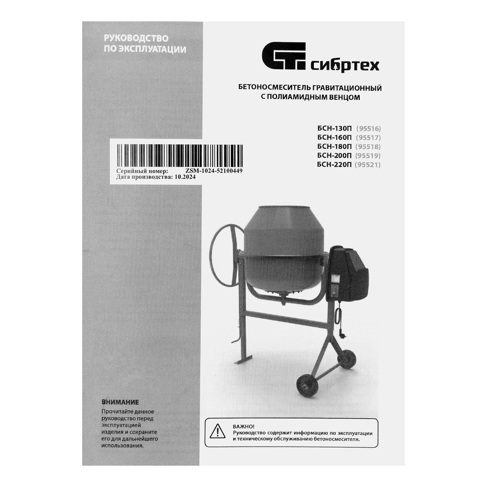 Бетоносмеситель в разборе - 1 штКомплект крепежа - 1 штУплотнительная лента - 1 штПривод - 1 штРуководство по эксплуатации - 1 шт |
