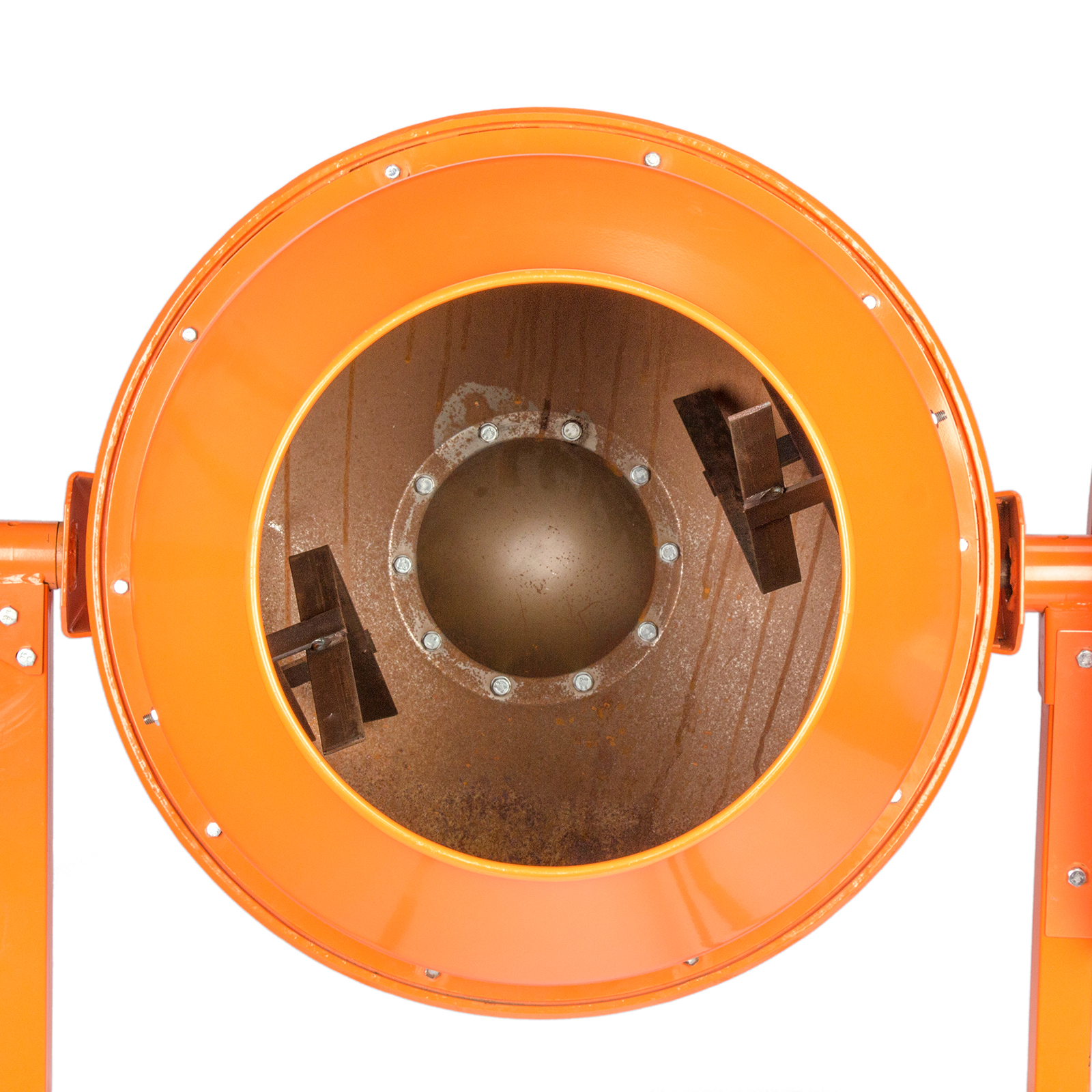 - Прочная конструкция — бетоносмеситель имеет стальную раму и усиленные профили траверсы, втулка оси траверсы наварена на раму отдельным элементом, венец крепится к барабану с помощью внешних проушин, а металлическая опора обеспечивает устойчивость бетономешалки
