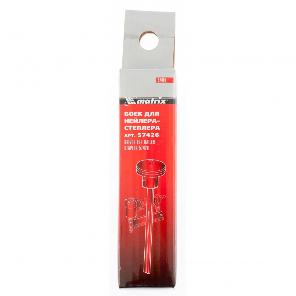 Боек Matrix 57485 устанавливается на нейлер-степлер 57426. Снабжен уплотнительным кольцом, обеспечивающим герметичность ударного механизма при давлении до 10 МПа и не теряющим своих свойств при температуре воздуха до -20 градусов C.
