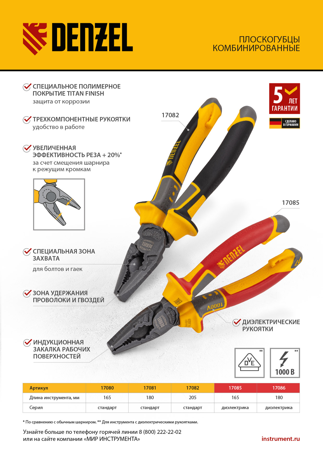 Бокорезы Denzel 17781 длиной 160 мм, с трехкомпонентными рукоятками, предназначены для разрезания кабелей из алюминия и меди, а также проволоки и стяжек. Максимальный диаметр перерезаемой мягкой проволоки (алюминиевой, медной, с пределом прочности 220 Н/мм2) составляет 6 мм, проволоки средней жесткости и гвоздей (750 Н/мм2) — 3,5 мм, жесткой (1800 Н/мм2) — 2 мм. Бокорезы используются для проведения слесарных и монтажных работ. Шарнир смещен к режущим кромкам, что позволяет сэкономить 20% усилий и максимально эффективно решать поставленные задачи.