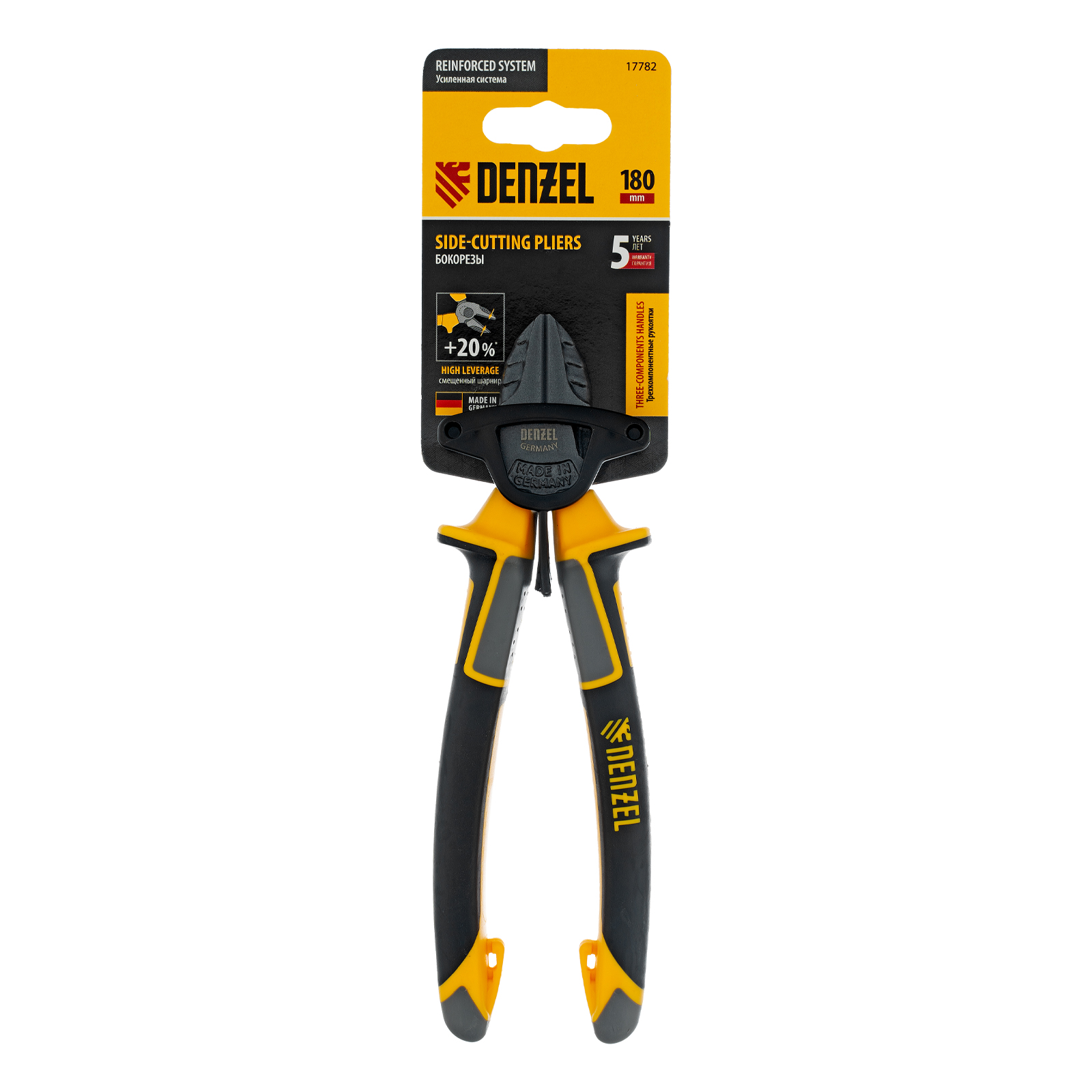 Бокорезы Denzel 17782 длиной 180 мм, с трехкомпонентными рукоятками, предназначены для разрезания кабелей из алюминия и меди, а также проволоки и стяжек. Максимальный диаметр перерезаемой мягкой проволоки (алюминиевой, медной, с пределом прочности 220 Н/мм2) составляет 7 мм, проволоки средней жесткости и гвоздей (750 Н/мм2) — 4 мм, жесткой (1800 Н/мм2) — 2,5 мм. Бокорезы используются для проведения слесарных и монтажных работ. Шарнир смещен к режущим кромкам, что позволяет сэкономить 20% усилий и максимально эффективно решать поставленные задачи.