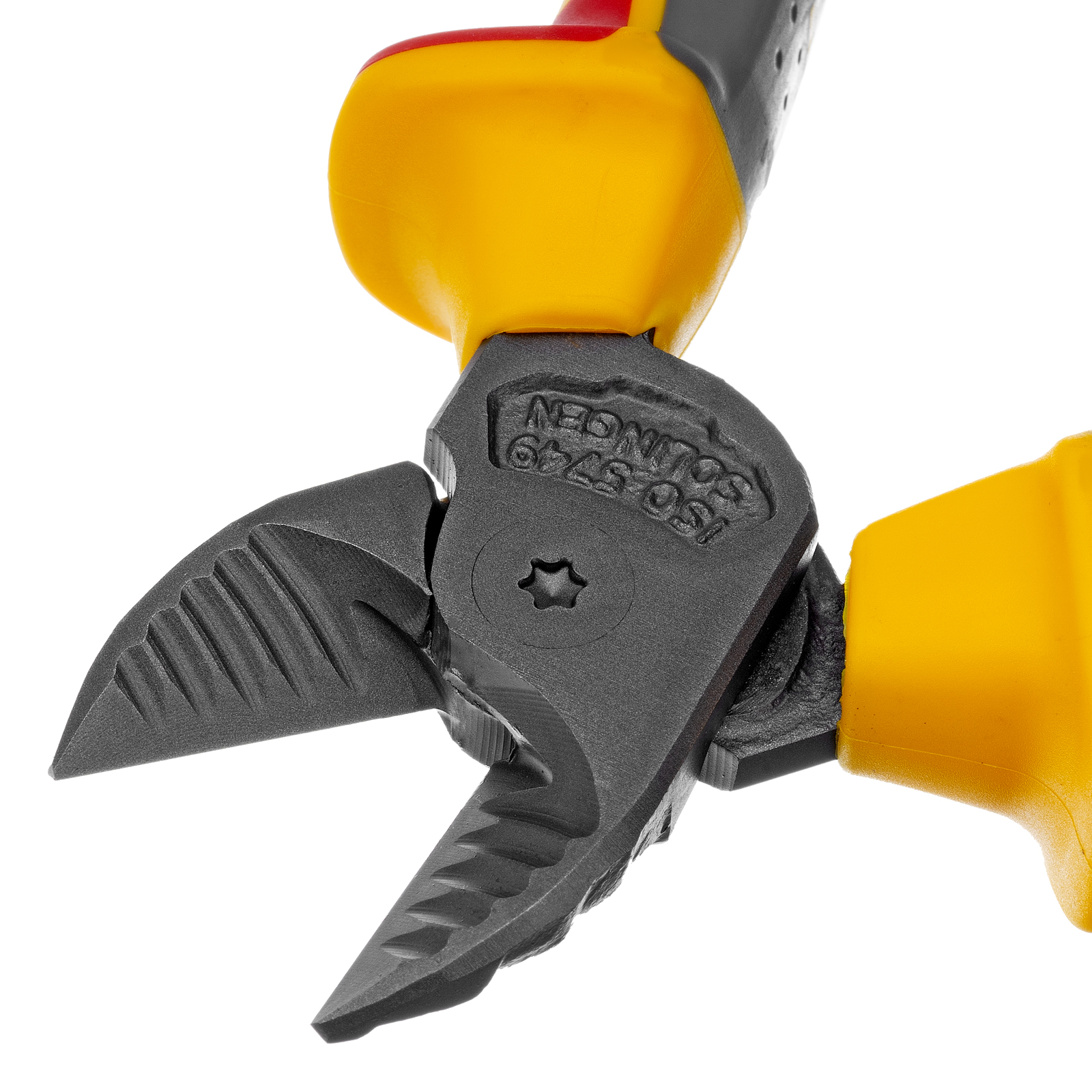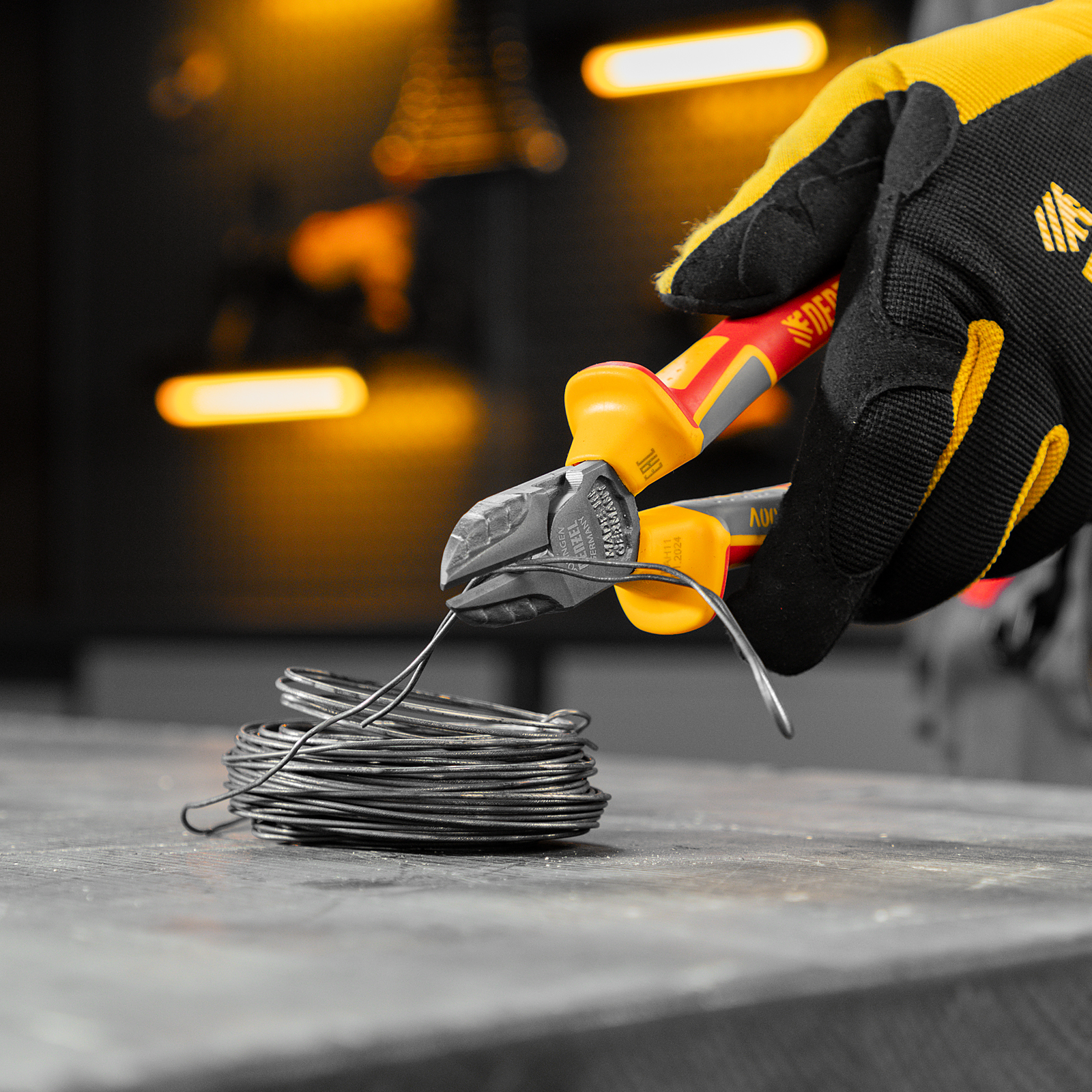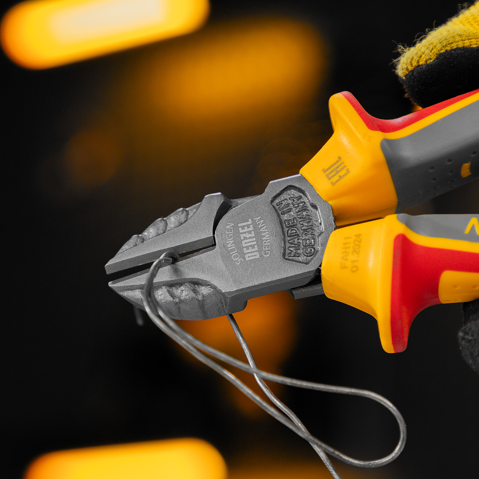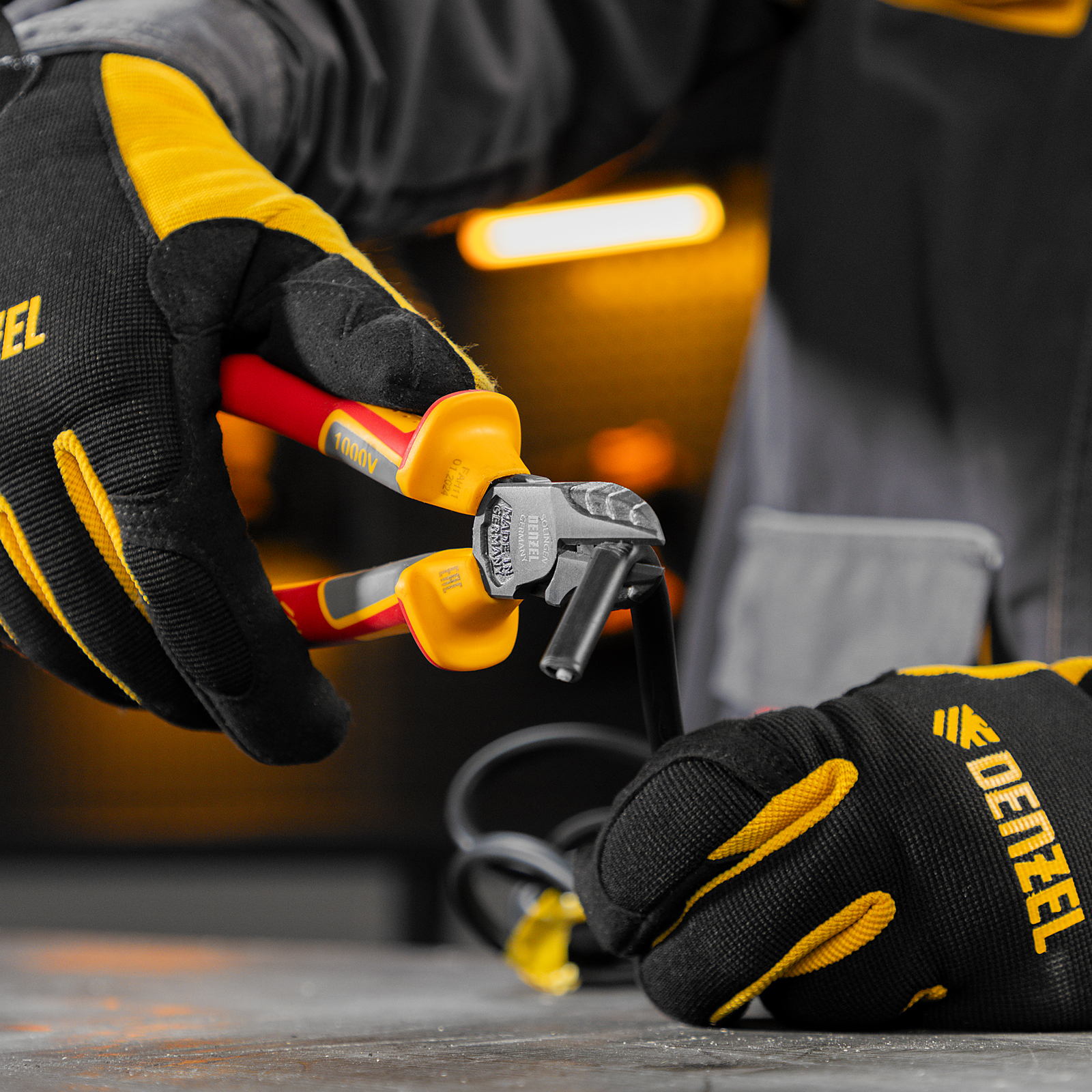 Бокорезы Denzel 17789 длиной 180 мм, с трехкомпонентными диэлектрическими рукоятками, рассчитанными на напряжение до 1000 В, предназначены для разрезания кабелей, проводов, проволоки, стержней из пластмассы и металла. Максимальный диаметр перерезаемой мягкой проволоки (алюминиевой, медной, с пределом прочности 220 Н/мм2) составляет 7 мм, проволоки средней жесткости и гвоздей (750 Н/мм2) — 4 мм, жесткой (1800 Н/мм2) — 2,5 мм. Бокорезы подходят для проведения электромонтажных работ. Инструмент эффективно справляется с поставленными задачами благодаря шарниру, смещенному к режущим кромкам и увеличивающему усилие реза на 20%. Важно — перед началом работы необходимо отключить напряжение в сети!