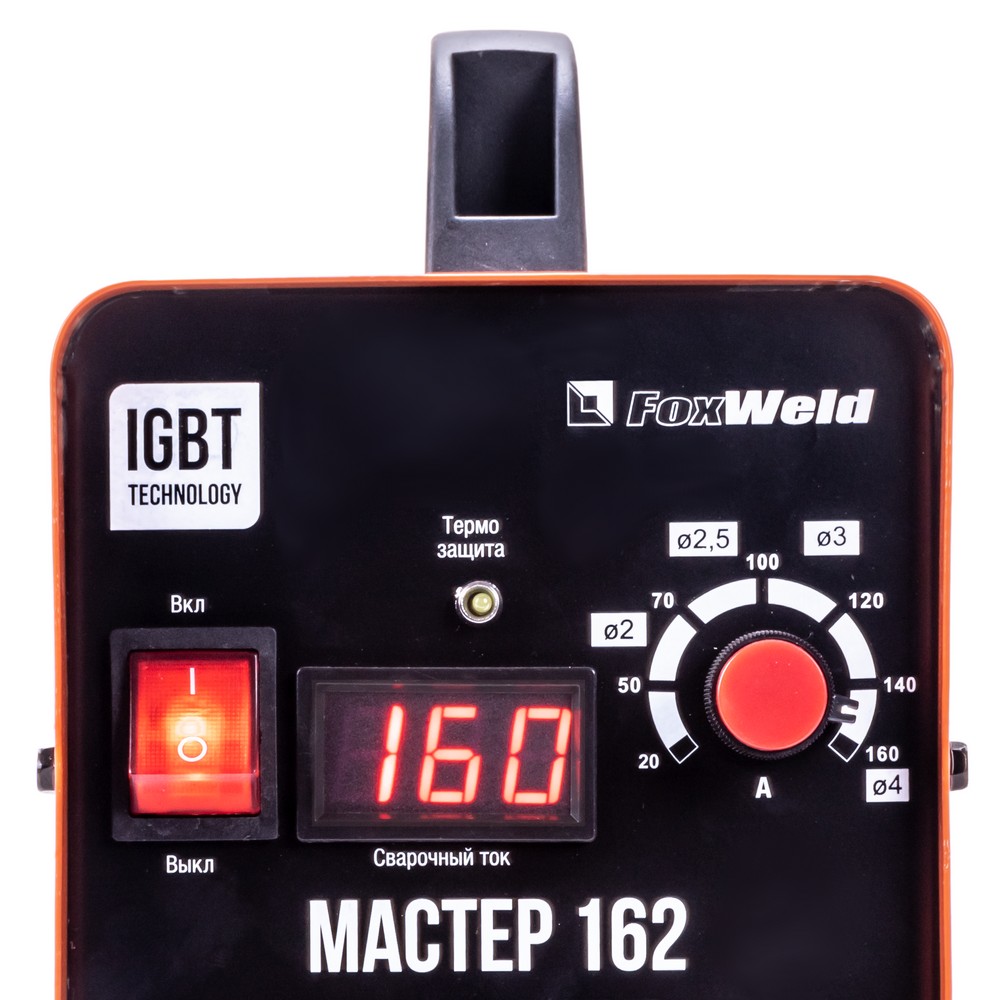 Сварочный аппарат инверторного типа FOXWELD МАСТЕР 162 разработан и сделан для профессионалов, главные особенности - мощность, надежность, компактность. МАСТЕР 162 выполнен для реализации исключительно одного процесса сварки: электродуговая сварка покрытым электродом (MMA). Улучшенная схема стабилизации сварочного процесса дает хороший поджиг и «мягкую» сварочную дугу с минимальным разбрызгиванием. Для облегчения процесса сварки в режиме ММА и получения более качественного сварного соединения, аппарат имеет встроенные функции: AntiSticking (антиприваривание), Arc Force (форсаж дуги) и Hot Start (горячий старт). Модель отличается простой панелью управления и возможностью работать при пониженном напряжении. Вся мощность сварочного тока передаётся от инвертора к сварочным розеткам (байонетам) через медные шины большого сечения. Розетки имеют большой размер 35-50, что также положительно сказывается на передаче полной мощности и долговечности мест соединения: кабельная розетка – кабельная вилка.РАБОТА БЕЗ ОСТАНОВКИ: Параметр ПВ 100% на максимальном токе при КПД 85% обеспечивает бесперебойную устойчивую работу сварочного аппарата в течении всего рабочего дня. Это позволяет производить безостановочный сварочный процесс и выполнять работы, которые требуют больших временных затрат, что повышает скорость и производительность.РАБОТА ПРИ ПОНИЖЕННОМ НАПРЯЖЕНИИ: Аппарат работает от однофазной сети 220 В при перепадах напряжения от 140 до 270 В. Это даёт возможность производить сварочные работы в «плохих» сетях – на даче, в домашних условиях при пониженном или нестабильном напряжении.НЕБОЛЬШОЙ ВЕС: Небольшой вес и размеры сварочного аппарата плюс ручка на корпусе добавляют мобильности, компактности и идеально подходят для бытового и профессионального использования.ИНФОРМАТИВНАЯ ПАНЕЛЬ УПРАВЛЕНИЯ: Регулировочная ручка и цифровой дисплей для отображения информации позволяют установить значения сварочного тока. На передней панели также расположен светодиодный индикатор перегрева/неисправности.ПРЕИМУЩЕСТВА:Небольшой и компактный сварочный инверторРеально соответствует заявленным характеристикамПитание от обычной сети 230 ВУверенно выдерживает пониженное и повышенное напряжение, работает при падении напряжения до 140 ВОдна из самых лучших систем стабилизации сварочного процесса и минимизации разбрызгивания за счёт улучшенной схемы управления сварочным процессомСварочные клеммы увеличенного сечения (35 мм² вместо 25 мм², как у большинства профессиональных аппаратов)Плавная регулировка сварочного токаВстроенная функция облегчения поджига дуги (Hot Start)Функция стабилизации и препятствия залипанию в процессе сварки (Arc Force)Функция снижения сварочного тока в случае замыкания электрода или электрододержателя (Anti Sticking)Цифровой дисплей на панели управления для отображения настроек сварочного токаОчень долгий период производства и продаж, при минимальном обращении в сервис для обслуживанияФУНКЦИОНАЛЬНЫЕ ОСОБЕННОСТИ:РЕЖИМ MMA: Работает с входным напряжением от 140 до 270 вольт;Может работать с диаметром покрытого электрода до 4 мм;Выставляется ток сварки от 20 до 160 ампер;Аппарат снабжён мощными и надёжными байонетами 35-50 мм;Для облегчения процесса сварки присутствуют функции: Hot Start, Arc Force и AntistickingКОМПЛЕКТАЦИЯ: Сварочный аппарат МАСТЕР 162 – 1 шт.; Эле