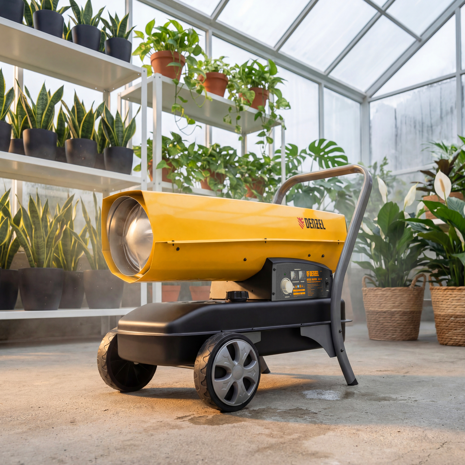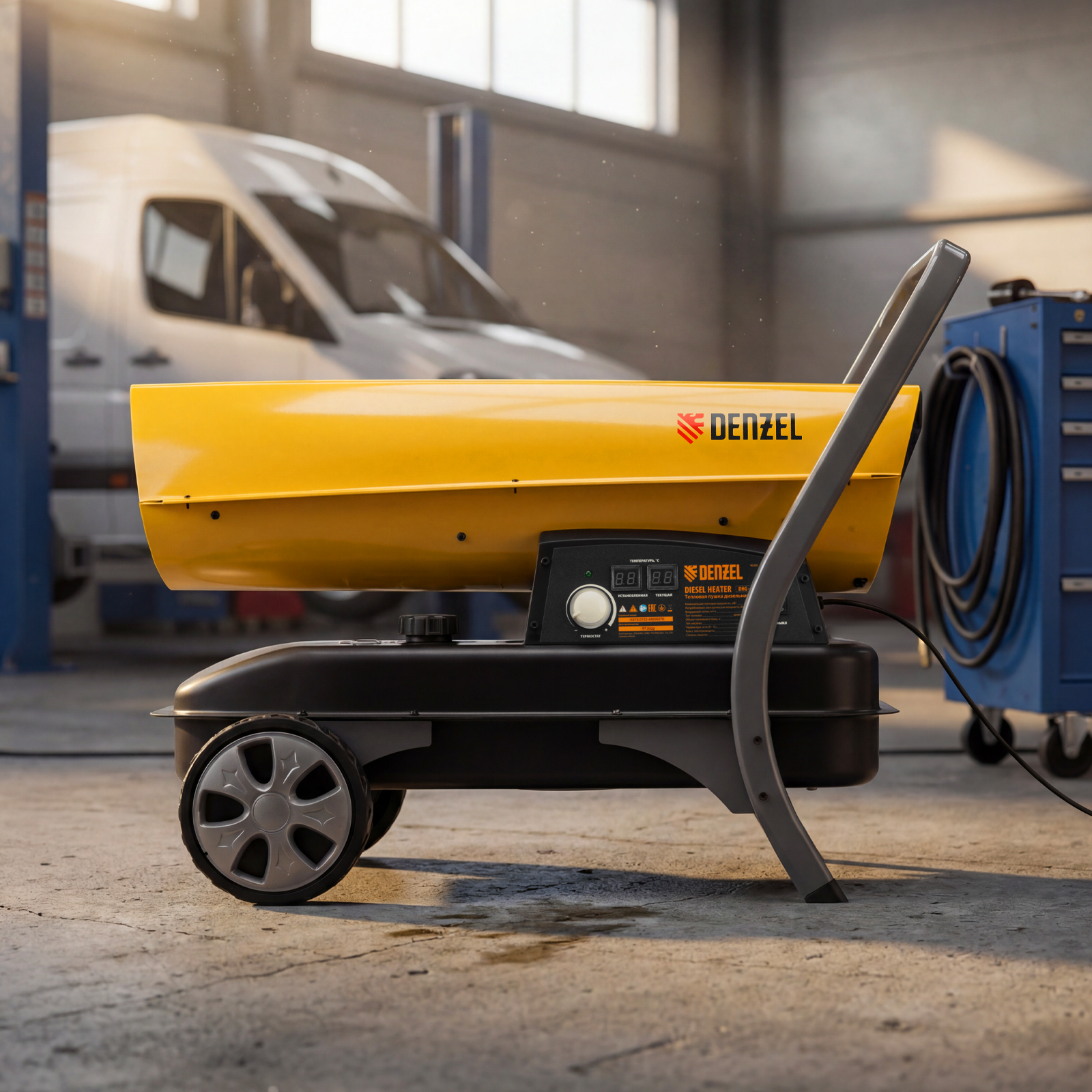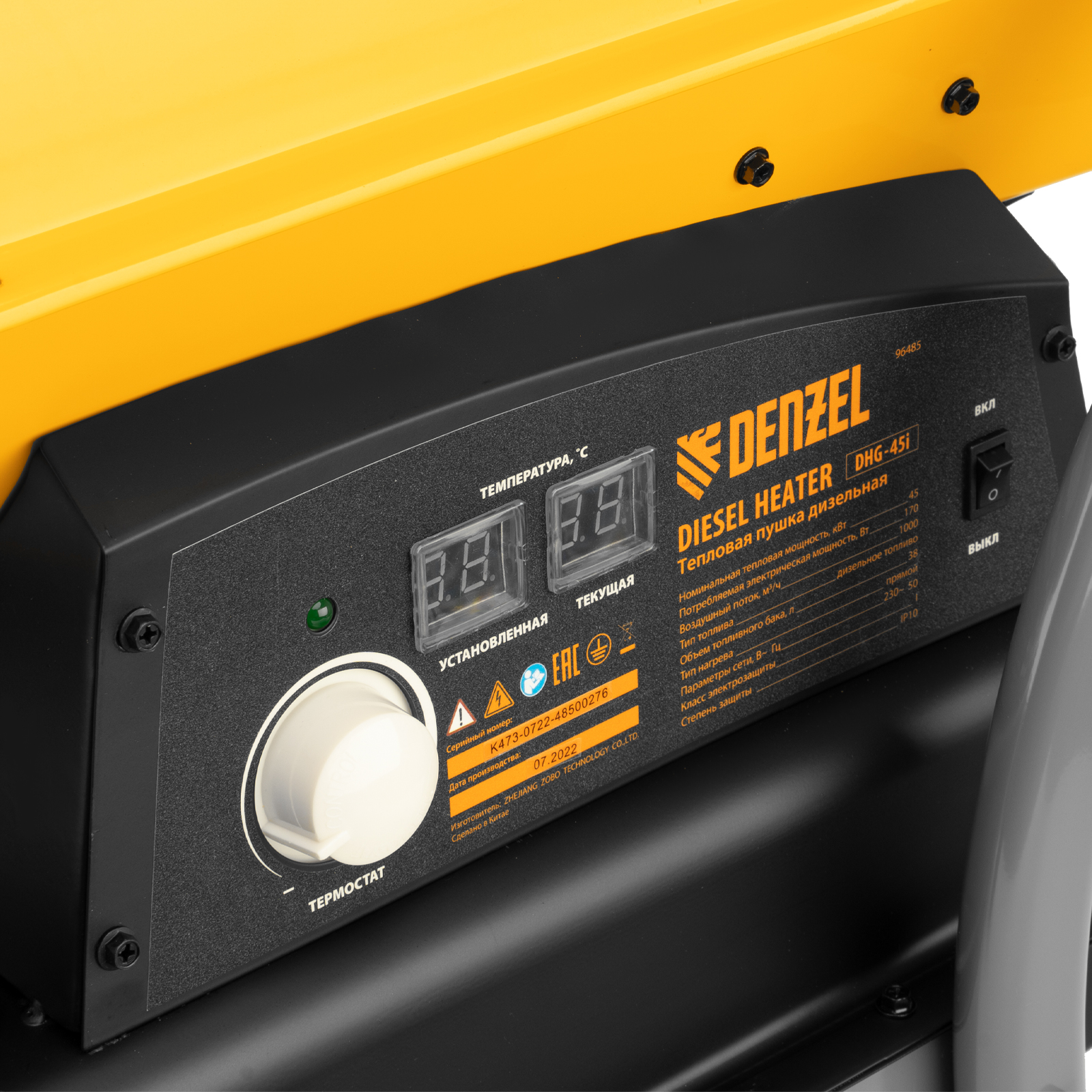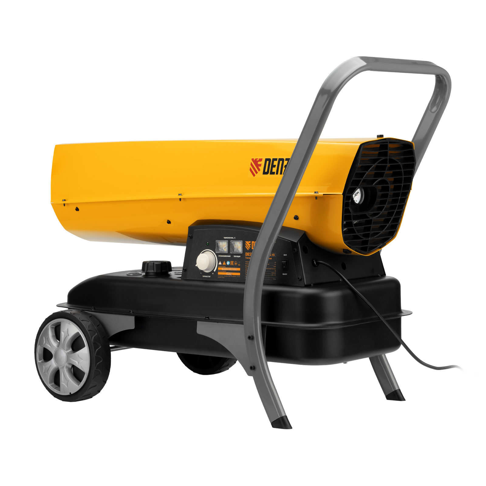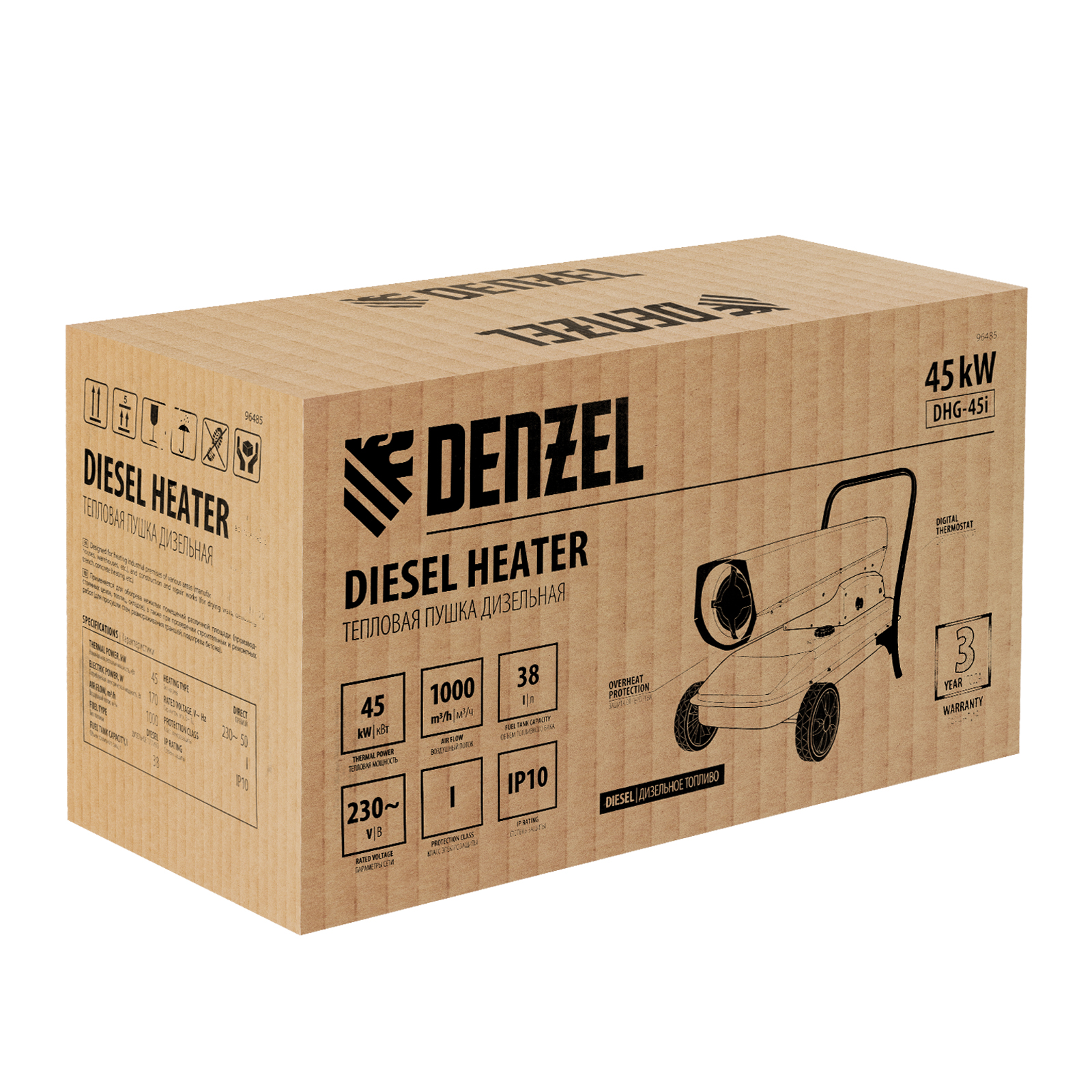 Дизельная тепловая пушка Denzel DHG-45i 96485 номинальной тепловой мощностью 45 кВт и производительностью 1000 куб. м/ч, с прямым типом нагрева, с электронным термостатом, предназначена для обогрева цехов, складов, теплиц и других нежилых помещений. Используется в строительстве и на производстве. Пушка характеризуется низким расходом топлива: полного бака хватает более чем на 9 часов работы. Важно: в обогреваемом помещении необходимо обеспечить хорошую вентиляцию.
