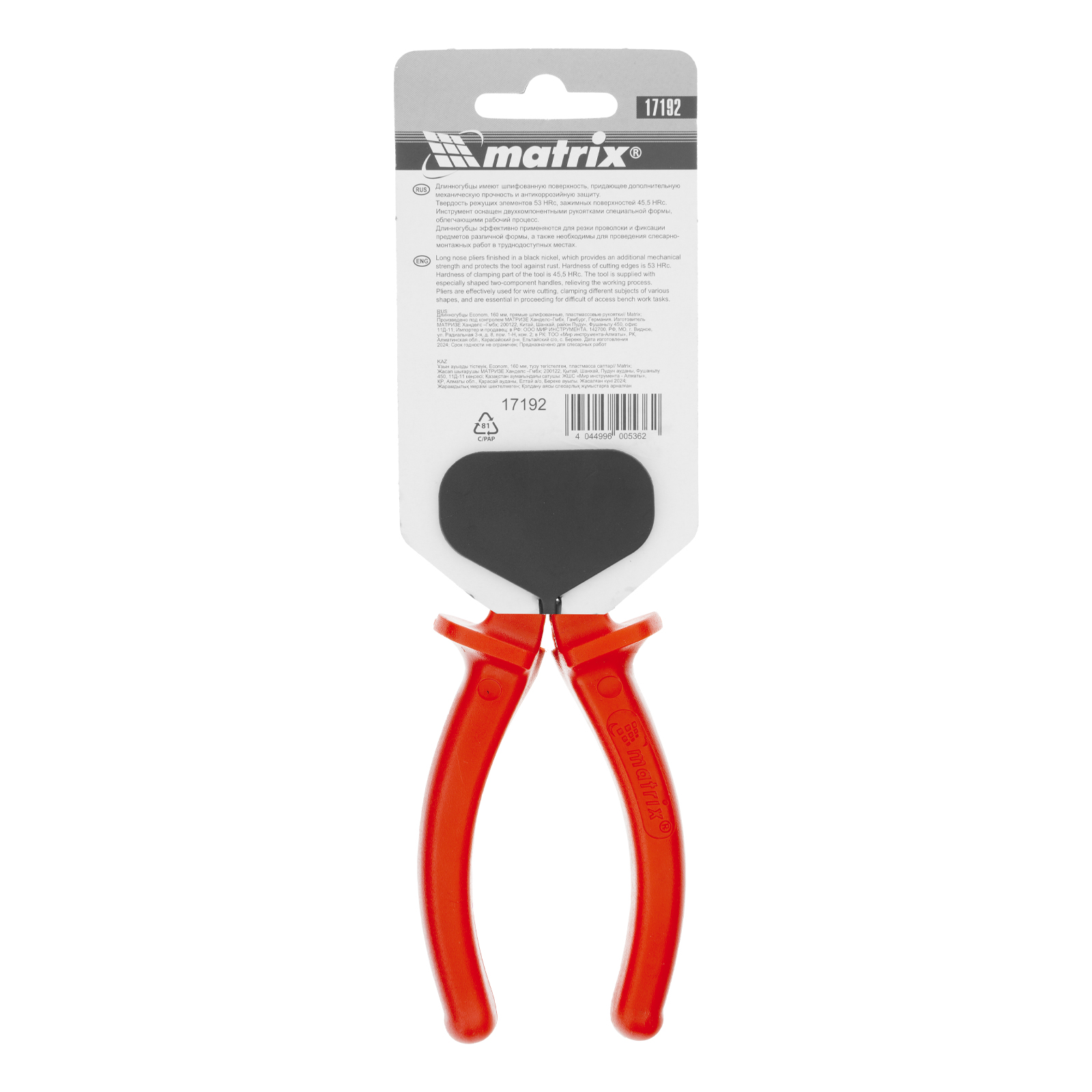 Длинногубцы прямые Econom, 160 мм, шлифованные, пластмассовые рукоятки Matrix в Воронеже