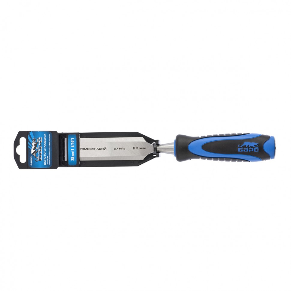Плоское долото-стамеска Барс 24653 с шириной режущей части 28 мм, с двухкомпонентной рукояткой и металлическим затыльником, предназначено для выборки прямоугольных пазов, снятия фасок, обработки шиповых соединений и выполнения других столярно-плотницких работ. Используется для работы с массивом дерева любой твердости. По затыльнику рукоятки можно наносить удары киянкой или небольшим молотком, поэтому инструмент легко погружается в древесину и обеспечивает аккуратный ровный контур среза.