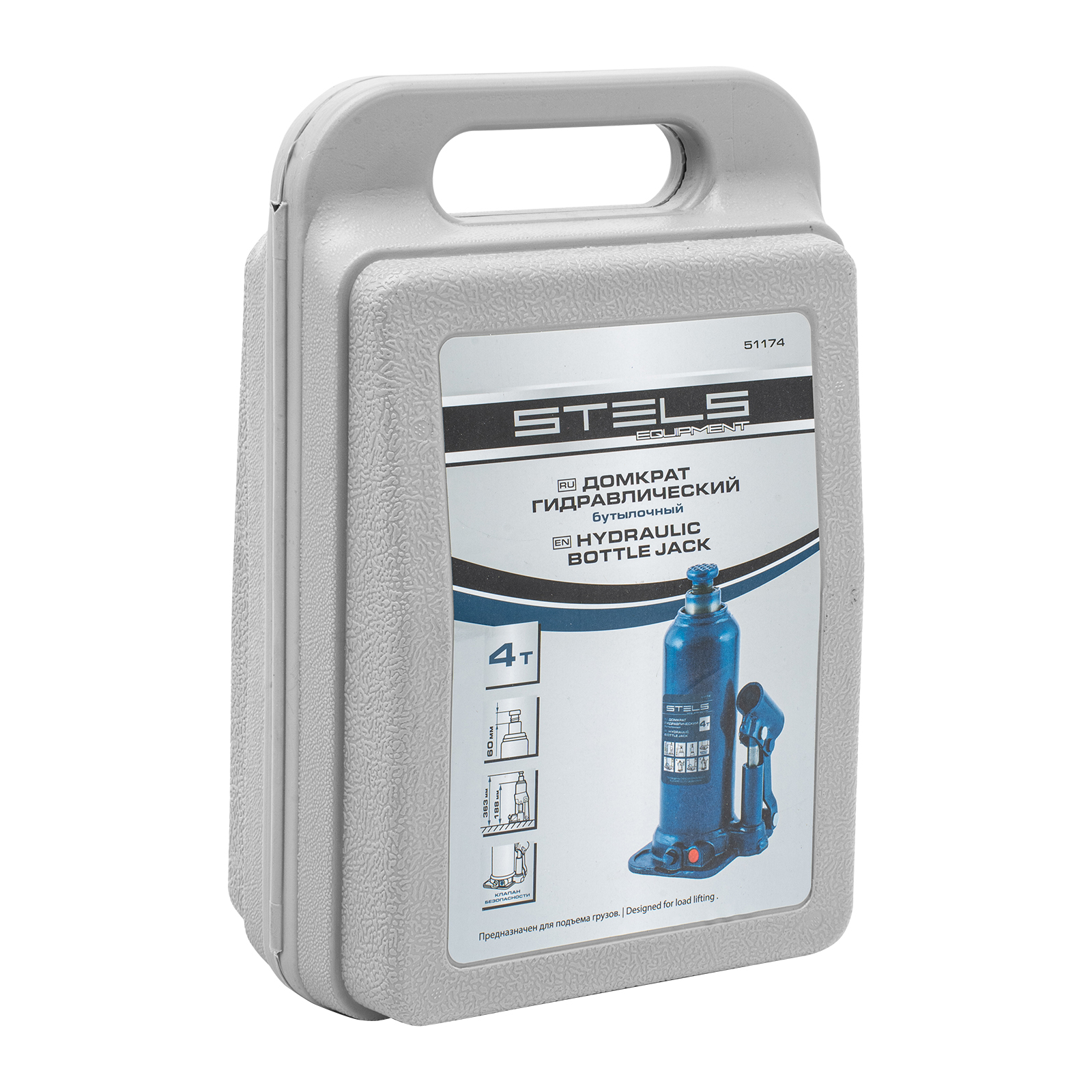 Гидравлический бутылочный домкрат Stels 51174 в пластиковом кейсе предназначен для поднятия грузов весом до 4 т на высоту 188-363 мм. Он не занимает много места и легко помещается в багажник, поэтому его можно брать с собой в дорогу или хранить в гараже. Используется для самостоятельного ремонта авто, также подходит для профессионального применения на станциях технического обслуживания.