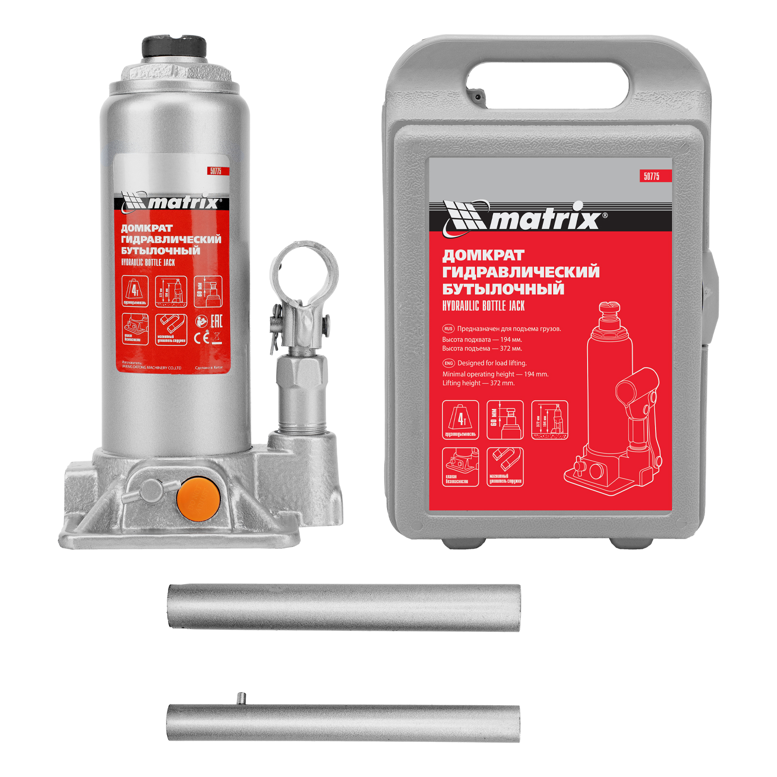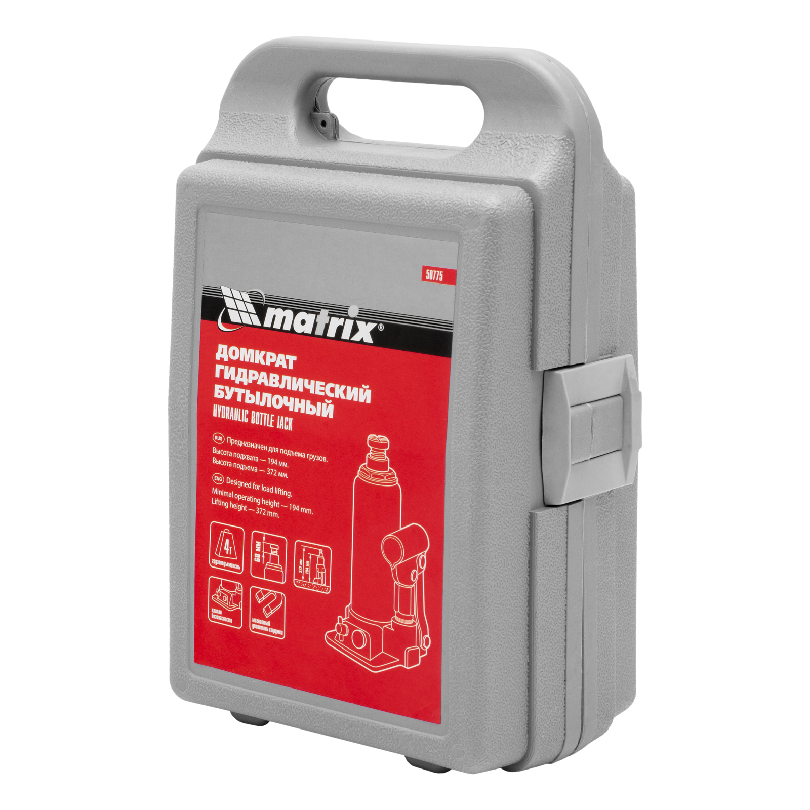 Домкрат гидравлический бутылочный, 4 т, h подъема 194-372 мм, в пластиковом кейсе Matrix в Воронеже
