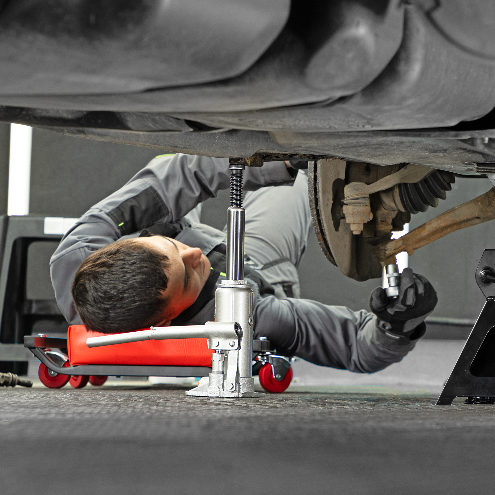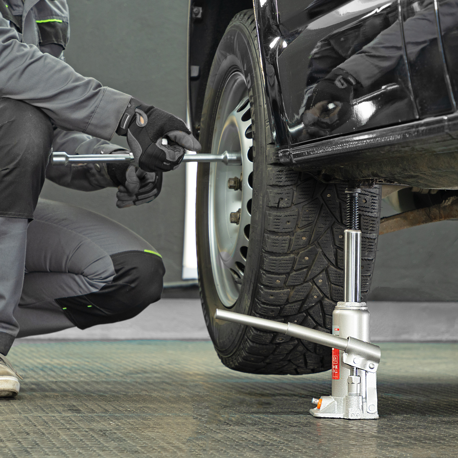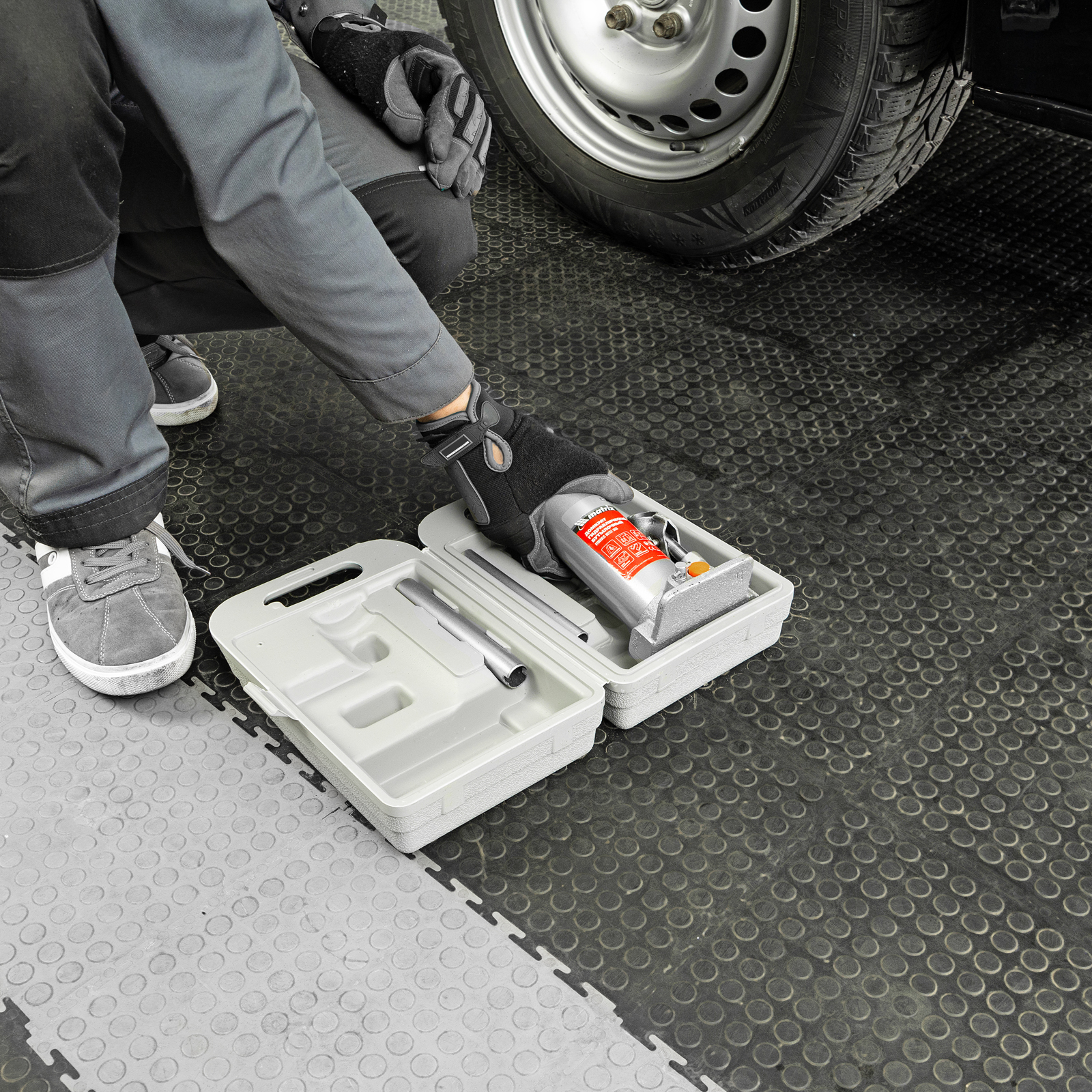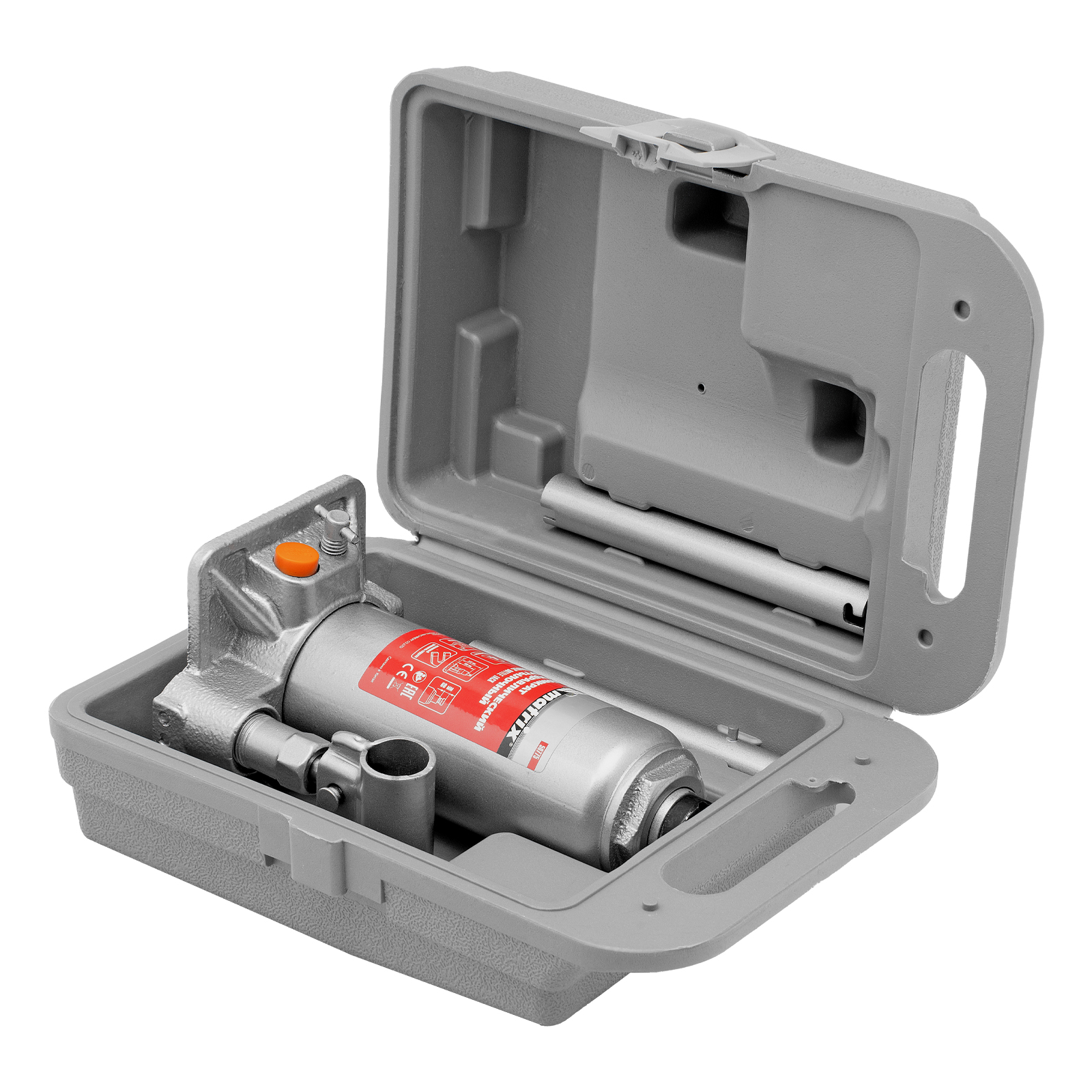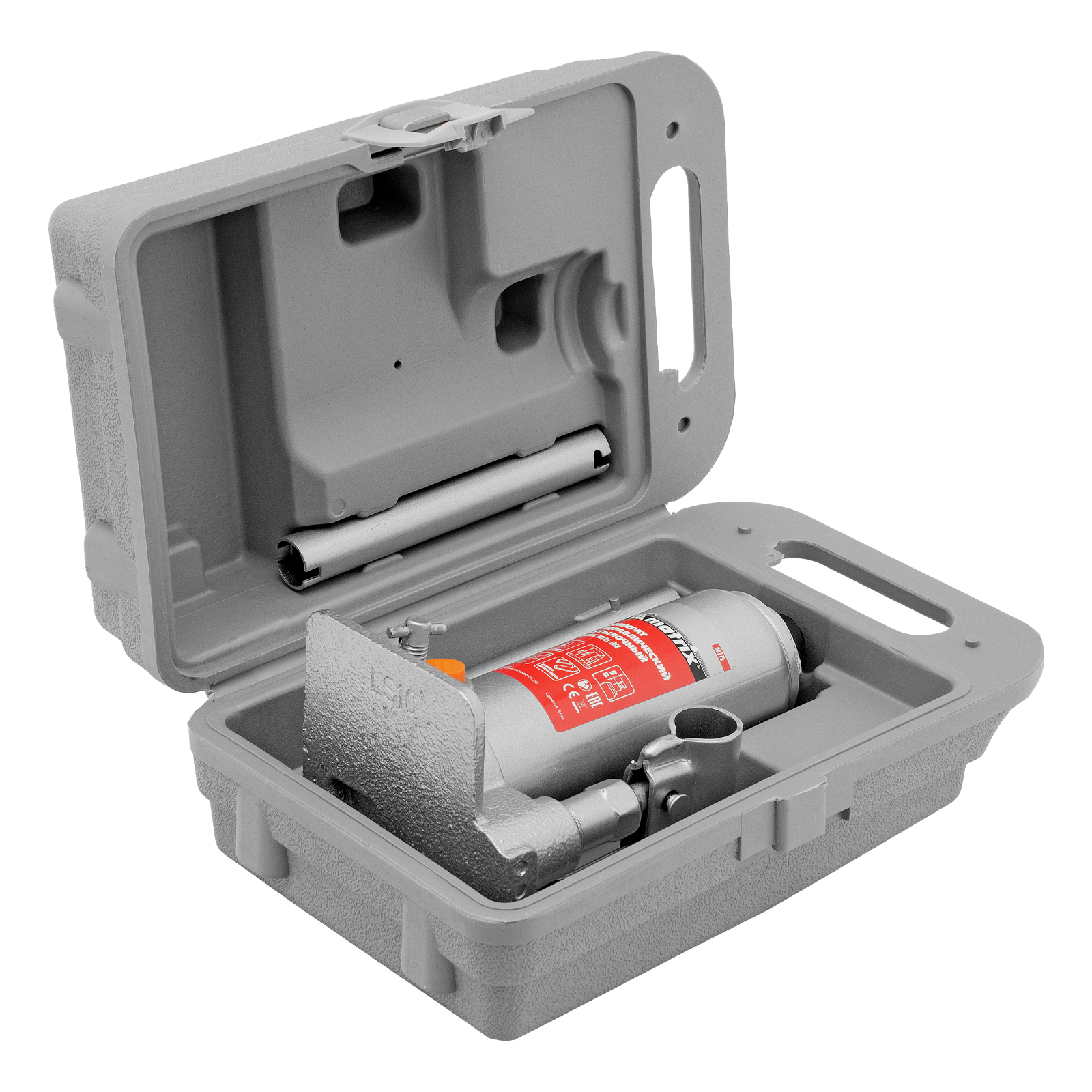 - Удобная транспортировка — домкрат комплектуется прочным пластиковым кейсом.