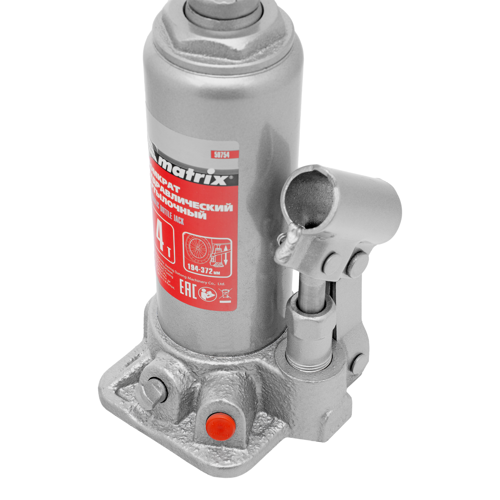 Домкрат гидравлический бутылочный Matrix 50754 предназначен для подъема грузов массой до 4 т на высоту от 194 до 372 мм. Оптимален для машин с большим клиренсом. Будет полезен автолюбителям при проведении технического обслуживания и ремонте авто в дороге или в гараже. Также домкрат подходит для полупрофессионального применения на станциях ТО.