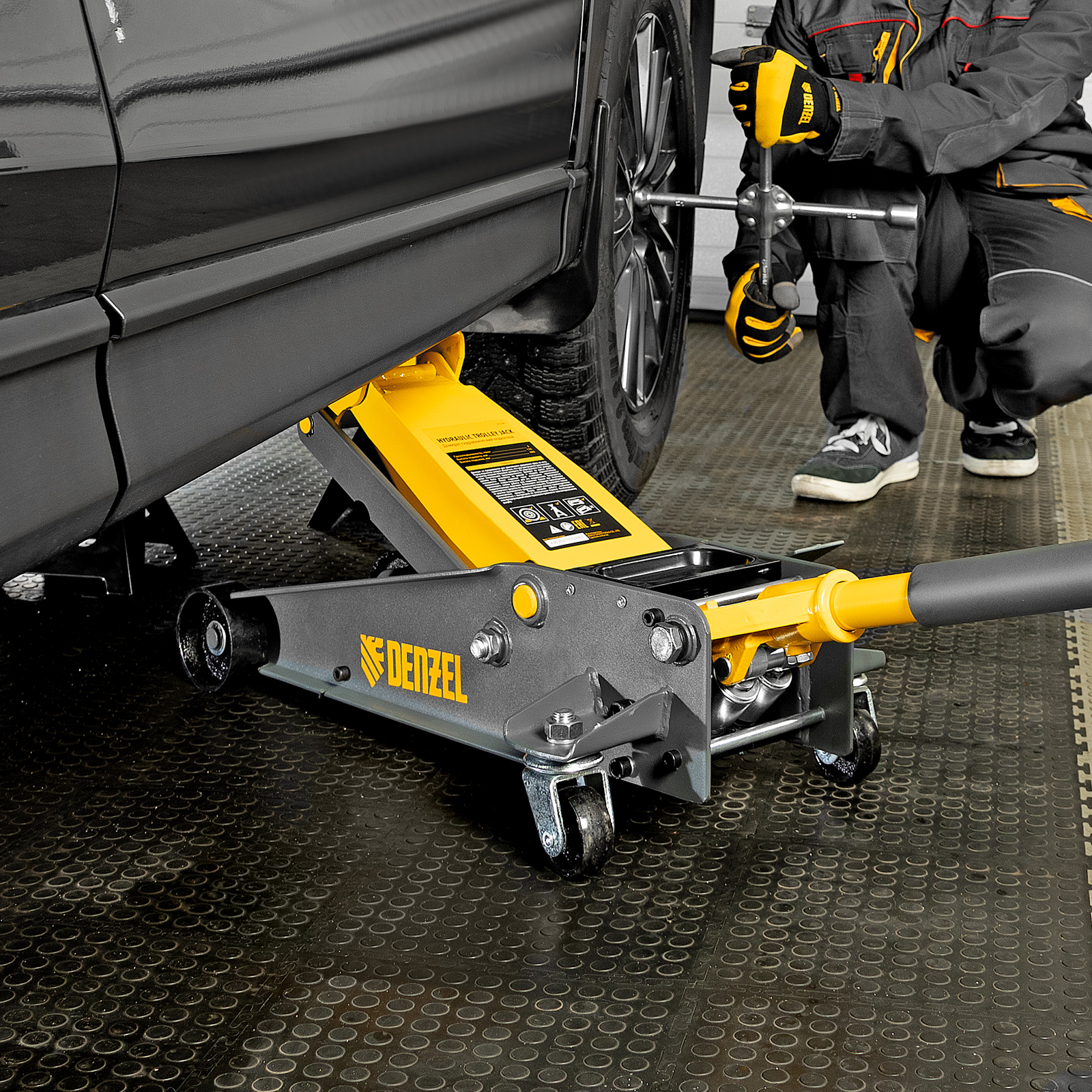 Профессиональный подкатной гидравлический домкрат Denzel 51138 с фиксатором позволяет быстро и плавно поднимать грузы массой до 3 т на высоту 135-480 мм. Подходит всех типов автомобилей со стандартным клиренсом. Предназначен для использования на станциях техобслуживания и шиномонтажа.