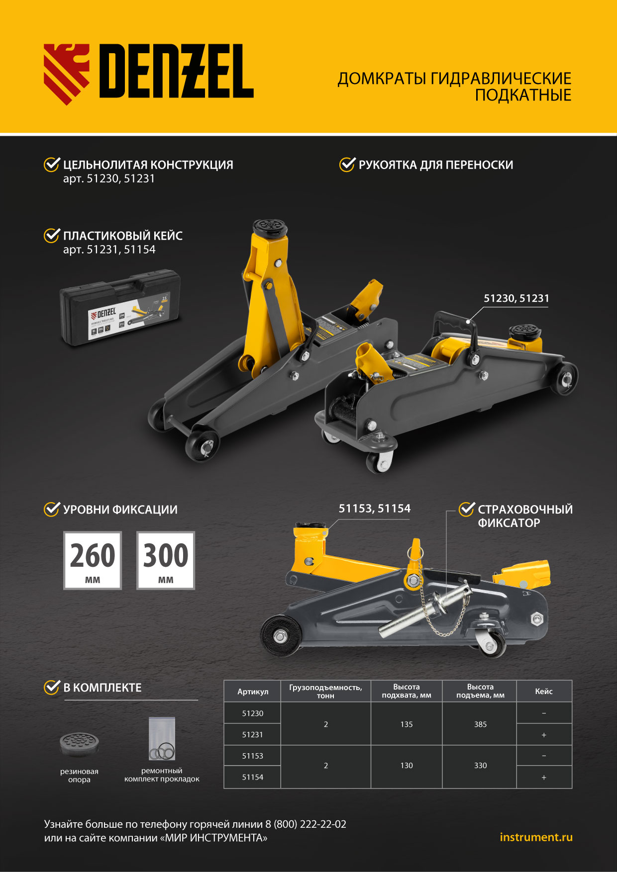 Гидравлический подкатной домкрат с фиксатором Denzel 51153, с высотой подхвата 130 мм, предназначен для плавного подъема грузов массой до 2 т на высоту до 330 мм. Страховочный штифт позволяет фиксировать подъемный рычаг на высоте 260 и 300 мм для безопасной работы. Домкрат пригодится владельцам легковых автомобилей со стандартным клиренсом.
