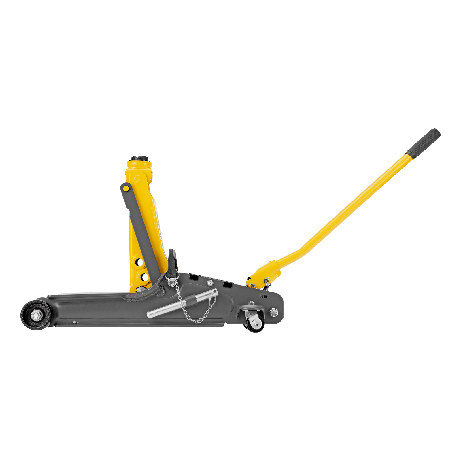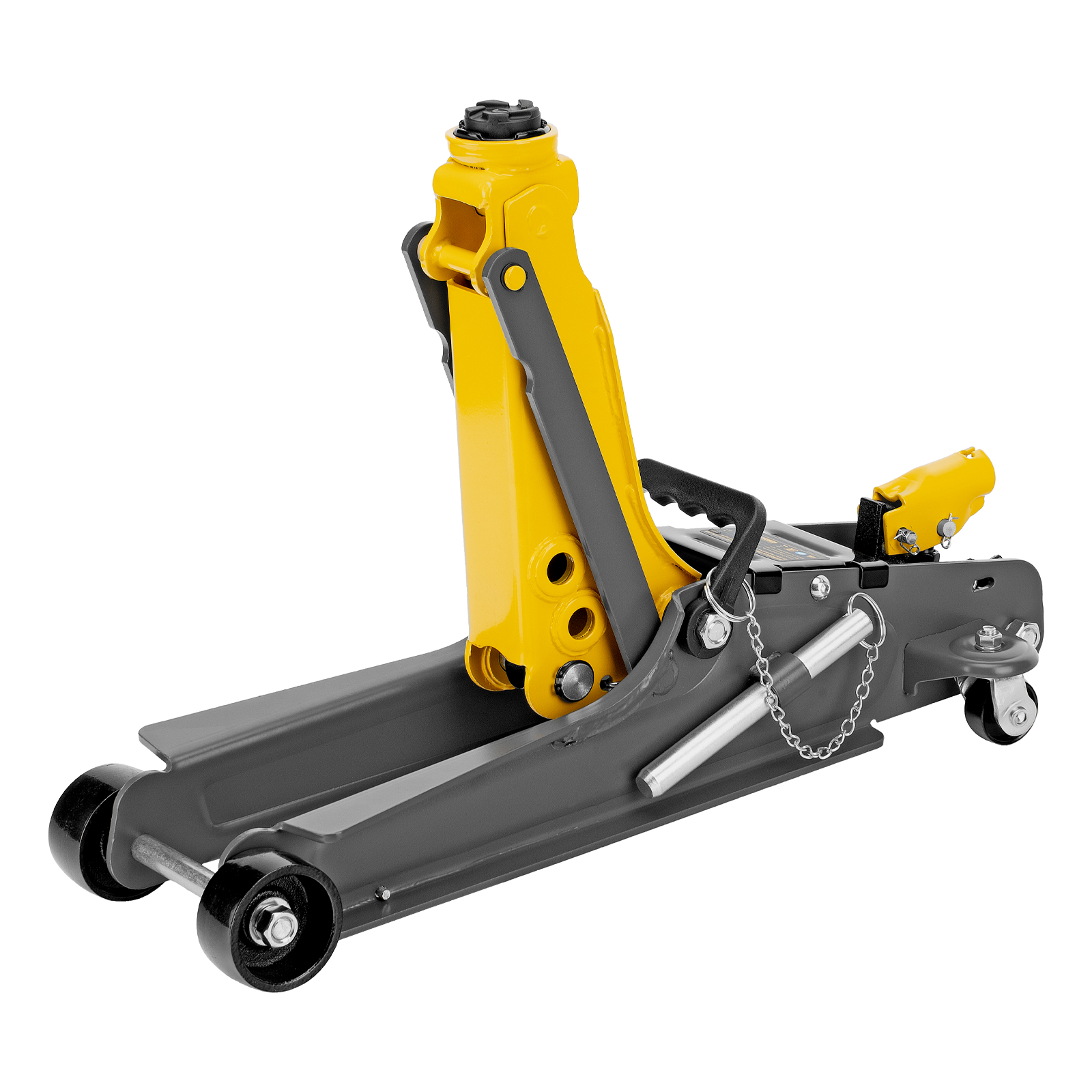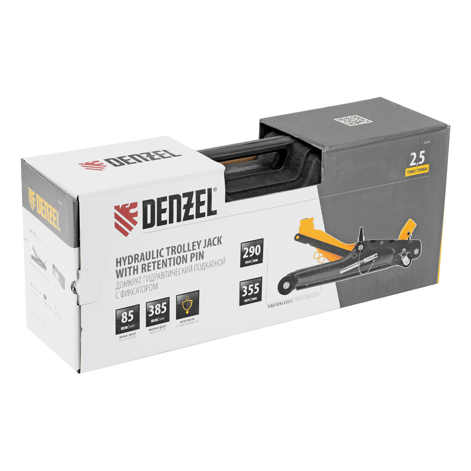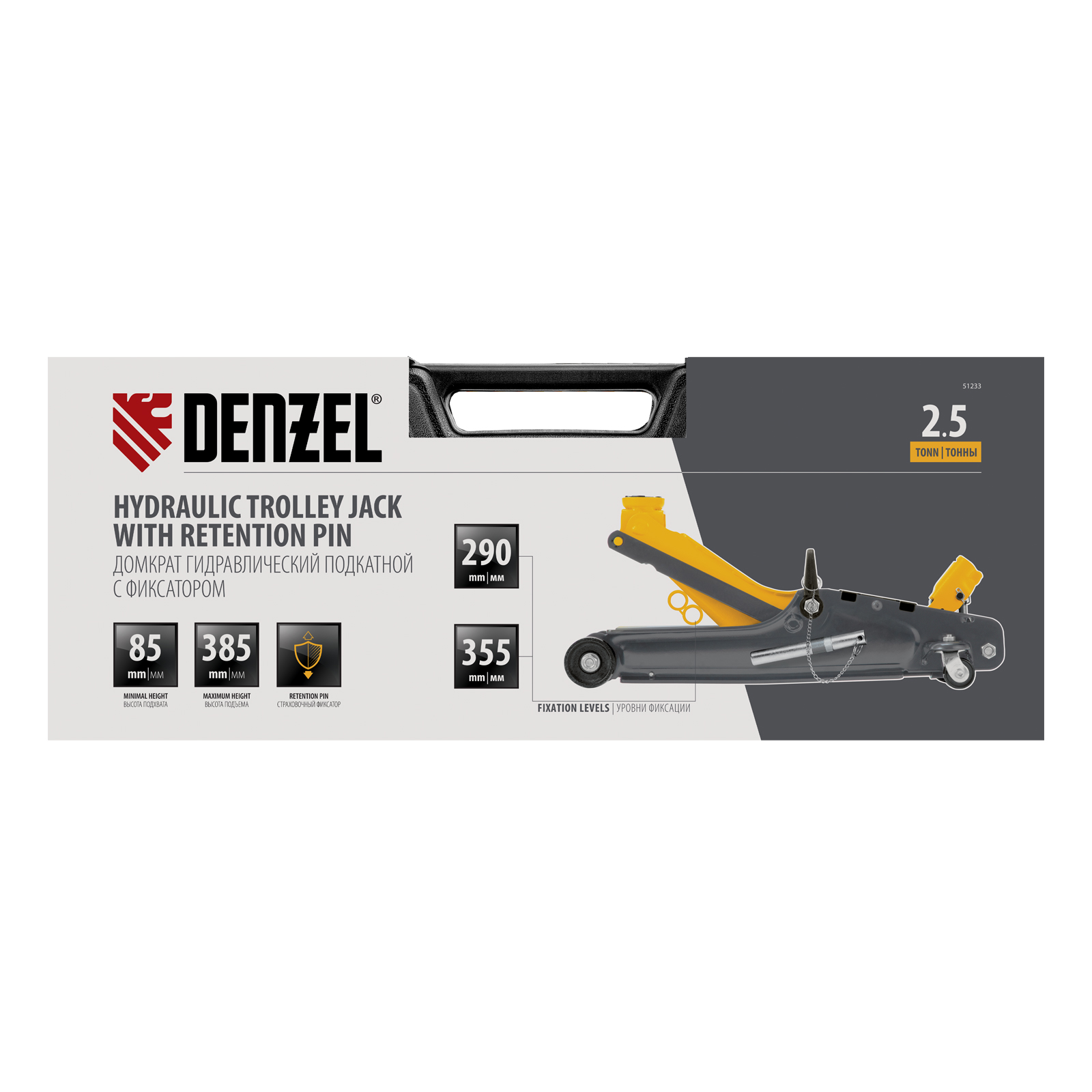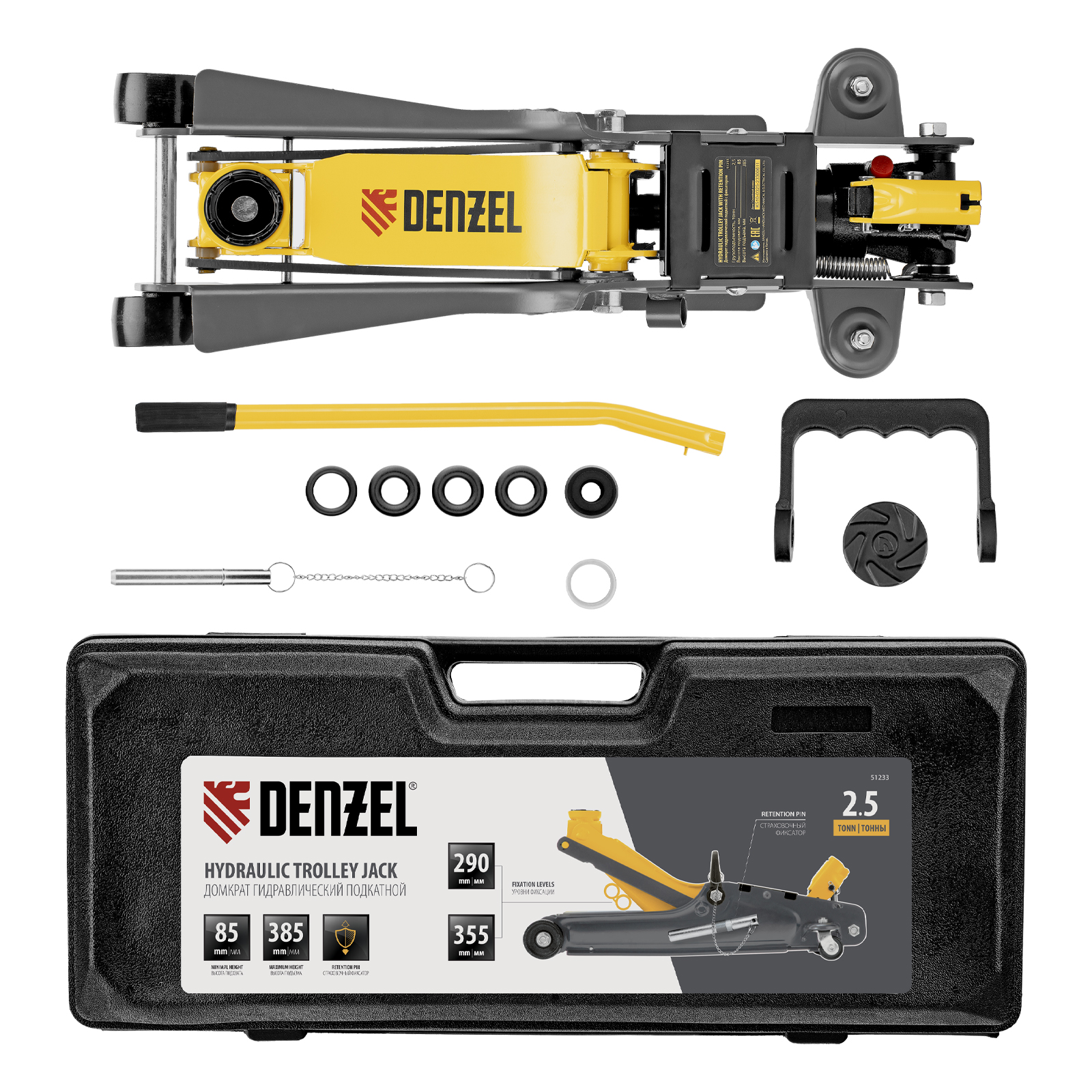Гидравлический подкатной домкрат Denzel 51233 с фиксатором, поставляющийся в кейсе, имеет высоту подхвата 85 мм и предназначен для плавного подъема грузов массой до 2,5 т на высоту до 385 мм. Страховочный штифт позволяет фиксировать подъемный рычаг на высоте 290 и 355 мм для безопасной работы. Домкрат пригодится владельцам легковых автомобилей с низким и стандартным клиренсом.