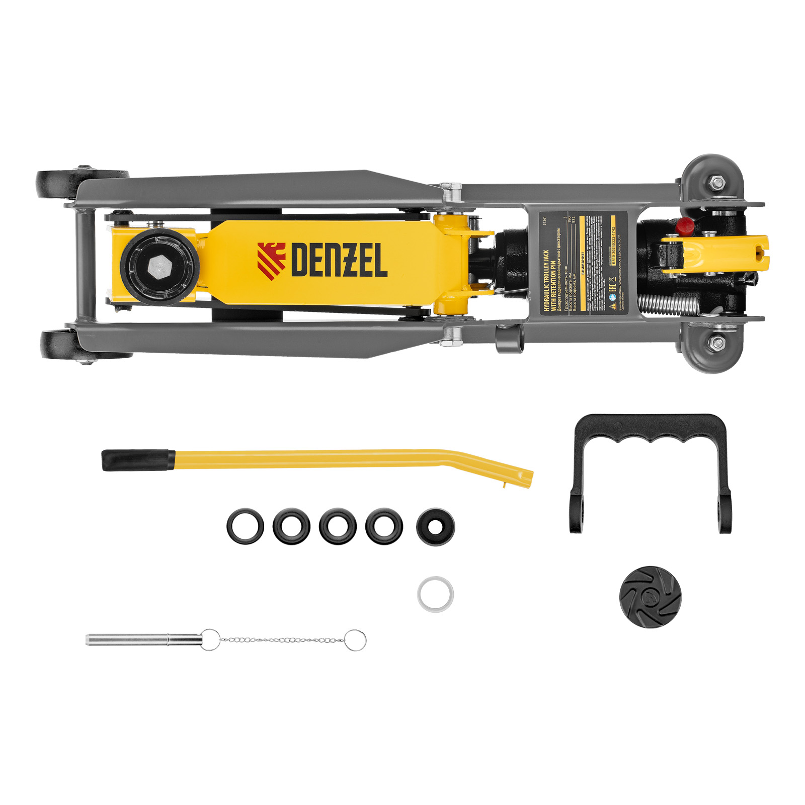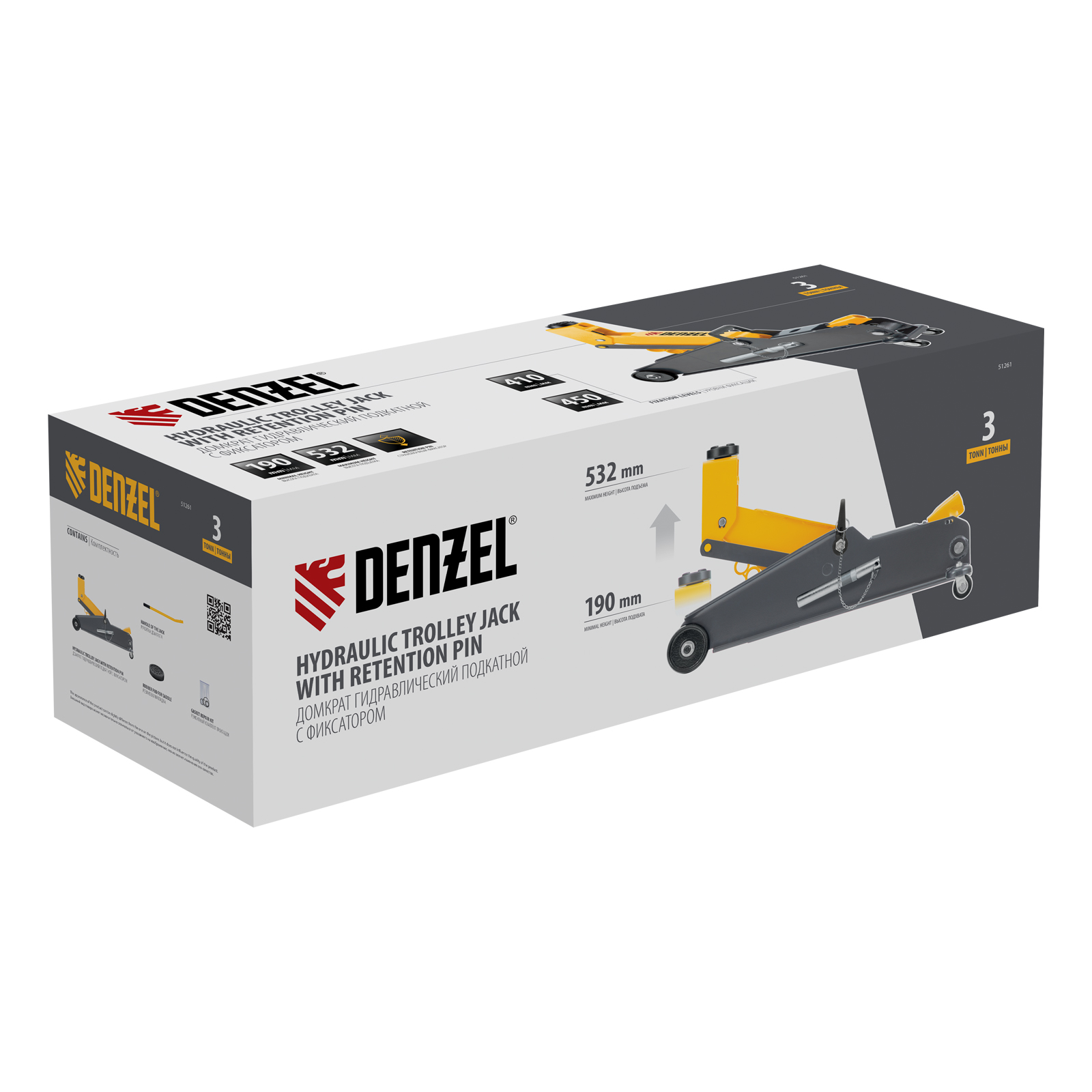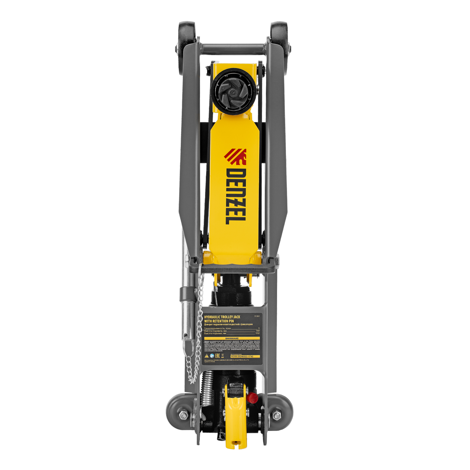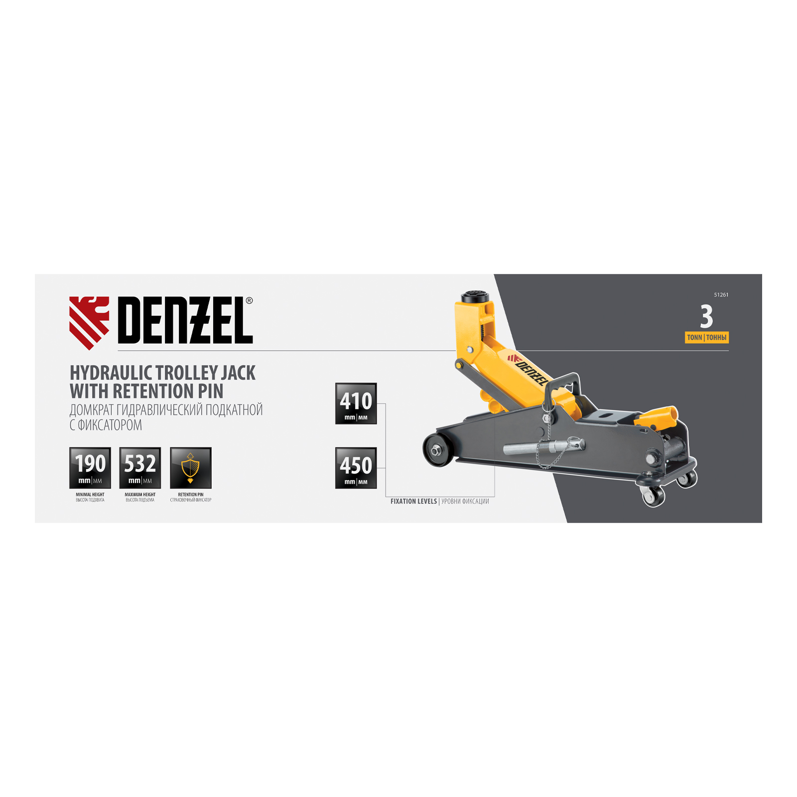 Гидравлический подкатной домкрат Denzel 51261 с фиксатором имеет высоту подхвата 190 мм и предназначен для плавного подъема грузов массой до 3 т (в том числе автомобилей класса SUV) на высоту до 532 мм. Страховочный штифт позволяет фиксировать подъемный рычаг на высоте 410 и 450 мм для безопасной работы. Домкрат пригодится владельцам легковых автомобилей со стандартным клиренсом.