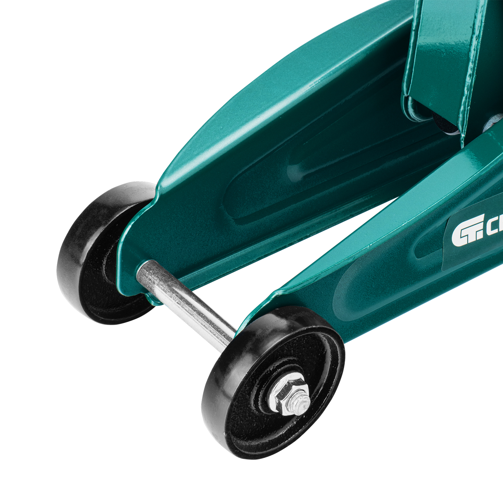 - Маневренность — благодаря поворотным колесам домкрат можно быстро подвести под груз.