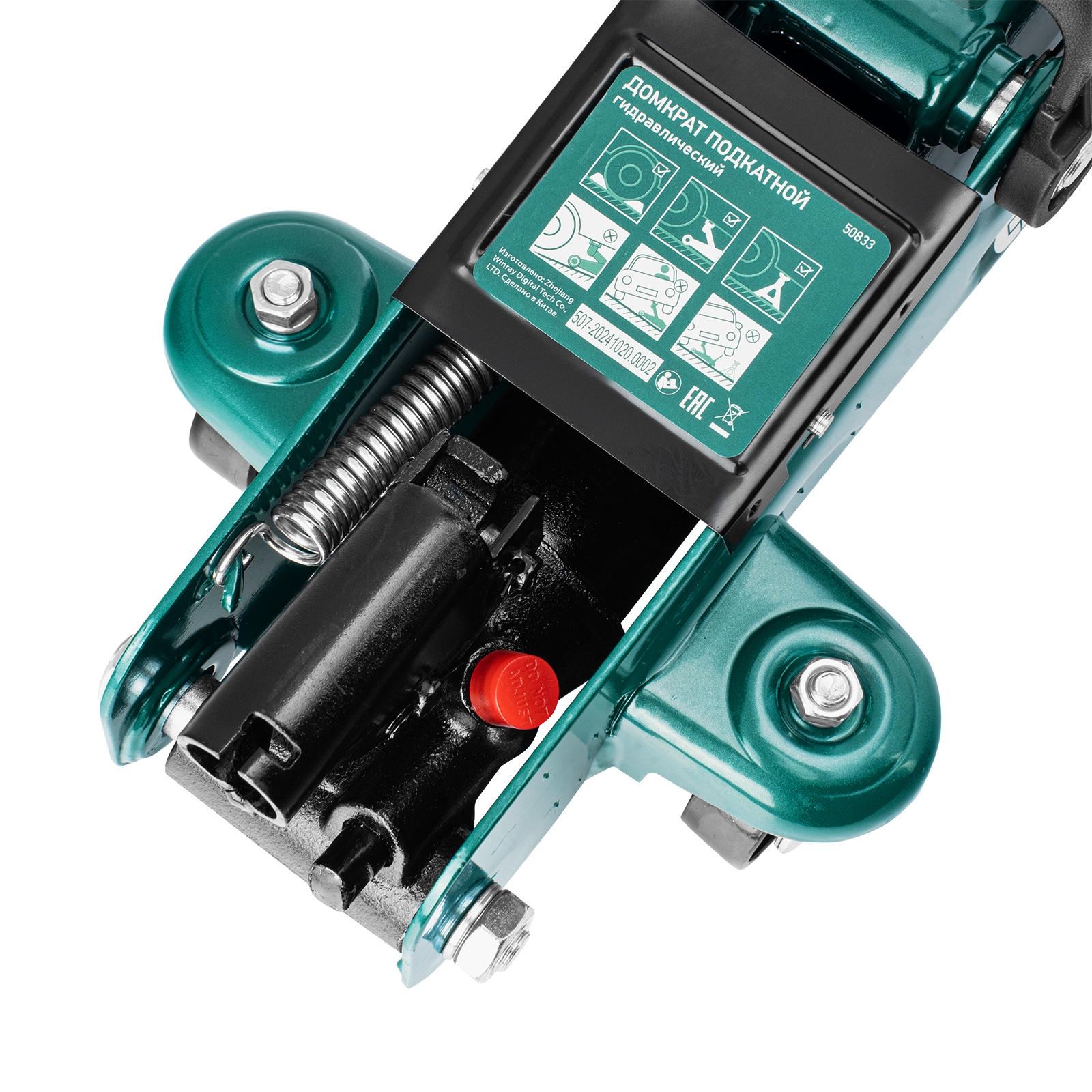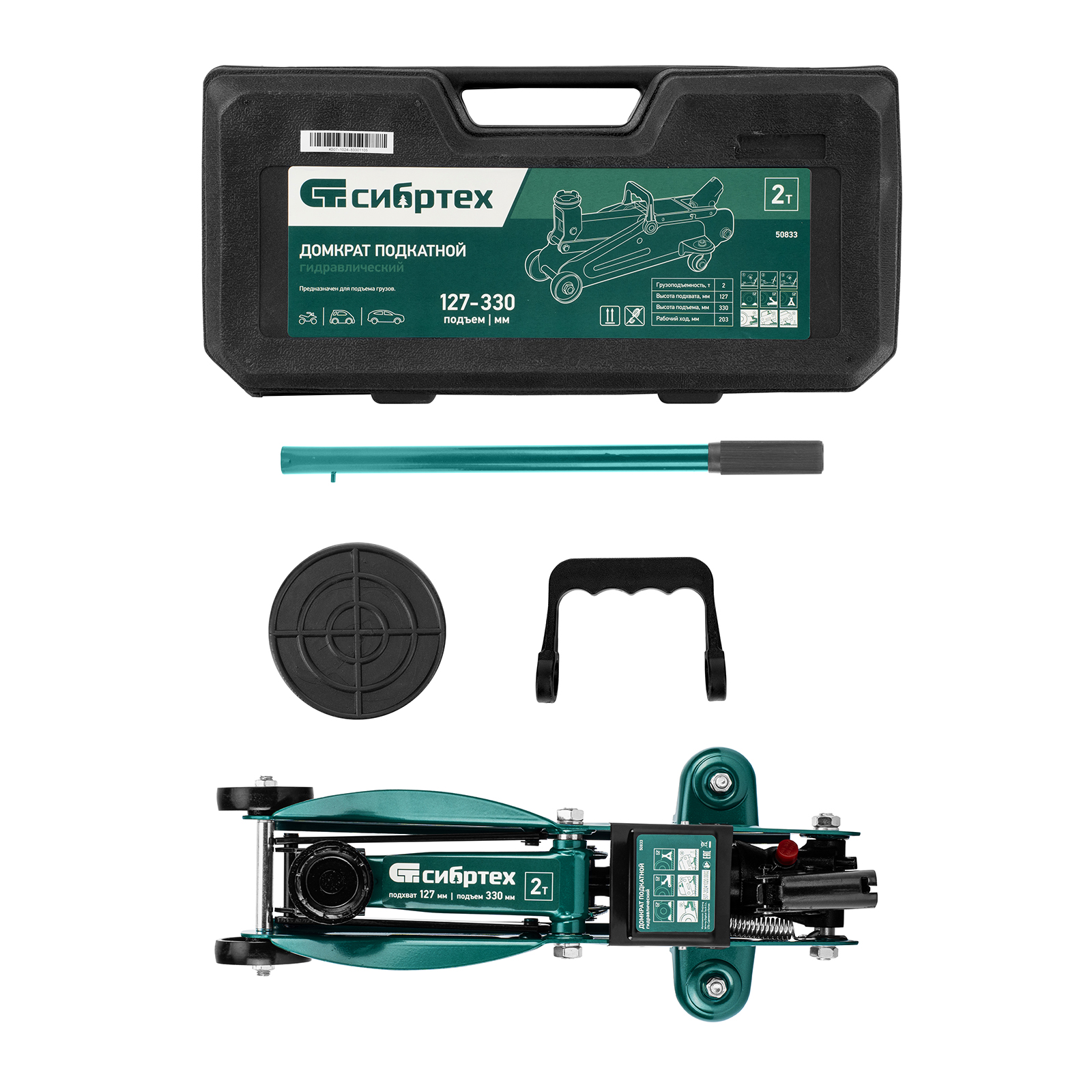 Гидравлический подкатной домкрат Сибртех 50833, поставляющийся в пластиковом кейсе, с высотой подхвата 127 мм, предназначен для подъема грузов массой до 2 т на высоту до 330 мм. Применяется для обслуживания автомобилей со стандартным клиренсом. Компактный домкрат подходит для самостоятельного использования автовладельцами.