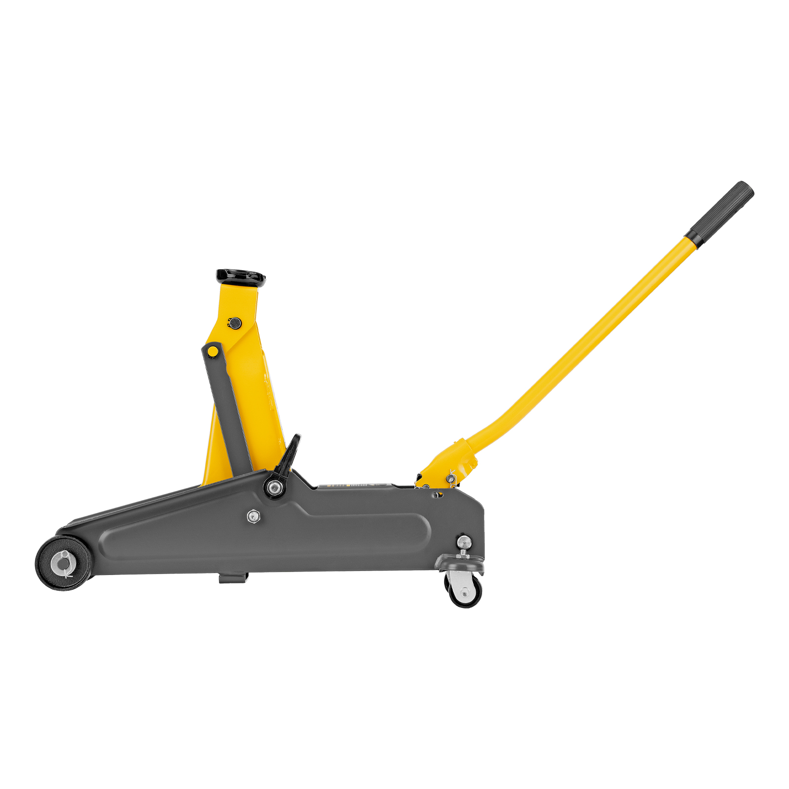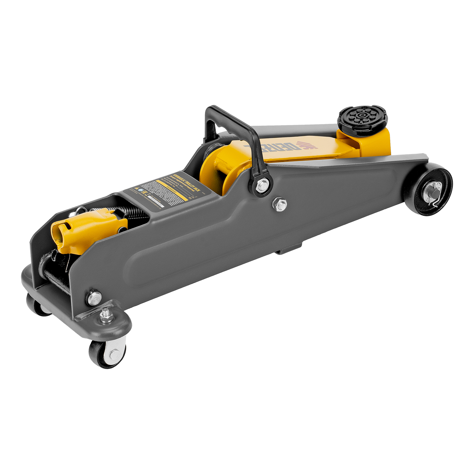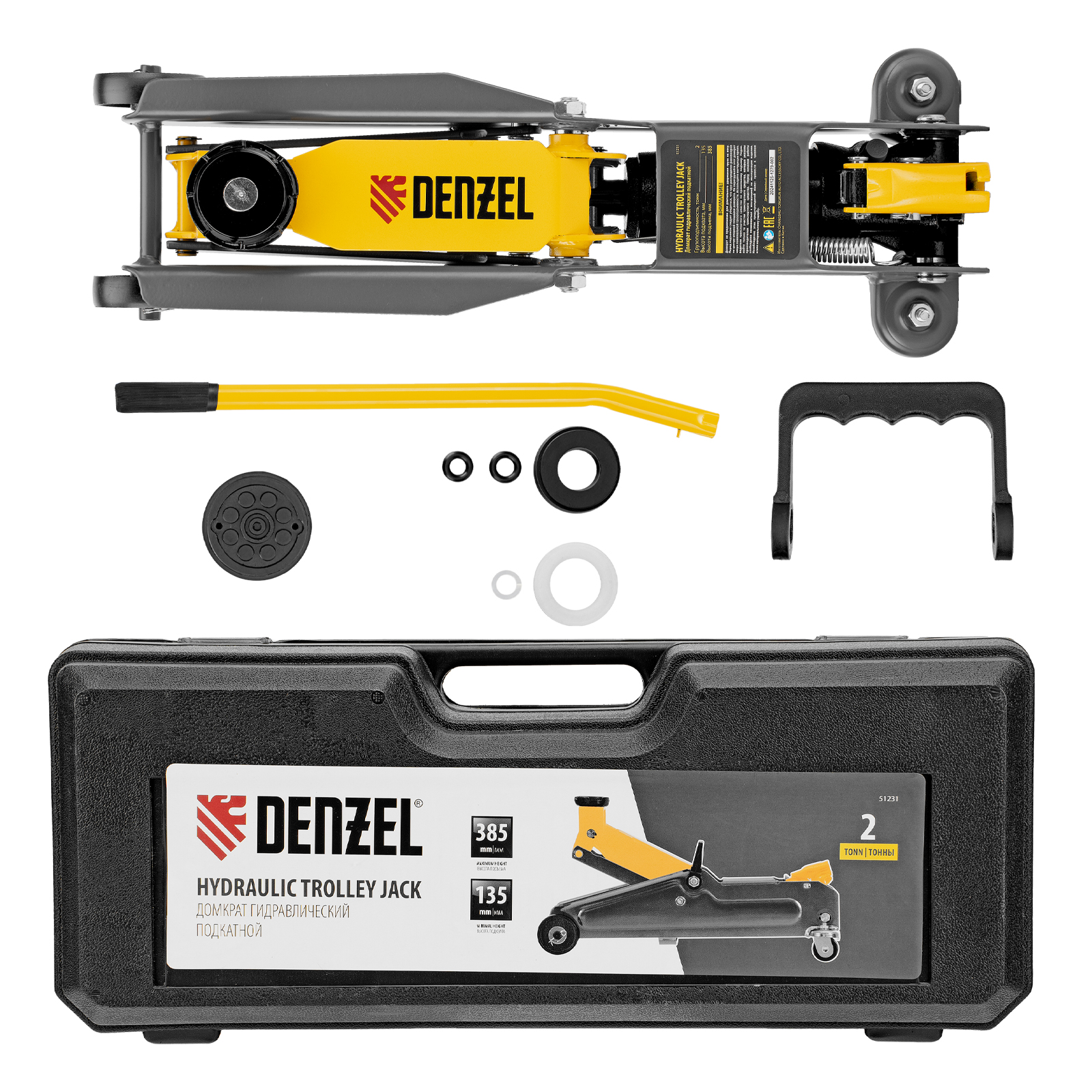 Гидравлический подкатной домкрат Denzel 51231 с высотой подхвата 135 мм, поставляющийся в пластиковом кейсе, предназначен для плавного подъема грузов массой до 2 т на высоту до 385 мм. Домкрат пригодится владельцам легковых автомобилей со стандартным клиренсом.