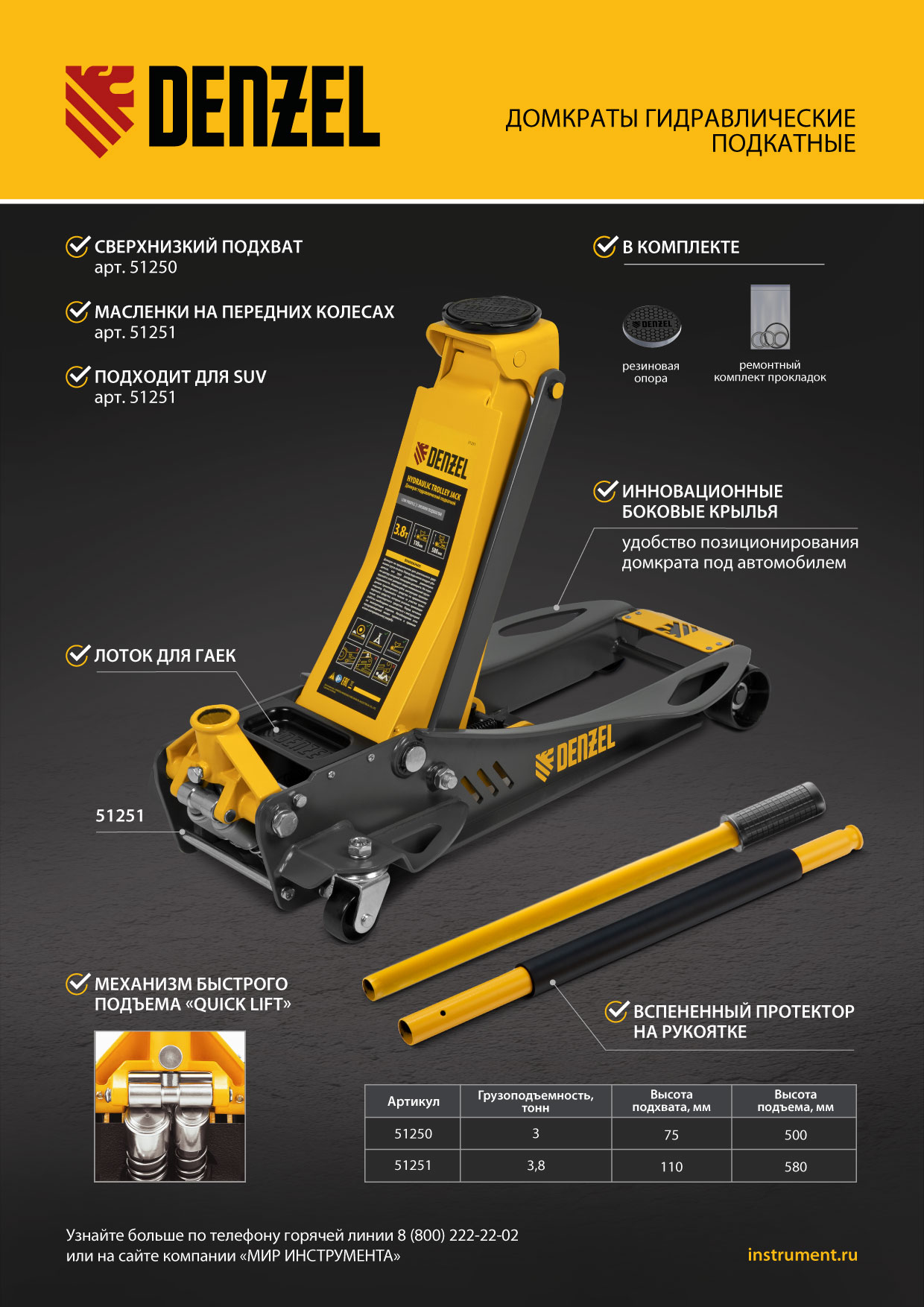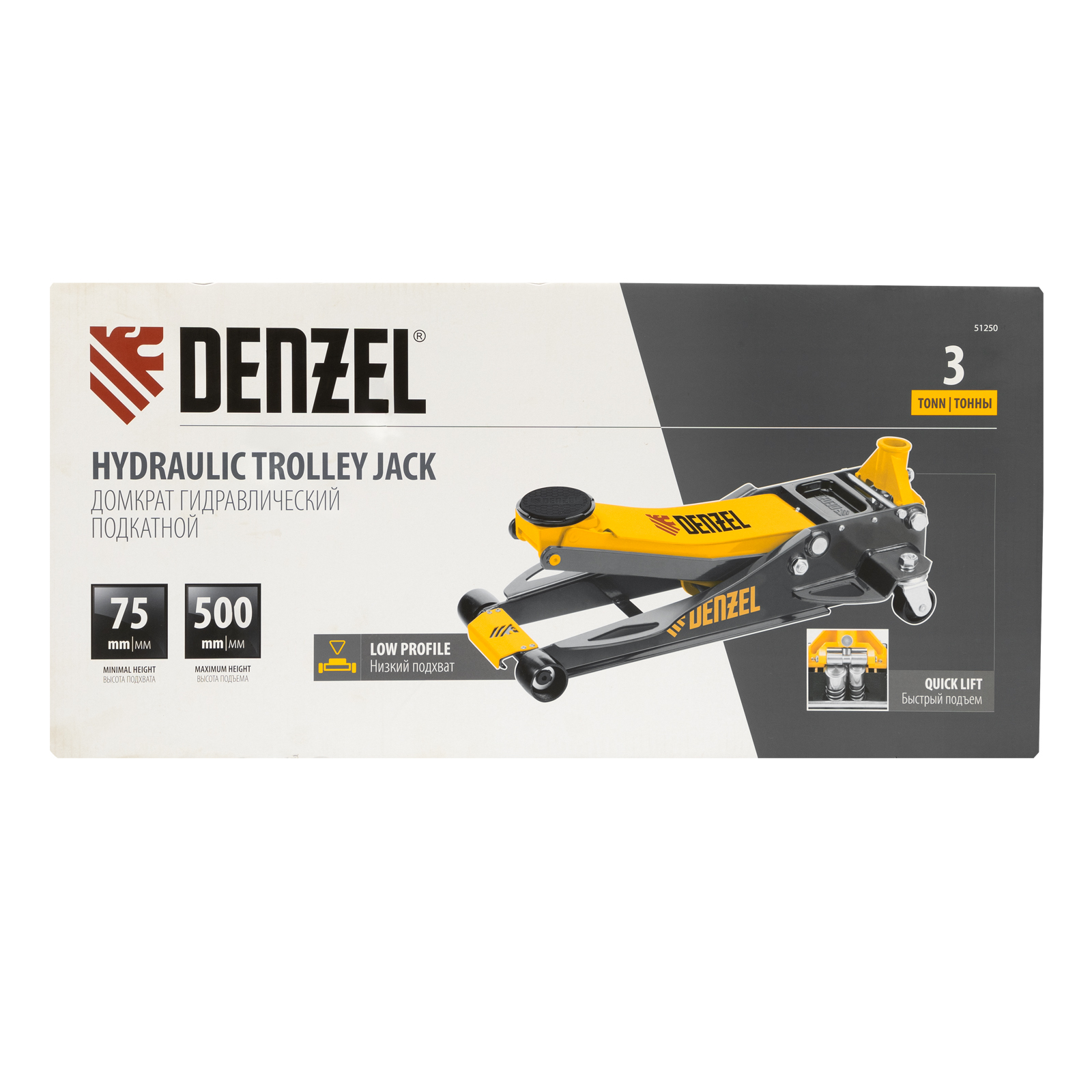 Профессиональный подкатной гидравлический домкрат Denzel 51250 с низким подхватом используется для быстрого подъема на высоту 75-500 мм всех типов автомобилей массой до 3 т и с любым клиренсом, в том числе сверхнизким. В гидравлическом блоке предусмотрено 2 насоса (система быстрого подъема QUICK LIFT), благодаря чему для достижения предельной высоты достаточно 6 качков рукоятки. Домкрат подходит для использования на станциях профессионального техобслуживания и шиномонтажа, а также для личного использования.