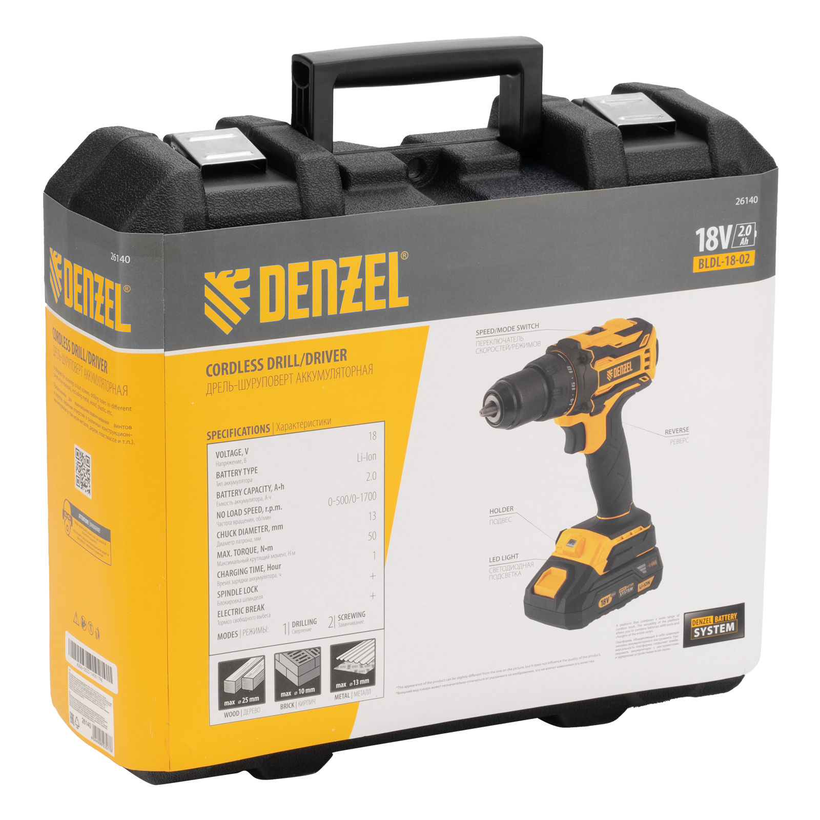 Аккумуляторная дрель-шуруповерт Denzel BLDL-18-02 26140 с бесщеточным двигателем предназначена для сверления отверстий, а также закручивания и откручивания резьбового крепежа. Максимальный диаметр отверстий в древесине составляет 25 мм, в металле — 13 мм. Величина крутящего момента достигает 50 А·ч, что позволяет эффективно решать поставленные задачи. Металлический патрон устойчив к длительным нагрузкам. Инструмент работает от аккумулятора Li-Ion с рабочим напряжением 18 В и емкостью 2 А·ч. Аккумулятор с интеллектуальной системой распознавания нагрузки и отсутствием эффекта памяти обеспечивает высокую продолжительность работы.
