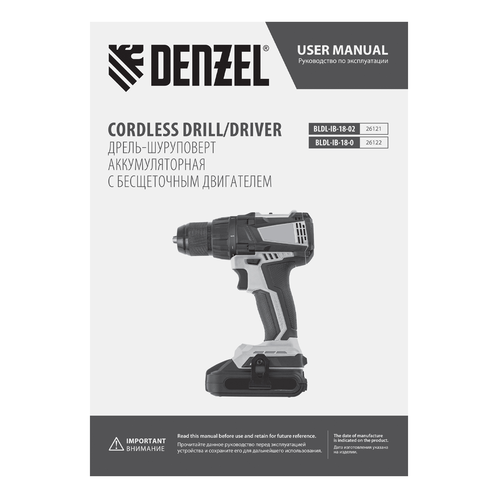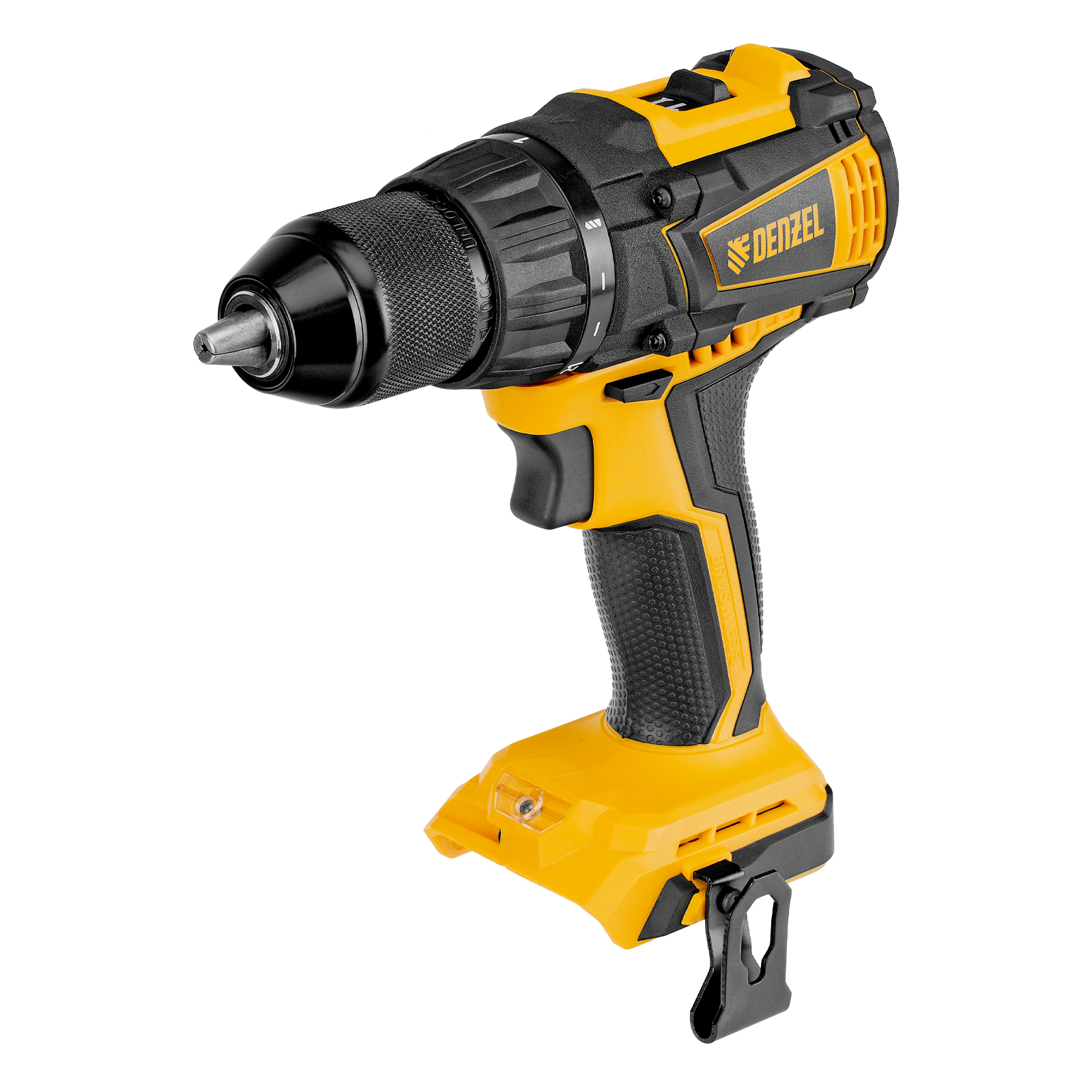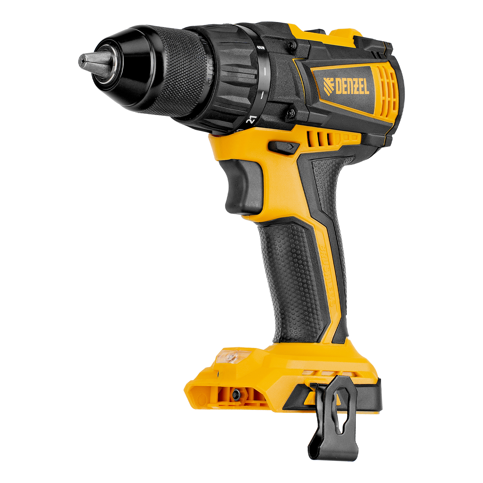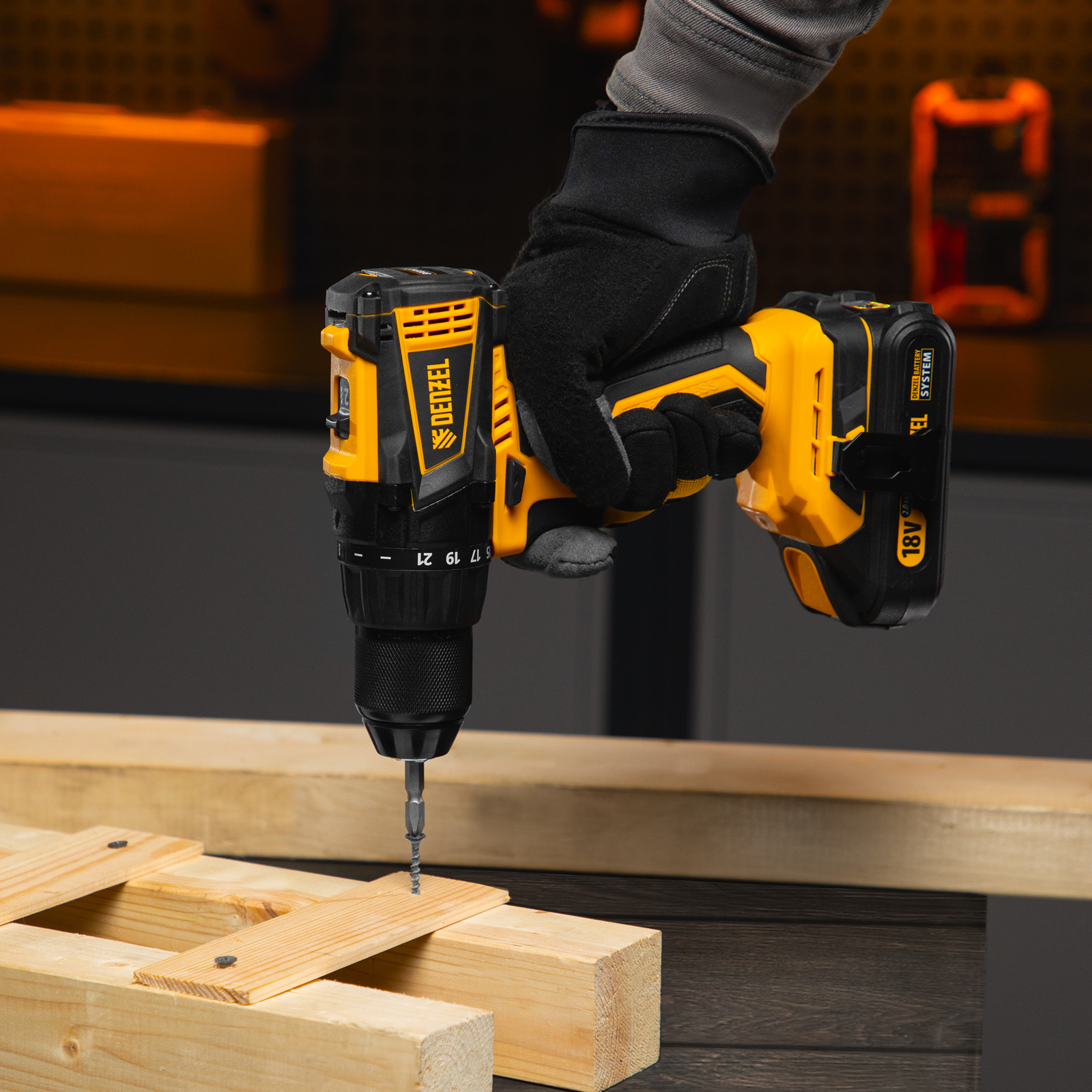 - Универсальность — дрель-шуруповерт совместима с любым Li-Ion аккумулятором и зарядным устройством единой платформы Denzel Battery System 18V.