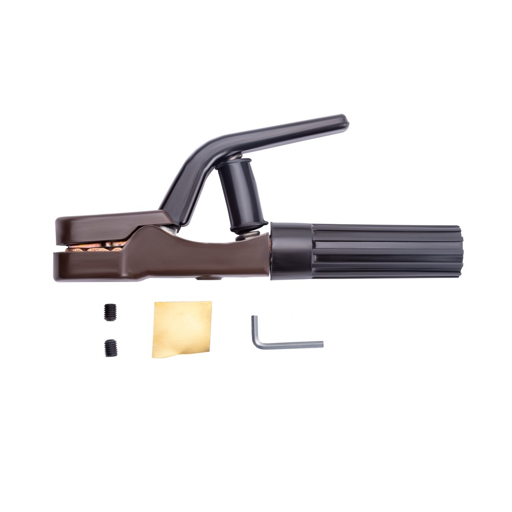 Электрододержатель Varteg EH-500A (основа зубчатых держателей сталь, покрытая медным токопроводящим сплавом) сделан из износостойких, термически стойких и прочных материалов. Область обхвата держателя ладонью сварщика имеет надёжную электроизоляцию. Покрытый электрод, имеющий основное, рутиловое или целлюлозное покрытие, надёжно фиксируется при помощи мощного пружинного механизма. Механизм держателя позволяет зафиксировать сварочный электрод под углами 45°, 90°, 135°, 180°. К электрододержателю подсоединяют медный сварочной провод сечением 60 мм, алюминиевый омеднённый кабель (CCA) диаметром 95 мм. Сила фиксации электрода составляет до 25 кг/см².ПРЕИМУЩЕСТВА:Простая, удобная и надёжная конструкцияМощный зажимной механизмНадёжная фиксация сварочного кабеляВозможность фиксации электрода в разных пространственных положениях