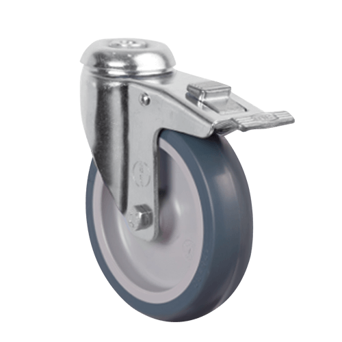 Аппаратное колесо ER04 MKT 125 F предназначено для установки на торговые, медицинские, лабораторные, гостиничные тележки и прочее передвижное оборудование, которое используется в условиях повышенных санитарных требований. Обод в модели изготовлен из прочного полипропилена, шинка — из серой резины. Диаметр колеса составляет 125 мм, максимальная нагрузка — 90 кг.