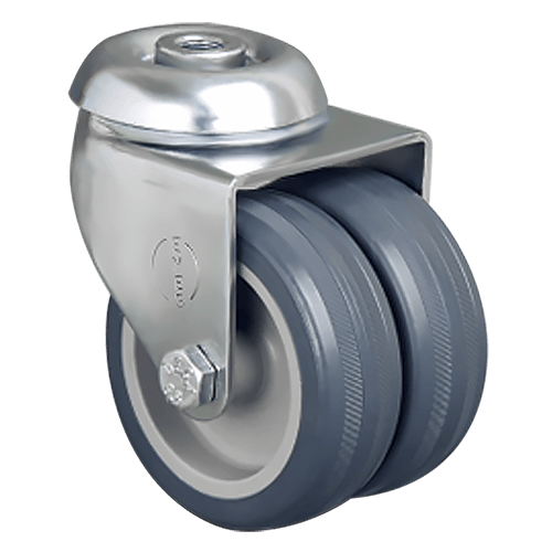 Данная сдвоенная аппаратная колесная опора предназначена для установки на торговое оборудование, больничную мебель, медицинскую аппаратуру и т. п. Контактный слой выполнен из серой резины, кронштейн — из оцинкованной стали. Модель имеет диаметр 50 мм, работает в температурном диапазоне от -20 до +60 °С. Грузоподъемность составляет 55 кг.