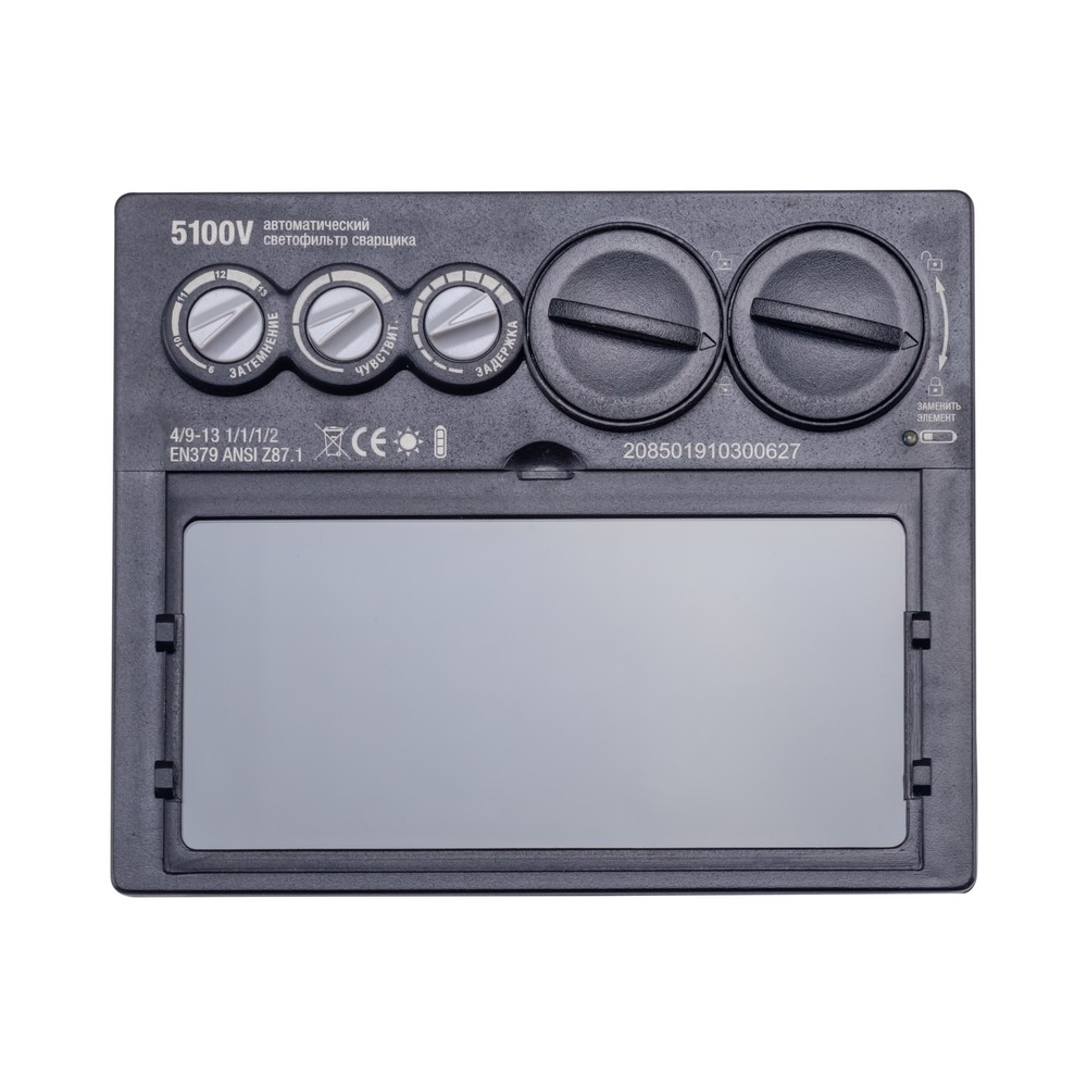 Автоматический светофильтр сварщика — это средство защиты нового поколения, использующее современные достижения и разработки. Светофильтр 5100V оборудован дополнительными возможностями. Регулировки чувствительности, задержки открытия и степени затемнения сделаны плавными, позволяющими установить любую необходимую величину. Помимо этого, изменена схема питания — добавлен дополнительный литиевый элемент, причем оба литиевых элемента теперь легко заменить в любое время, что делает эксплуатацию практически неограниченной по сроку службы. Даже неисправный светофильтр – «хамелеон» обеспечивает постоянную защиту от УФ/ИК излучений благодаря постоянному фильтру (защита основана на частичном отражении лучей). В отличие от обычных пассивных тёмных стёкол, данный светофильтр позволяет видеть область сварки перед поджигом дуги, что освобождает руки, не требует поднятия или опускания сварочной маски, исключает случайное облучение из-за раннего поджига дуги, обеспечивает более точное позиционирование электрода или горелки. Таким образом, существенно увеличивается производительность и повышается качество сварочных работ. Изделия выполнены в соответствии с требованиями ЕС к индивидуальному защитному оборудованию (89/686/EC) и отвечают самым строгим европейским стандартам EN 379.РЕГУЛИРОВКА СТЕПЕНИ ЗАТЕМНЕНИЯ: Светофильтр имеет функцию плавной регулировки степени затемнения в диапазоне от 9 до 13 DIN. В зависимости от типа сварки или резки, величины тока и внешней освещенности можно точно установить комфортное затемнение для глаз.2 ОПТИЧЕСКИХ ДАТЧИКА: Независимые фотодатчики мгновенно срабатывают при появлении сварочной дуги и поддерживают закрытое состояние светофильтра даже тогда, когда один из датчиков перекрыт каким-либо препятствием. Повышенная чувствительность сенсоров даёт исключительную стабильность обнаружения дуги. Светофильтр оснащён двумя независимыми датчиками, что гарантирует срабатывание даже в том случае, если один из них будет закрыт.КОМБИНИРОВАННОЕ ПИТАНИЕ: Основное питание управляющей электроники светофильтра осуществляется солнечной батареей от света сварочной дуги, а дополнительные элементы питания внутри светофильтра обеспечивают вспомогательное питание при начале сварки.ЗАЩИТА ОТ УФ/ИК ИЗЛУЧЕНИЯ: Максимальная постоянная защита от невидимого УФ/ИК излучения дуги гарантирует защиту органов зрения даже при вышедшей из строя управляющей электроники или разряженных элементов питания за счёт зеркального защитного слоя. 2 независимых фотодатчика мгновенно срабатывают при возникновении сварочной дуги и поддерживают закрытое состояние, даже если один из датчиков перекрывается каким-либо препятствием. Повышенная чувствительность сенсоров дает исключительную стабильность обнаружения дуги.ПРЕИМУЩЕСТВА:Регулировка степени затемнения (9 – 13 DIN)Плавная регулировка чувствительностиРегулировка задержки открытияКомбинированное питание со сменными элементами2 независимых фотодатчикаМаксимальная постоянная защита от невидимого УФ/ИК до DIN 16Светофильтр соответствует современным стандартам качества EN379 и ANSI Z 87.1