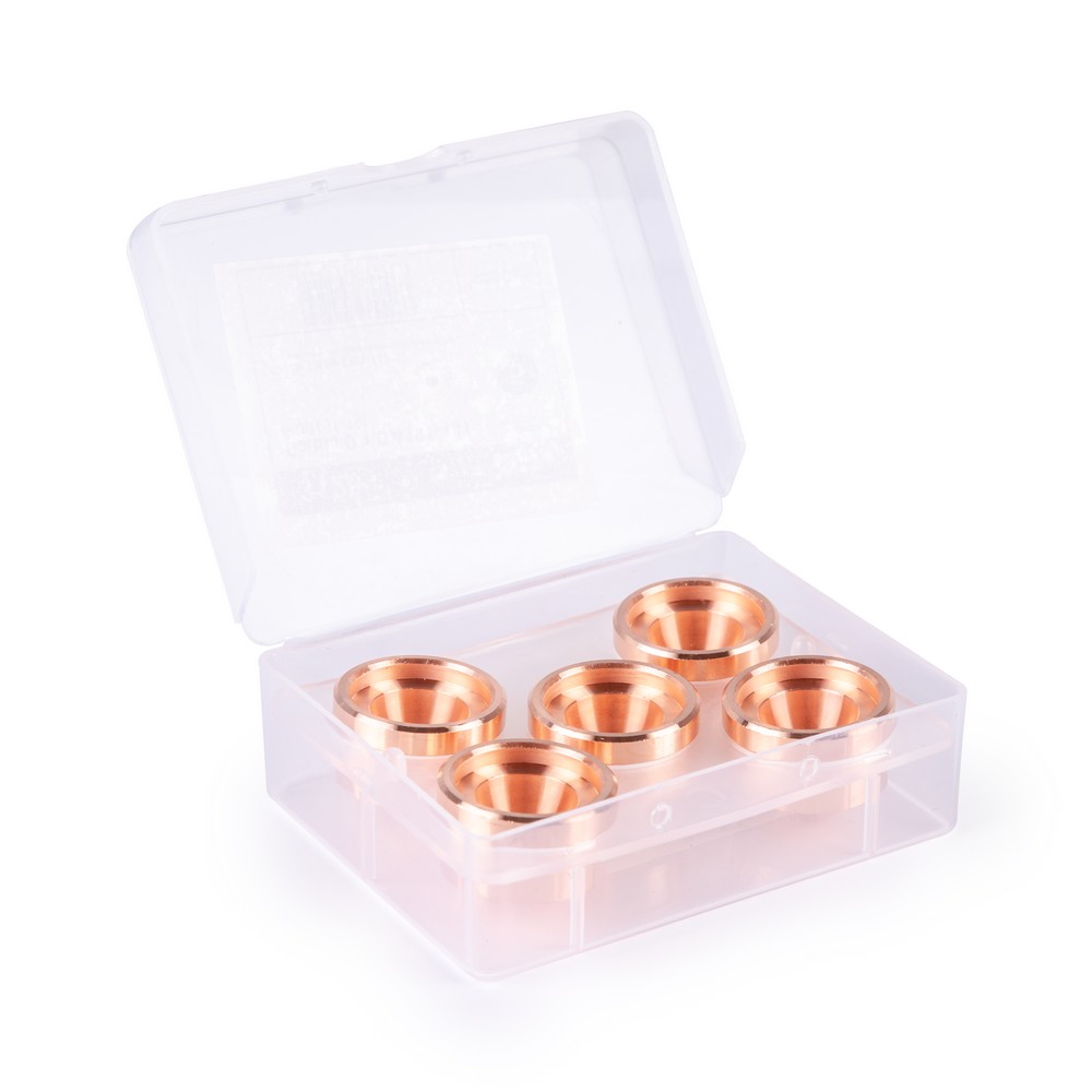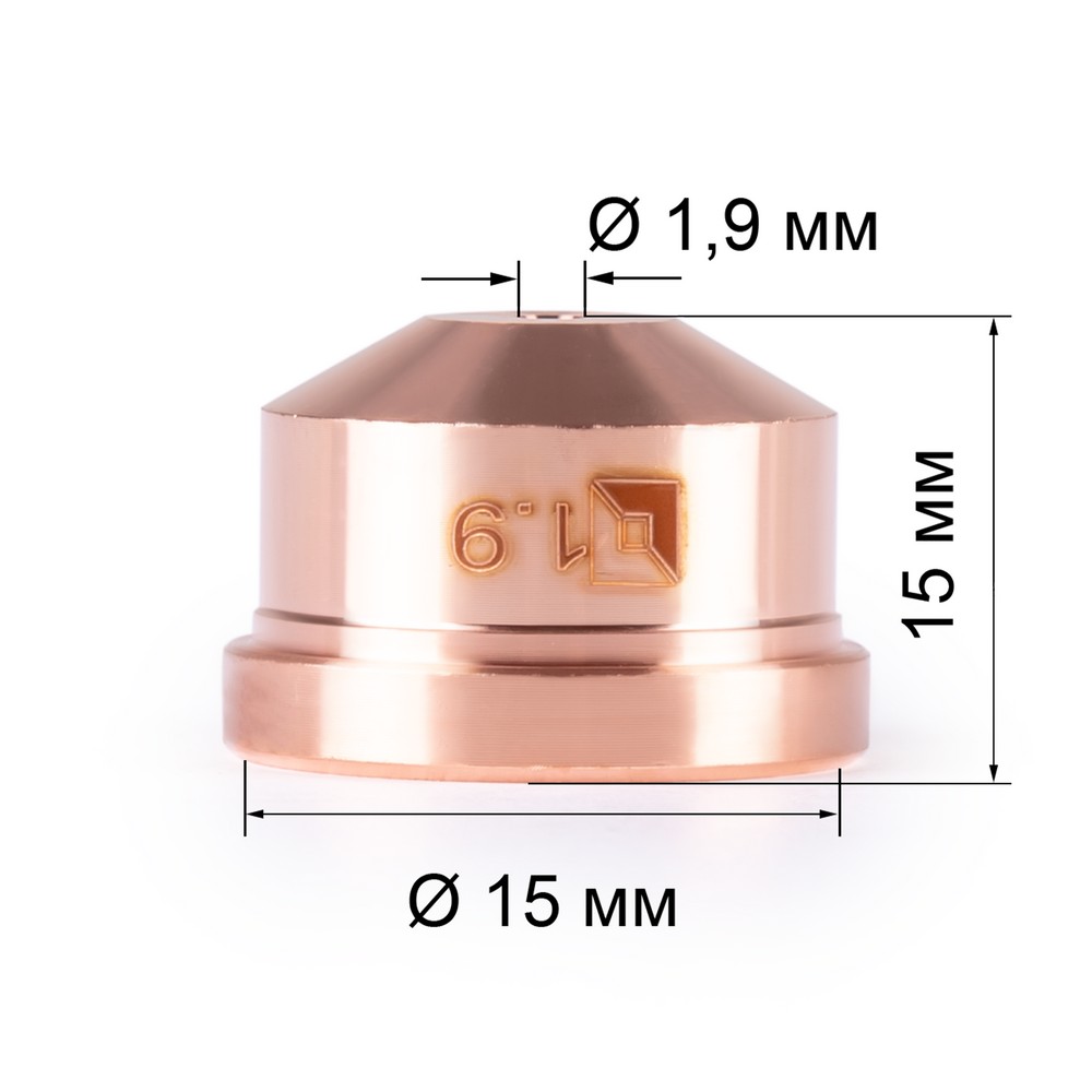 Сопло D 1,9 служит для создания плазменной дуги в потоке защитного газа. Ключевая особенность этой части резака — высокая точность реза, обусловленная оптимальным соотношением между формой и диаметром отверстия. Обеспечить длительный срок эксплуатации сопла помогло применение высокопрочного медного сплава. Данный комплектующий элемент плазмотрона разработан в расчете на использование в длительном режиме эксплуатации на производстве.