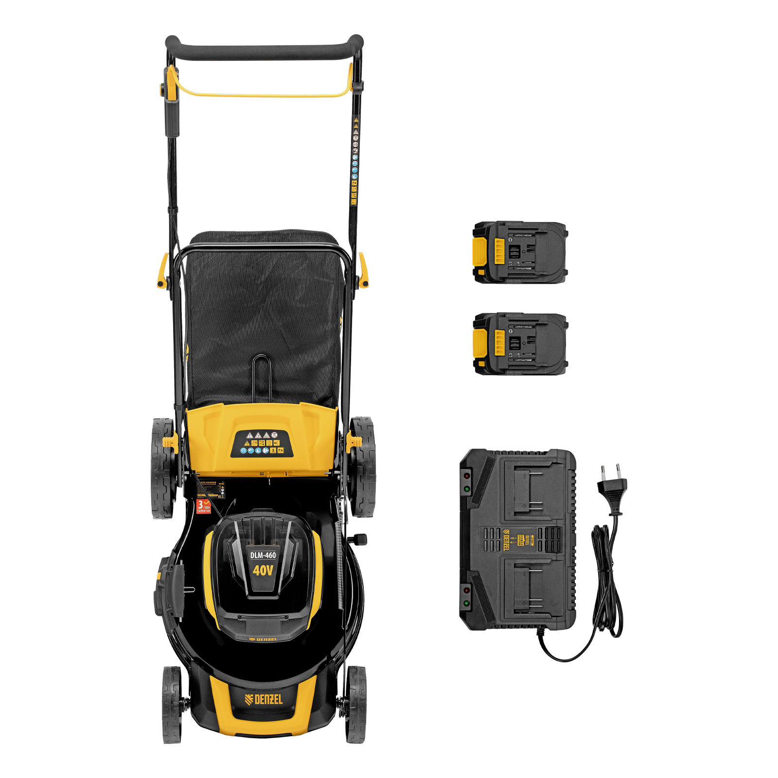 Газонокосилка в сборе с ножом и колесами - 1 штАккумуляторная батарея Denzel Power System - 2 штЗарядное устройство - 1 штТравосборник - 1 штВерхняя часть рукоятки - 2 штФиксаторы рукоятки - 2 штБолт для фиксатора рукоятки - 2 штШайба для фиксатора рукоятки - 2 штКлипса для провода - 2 штДефлектор бокового выброса - 1штЗаглушка для мульчирования - 1 штРуководство по эксплуатации c гарантийным талоном - 1 шт |