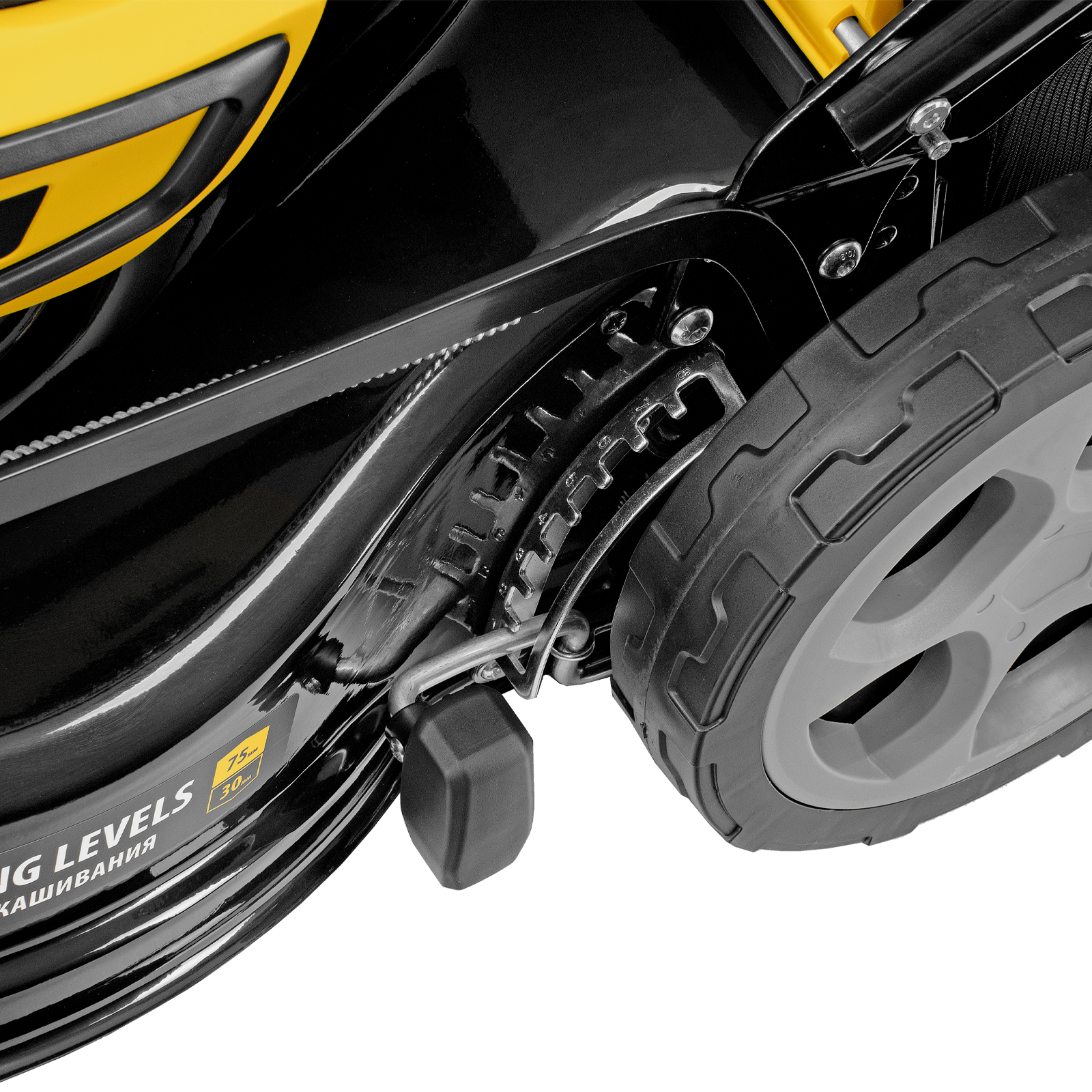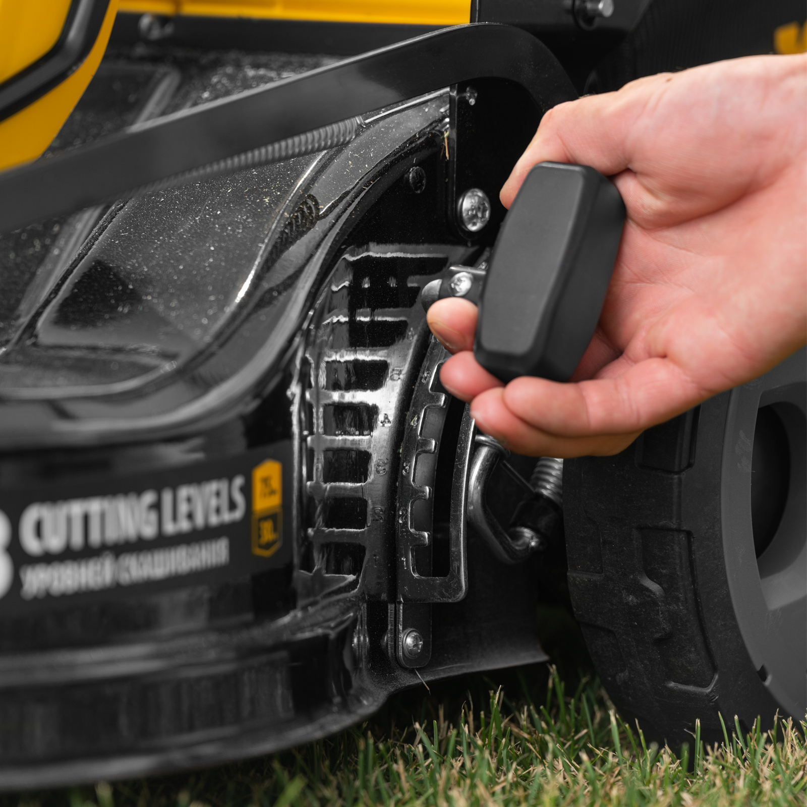 - 3 режима работы — можно выбрать сбор в травосборник, боковой выброс или мульчирование (измельчение травы и равномерное распределение ее по участку).