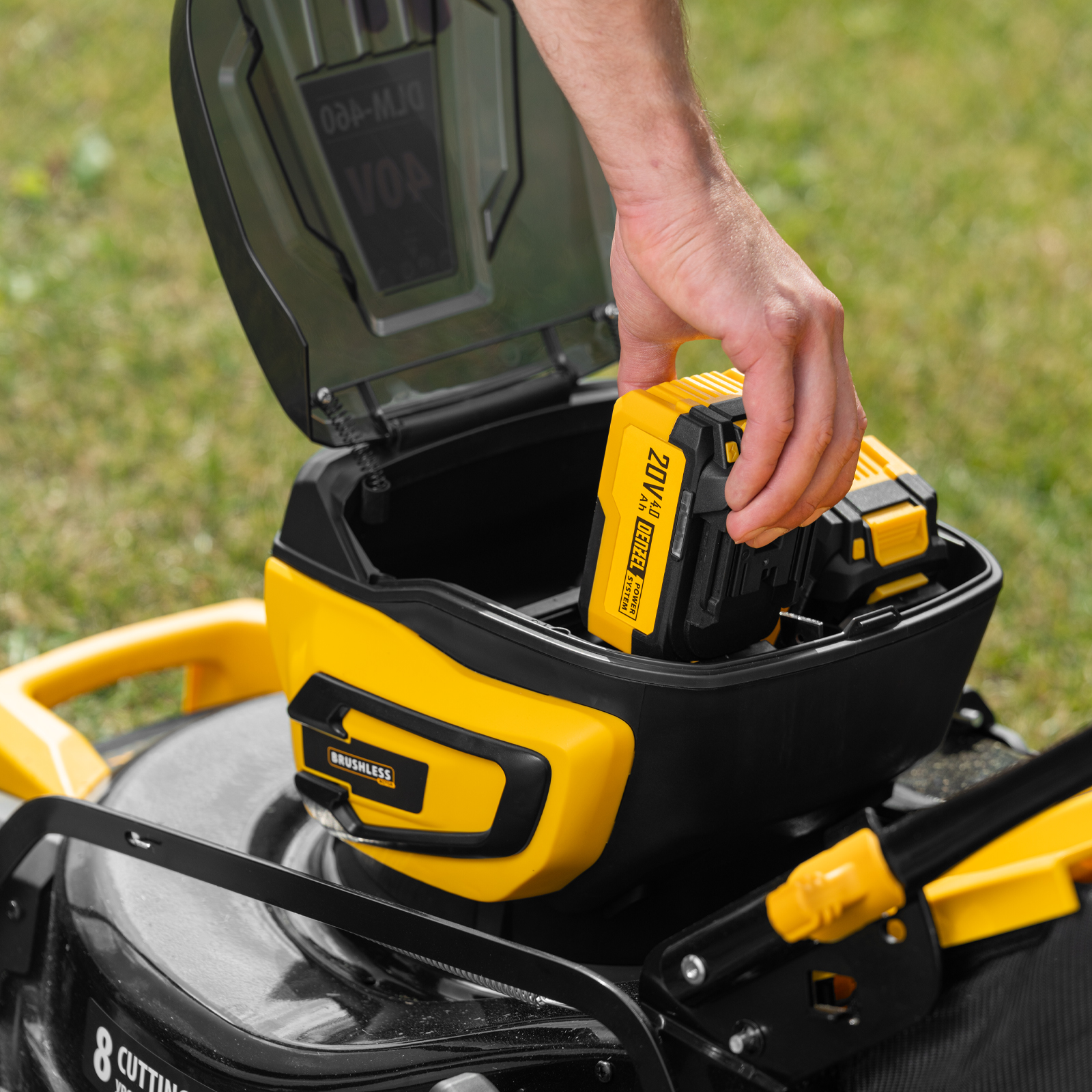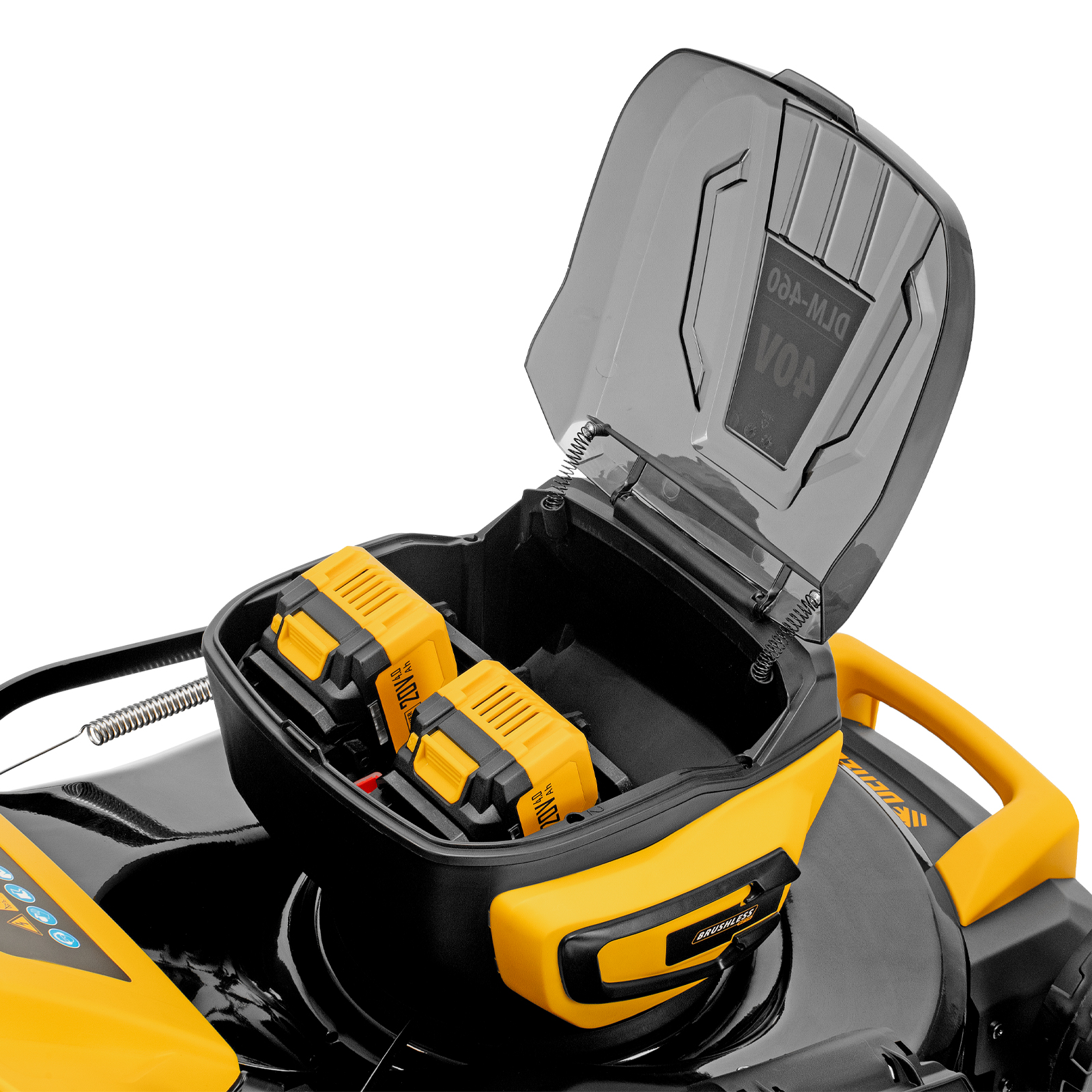 - Длительная работа без подзарядки — в аккумуляторный отсек можно установить 4 батареи: когда одна пара разрядится, косилка продолжит работать, питаясь от двух оставшихся аккумуляторов.