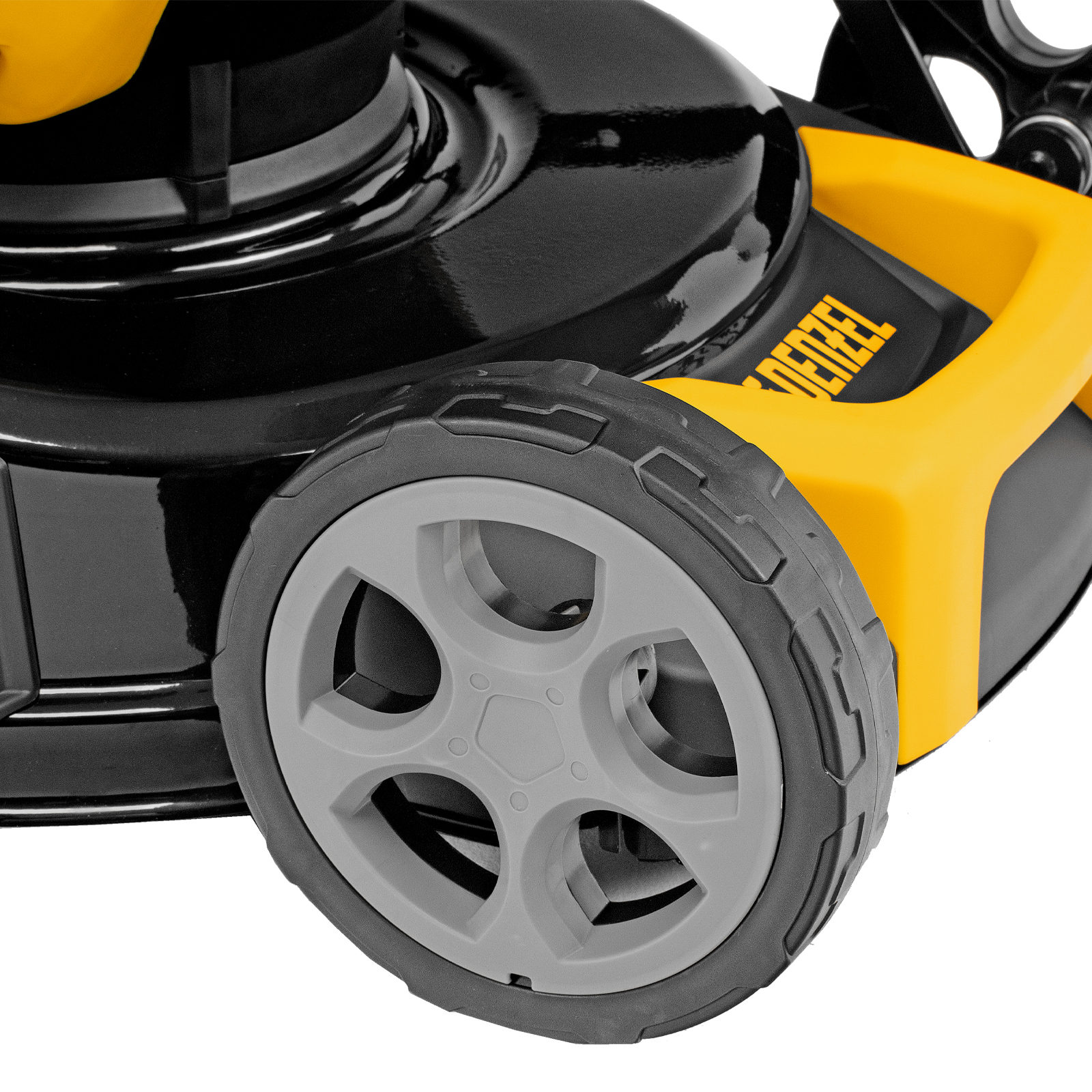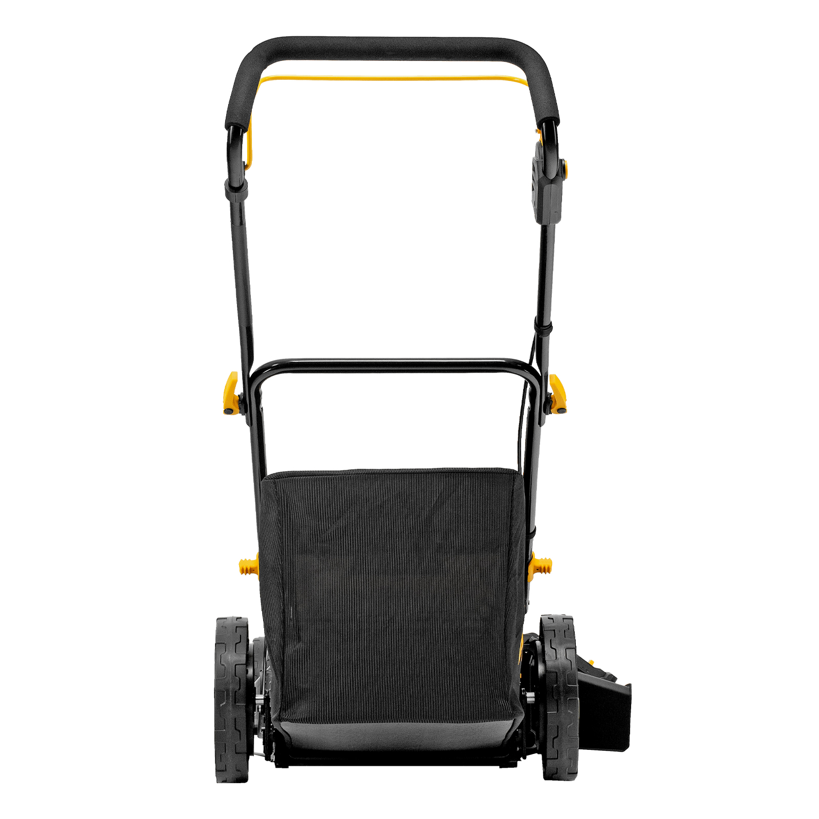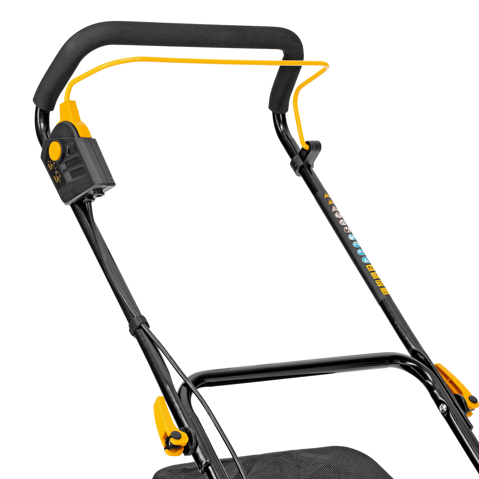 - Продуманная конструкция — производитель предусмотрел транспортировочную рукоятку для удобного перемещения косилки.