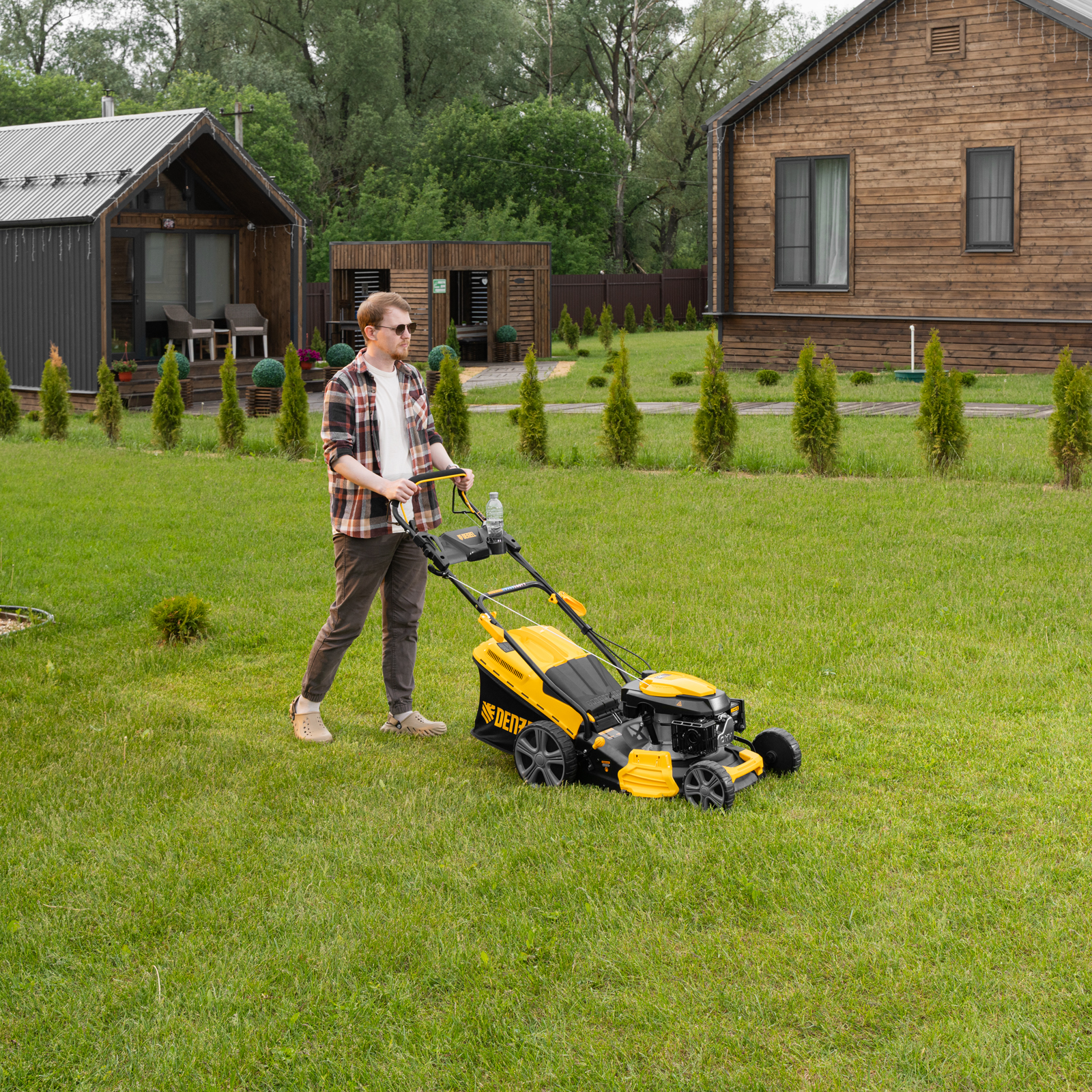 Двигатель Denzel обеспечивает высокую скорость вращения ножа 3000 об/мин, разумно потребляя топливо. Одного бака хватает на 40-60 минут работы. Ширина скашивания травы за один проход составляет 46 см — таким образом, за 1,5 часа Вы обработаете около 2500 м2. Косилка формирует газон высотой от 25 до 75 мм. Всего доступно 7 уровней скашивания, поэтому можно создать как спортивную площадку, так и элитный партерный газон.