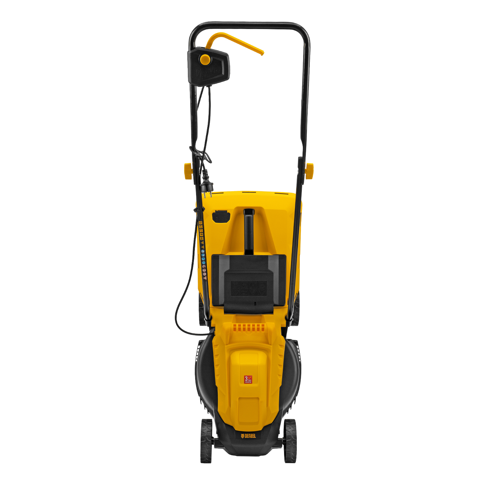 - Безопасность — функция блокировки исключает случайный запуск двигателя, а держатель кабеля предотвращает отключение техники от сети и уменьшает риск попадания провода под нож.