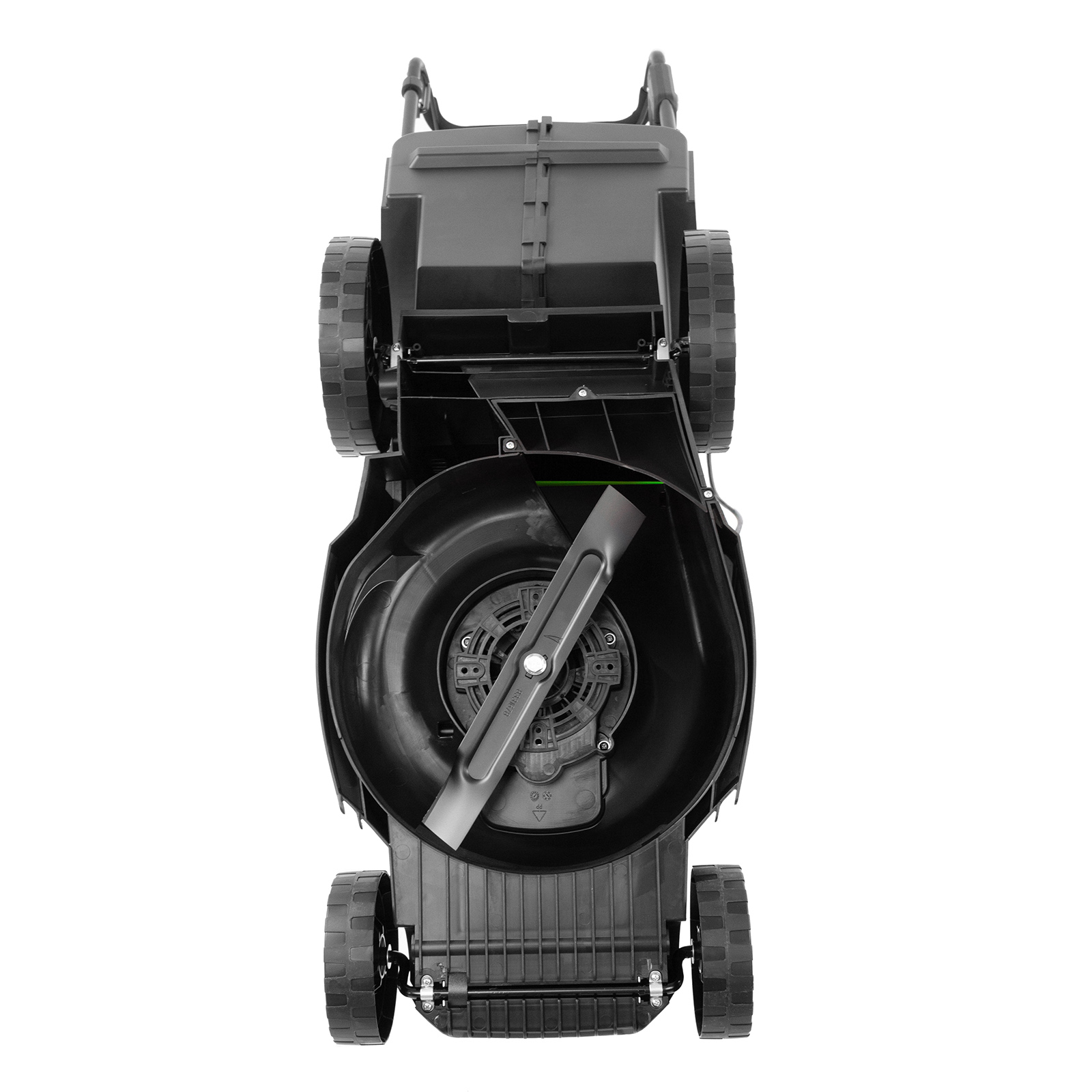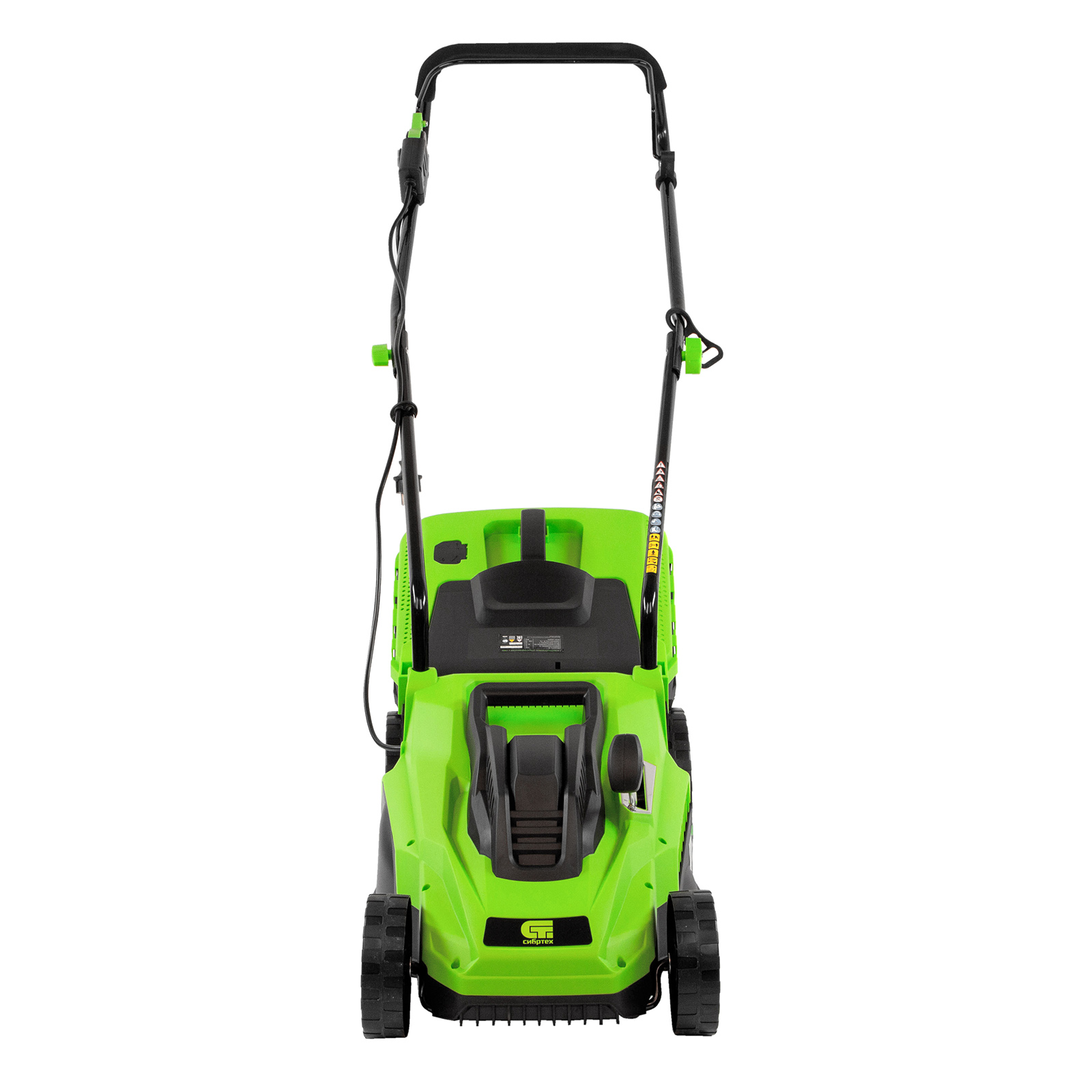 - Комфортная эксплуатация — для управления используется скоба, а не рычаг, как на большинстве электрокосилок, что делает работу удобной, особенно для левшей.