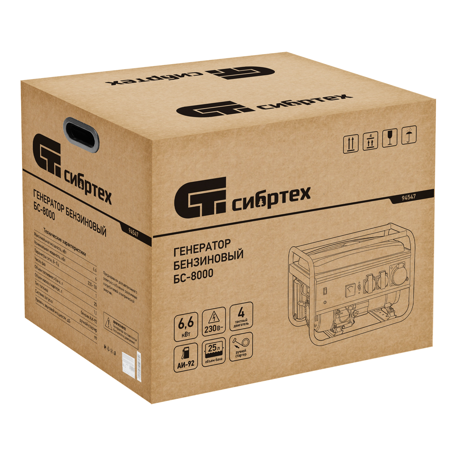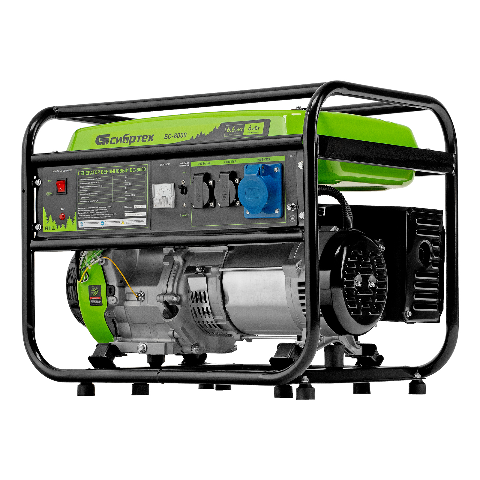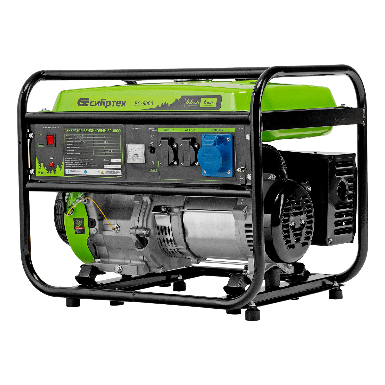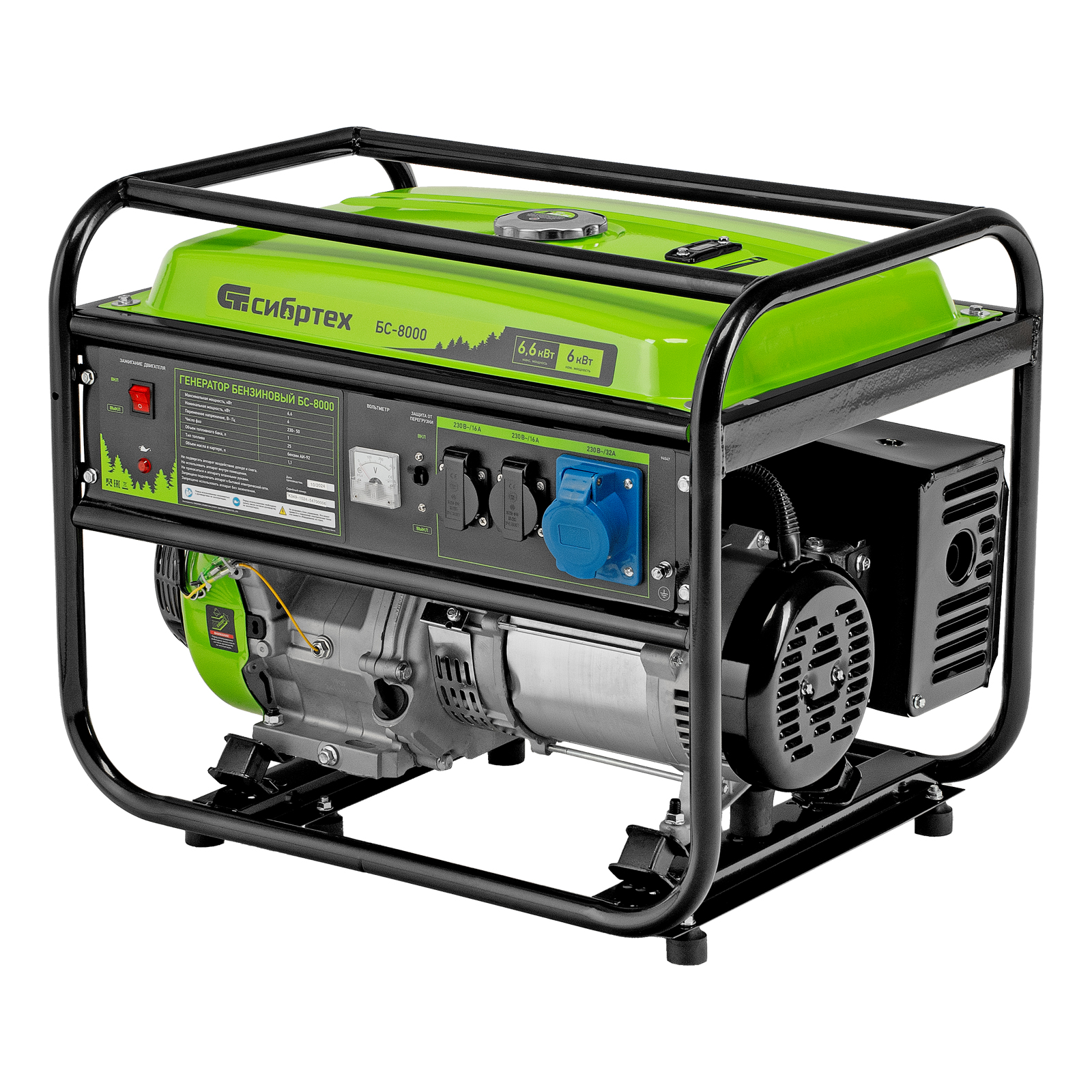 Генератор бензиновый БС-8000, 6,6 кВт, 230В, четырехтактный, 25 л, ручной стартер Сибртех в Воронеже