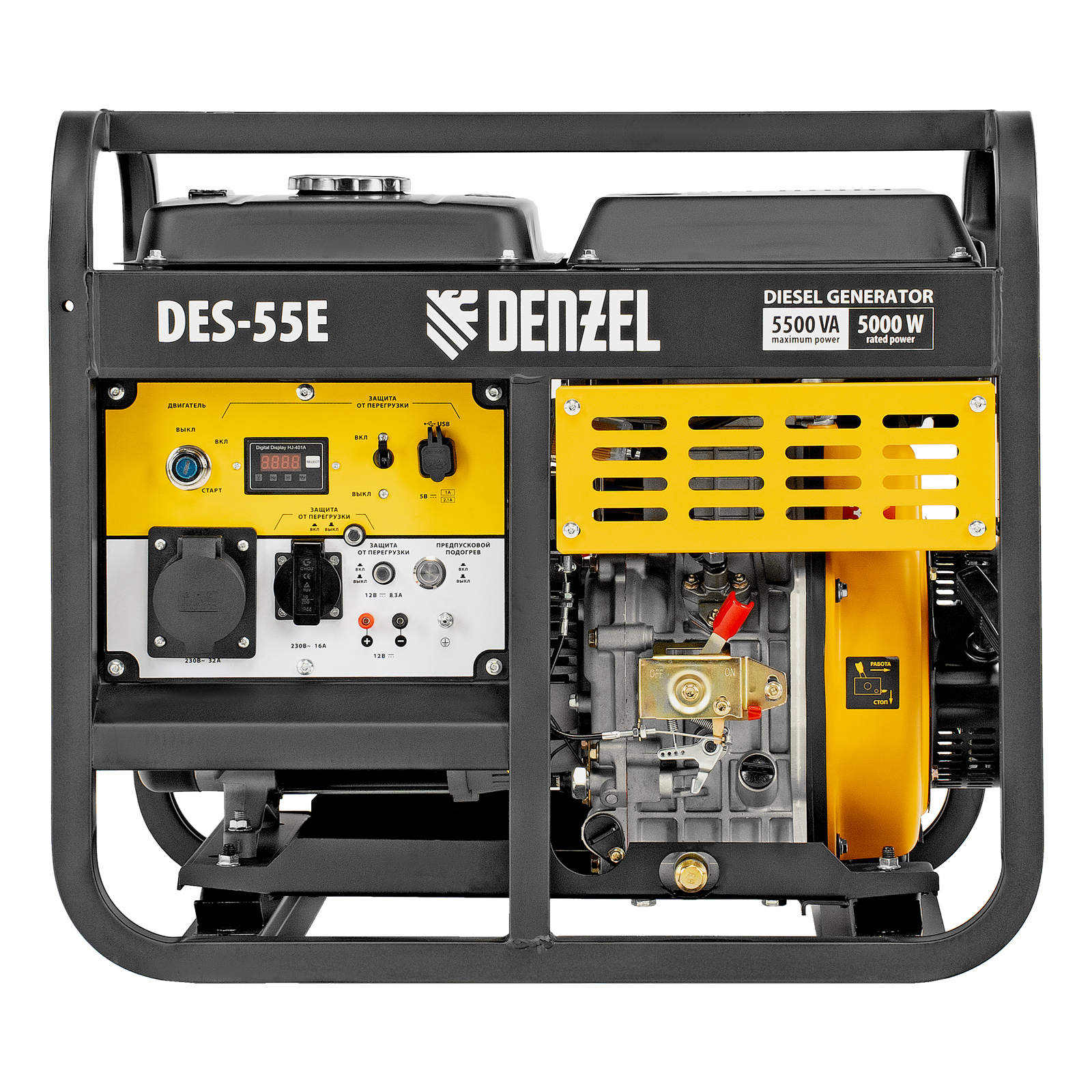 Генератор дизельный Denzel DES-55E 94414 с объемом топливного бака 11 л, с электростартером, имеет максимальную выходную мощность 5,5 кВт и поддерживает напряжение в сети 230 В. Используется для снабжения энергией потребителей однофазного тока (осветительных приборов, бытовой техники, электроинструмента) при отсутствии доступа к стационарному источнику питания. Для подключения электроприборов служат 2 розетки: 230 В/16 А и 230 В/32 А. Клеммы постоянного тока 12 В позволяют заряжать автомобильные аккумуляторы, а двойной выход USB 5 В предназначен для подключения мобильных устройств (планшетов, смартфонов и т. д.). Генератор пригодится в загородном доме.