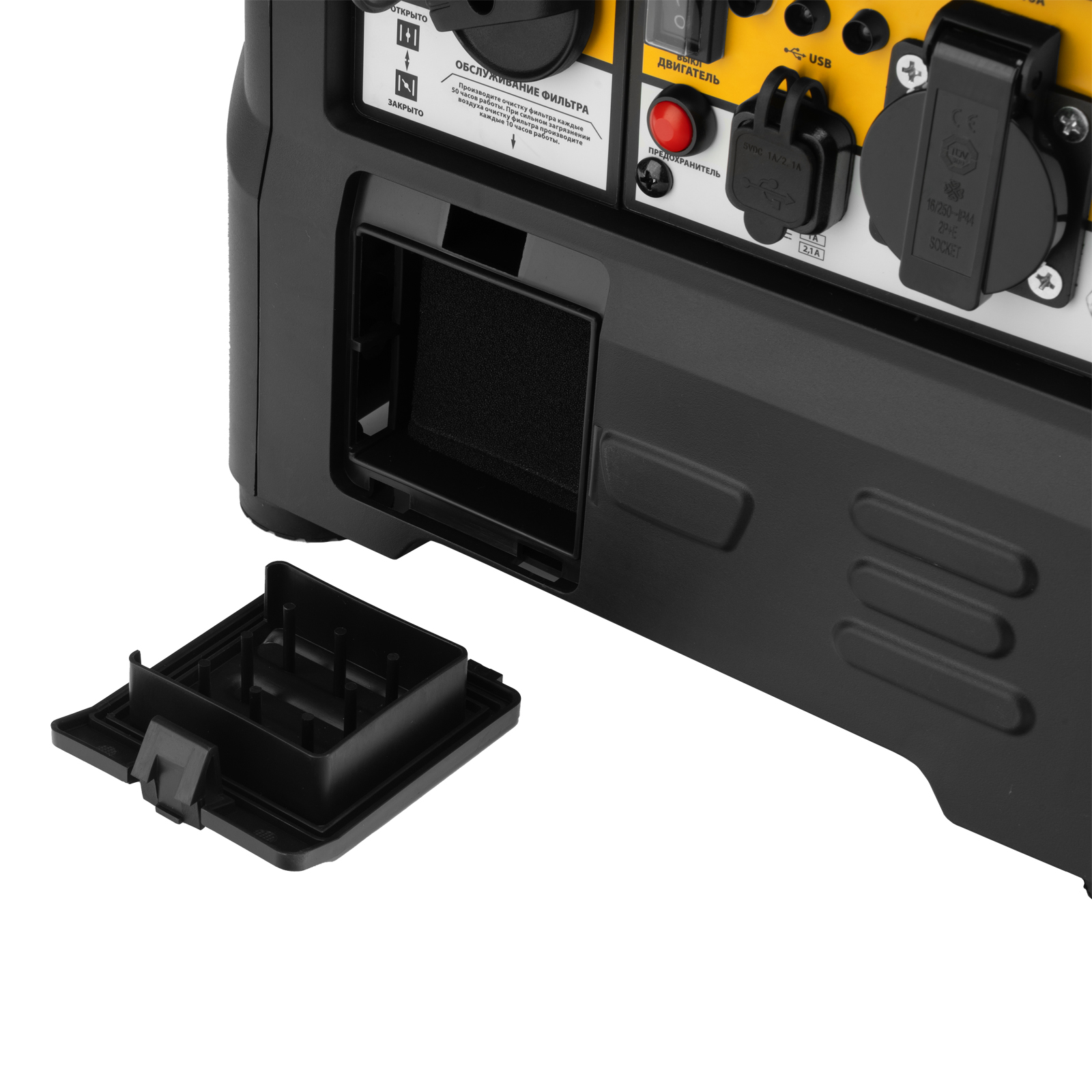 - Удобная транспортировка — в верхней части корпуса предусмотрена рукоятка для перемещения генератора.